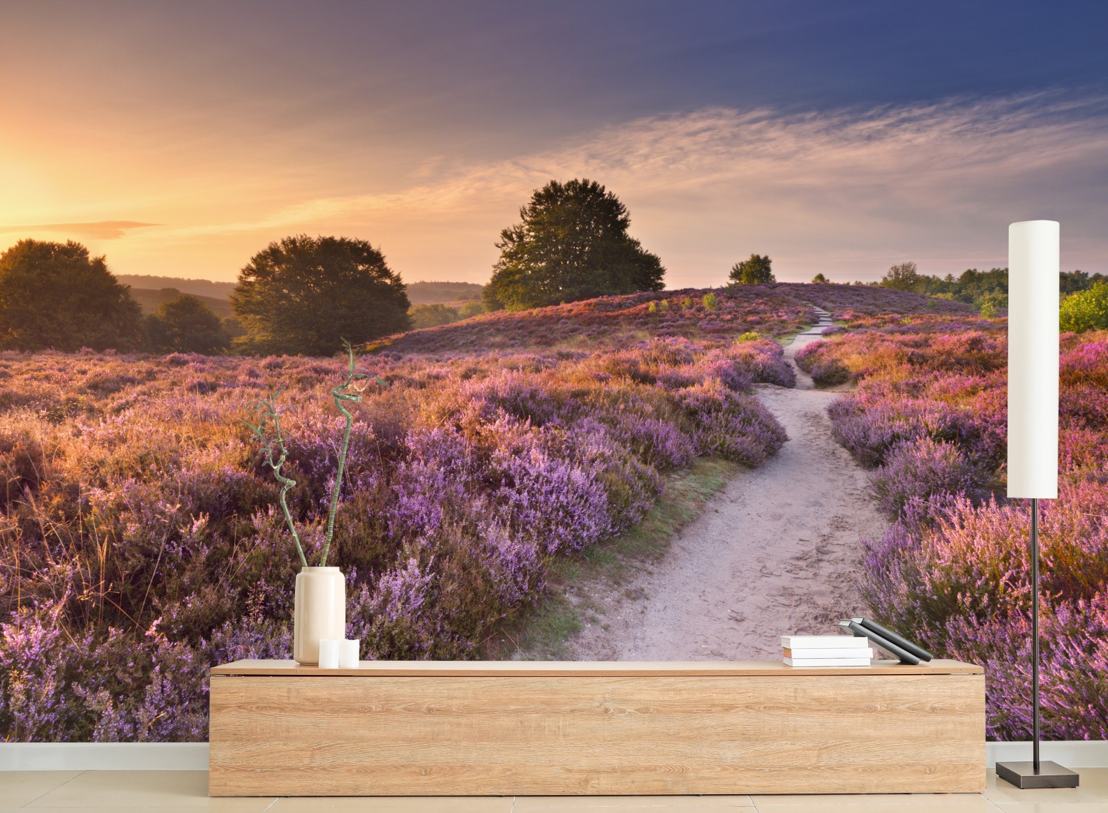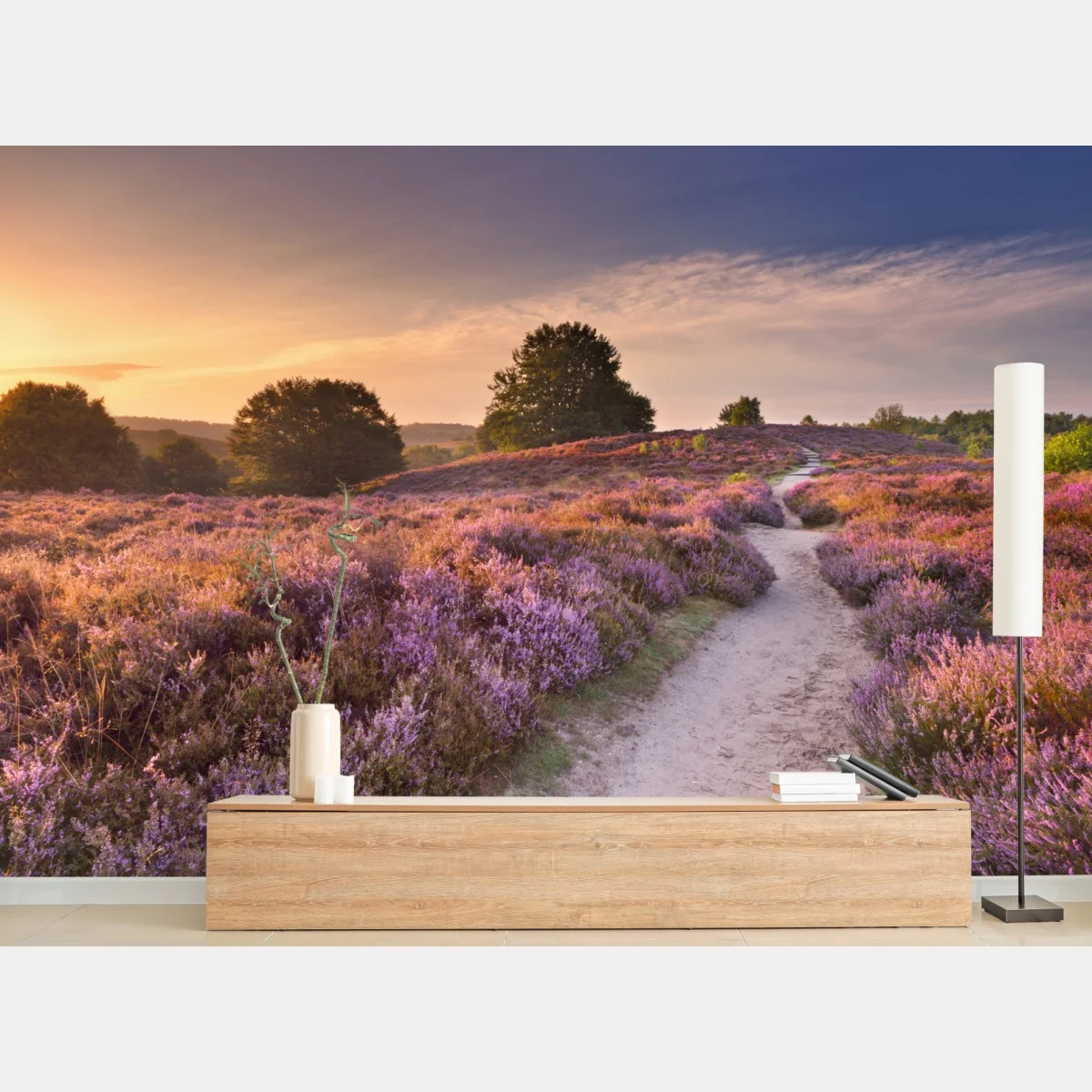 Fototapete Posbank bei sonnenaufgang über blühender heide