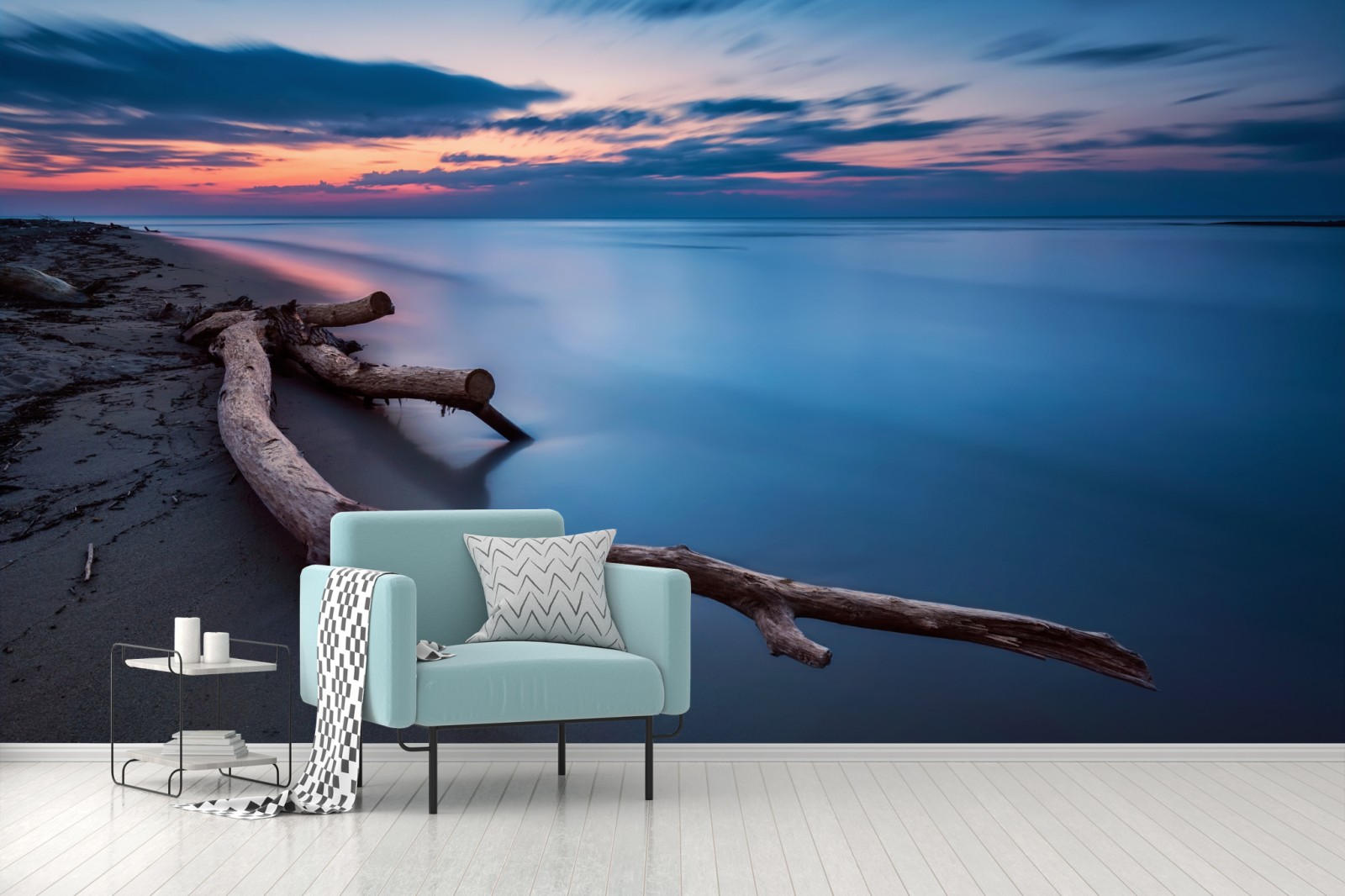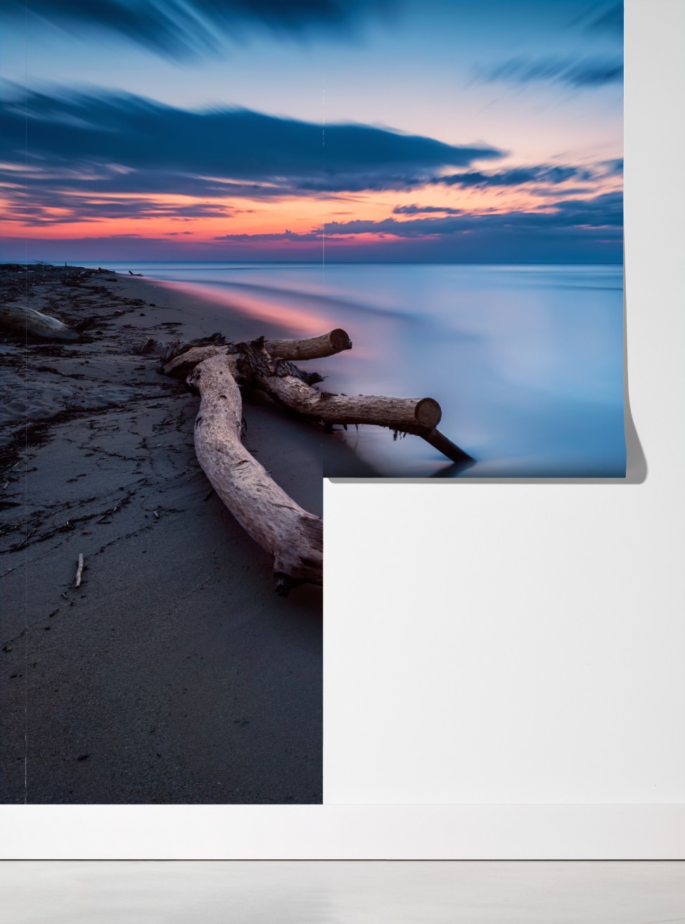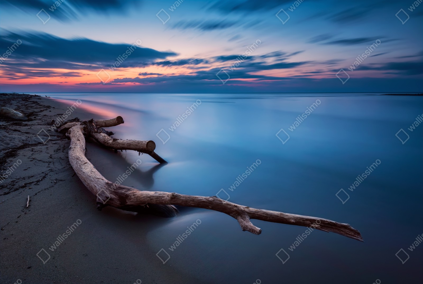 Fototapete treibholz bei dämmerung am ruhigen strand