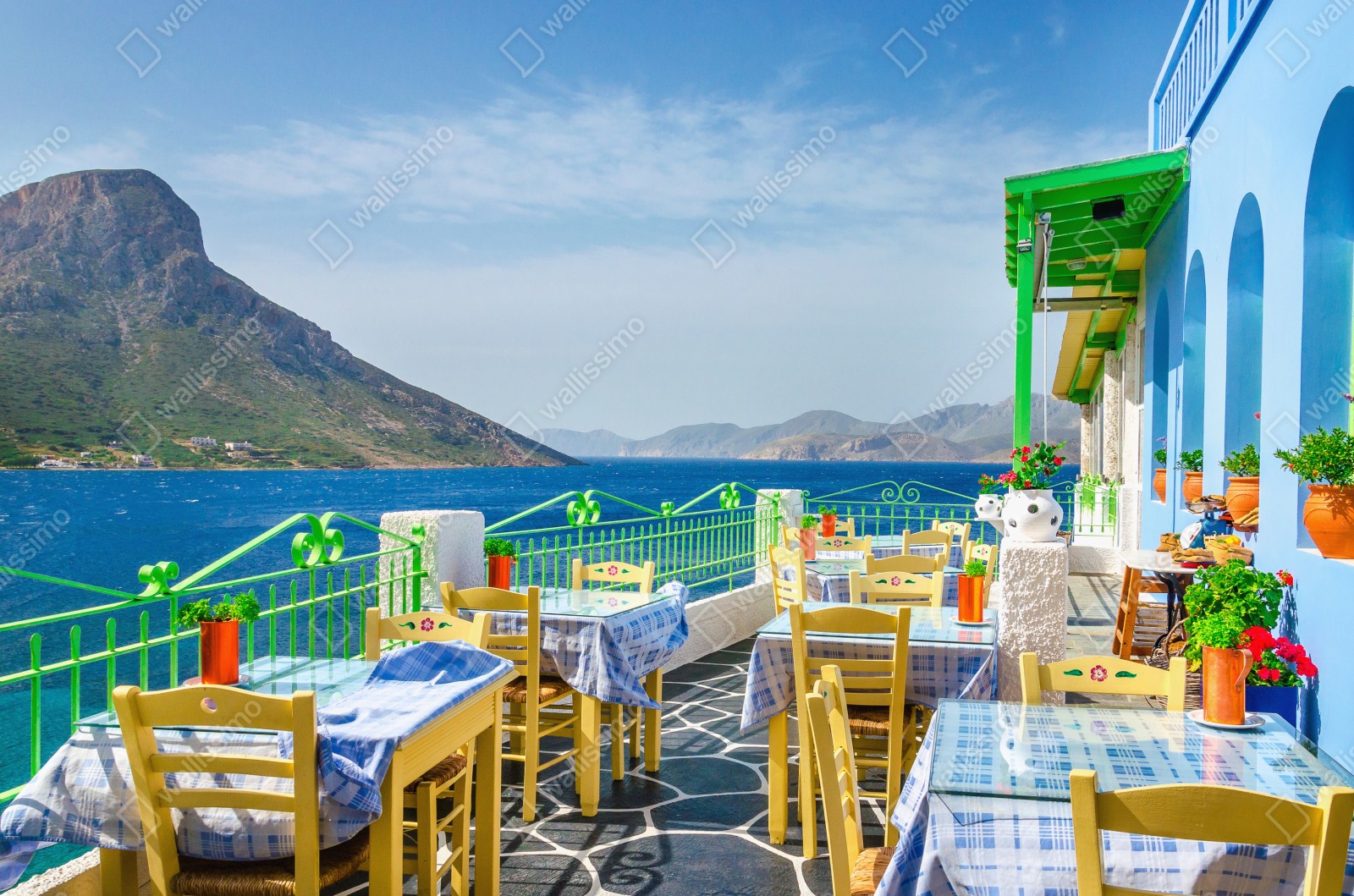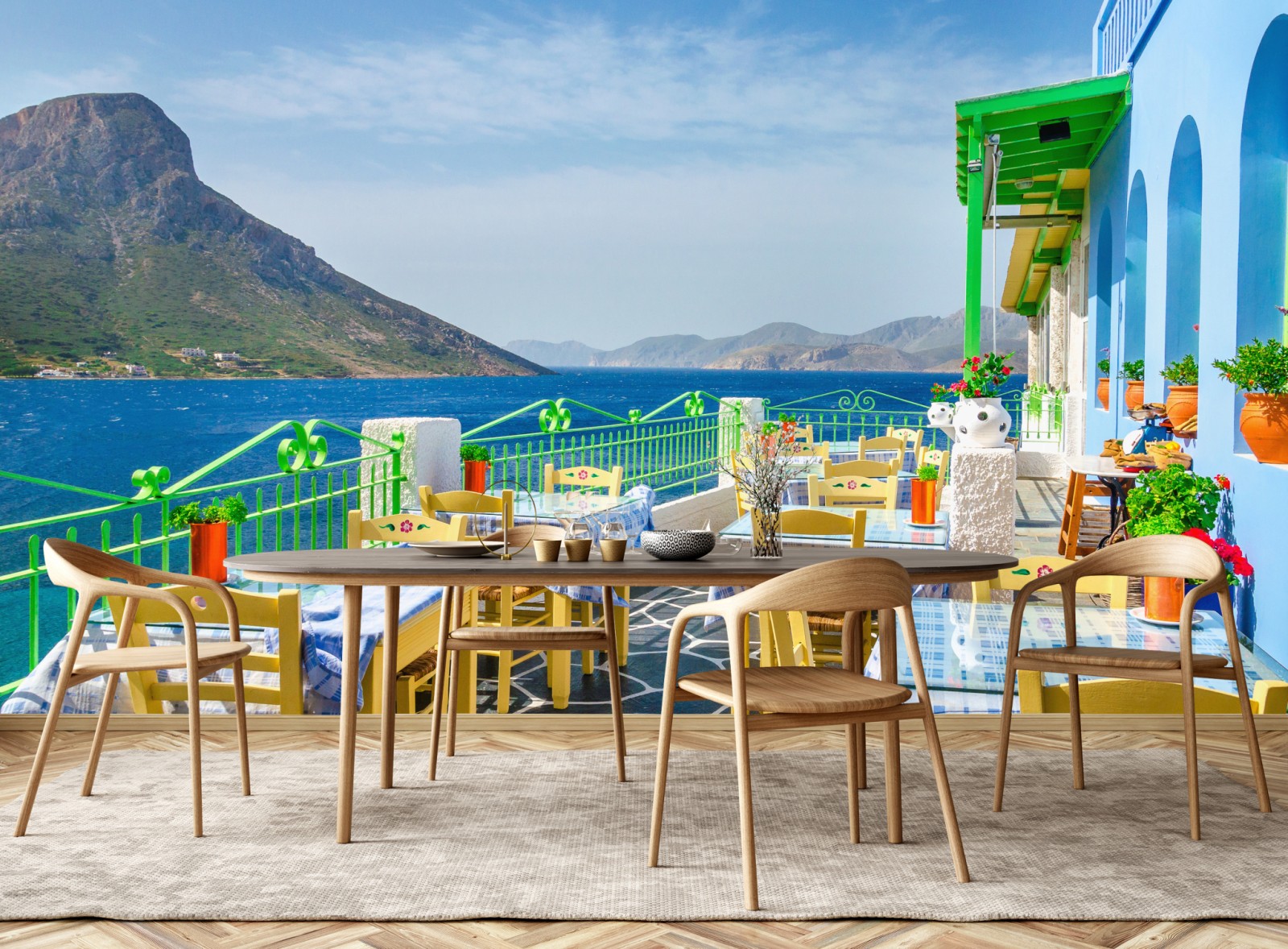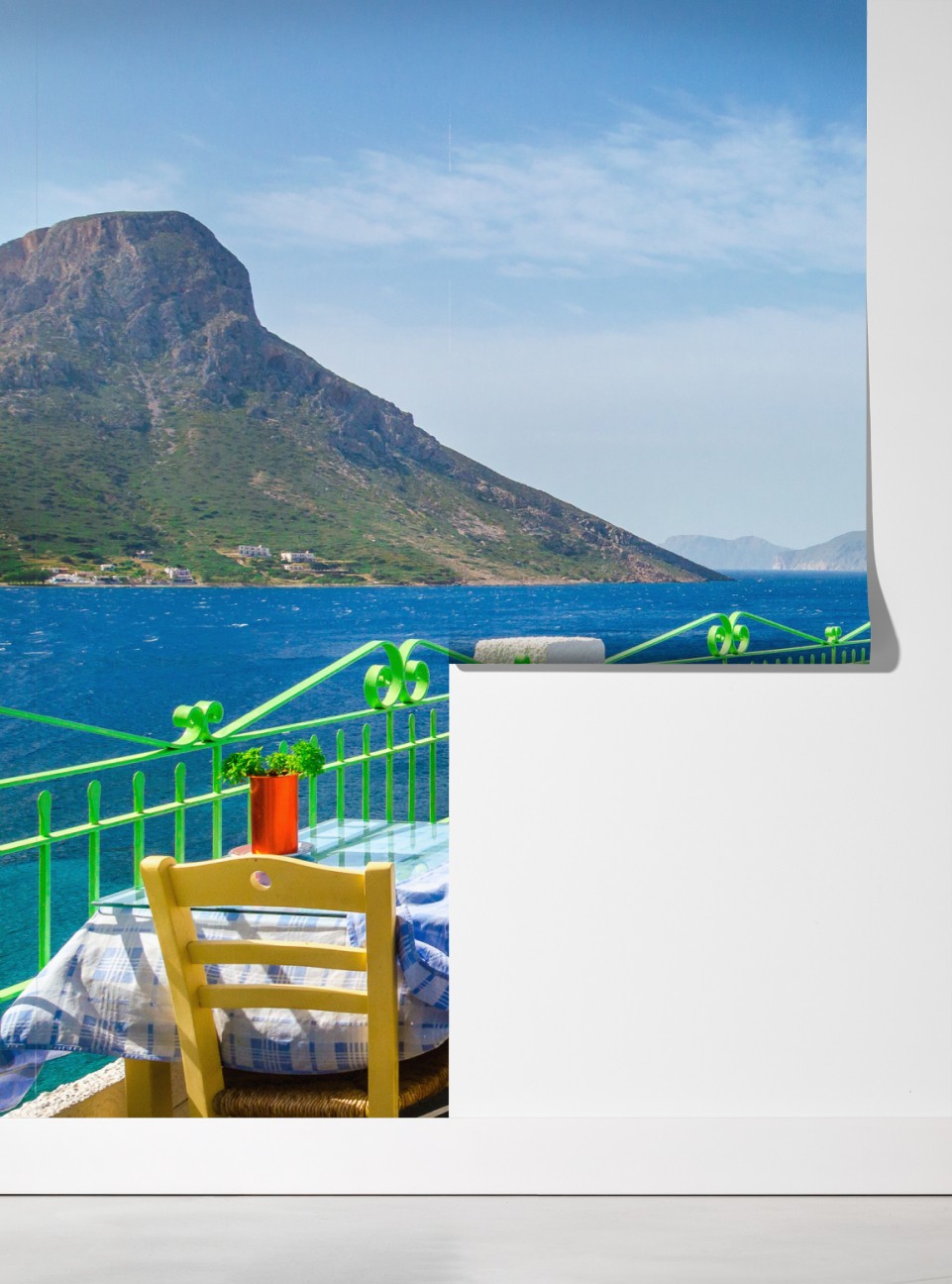Genießen Sie eine sonnenbeschienene Terrasse mit Blick auf das tiefblaue Meer, perfekt um Küstenflair und sommerliche Stimmung in Ihren Raum zu bringen.