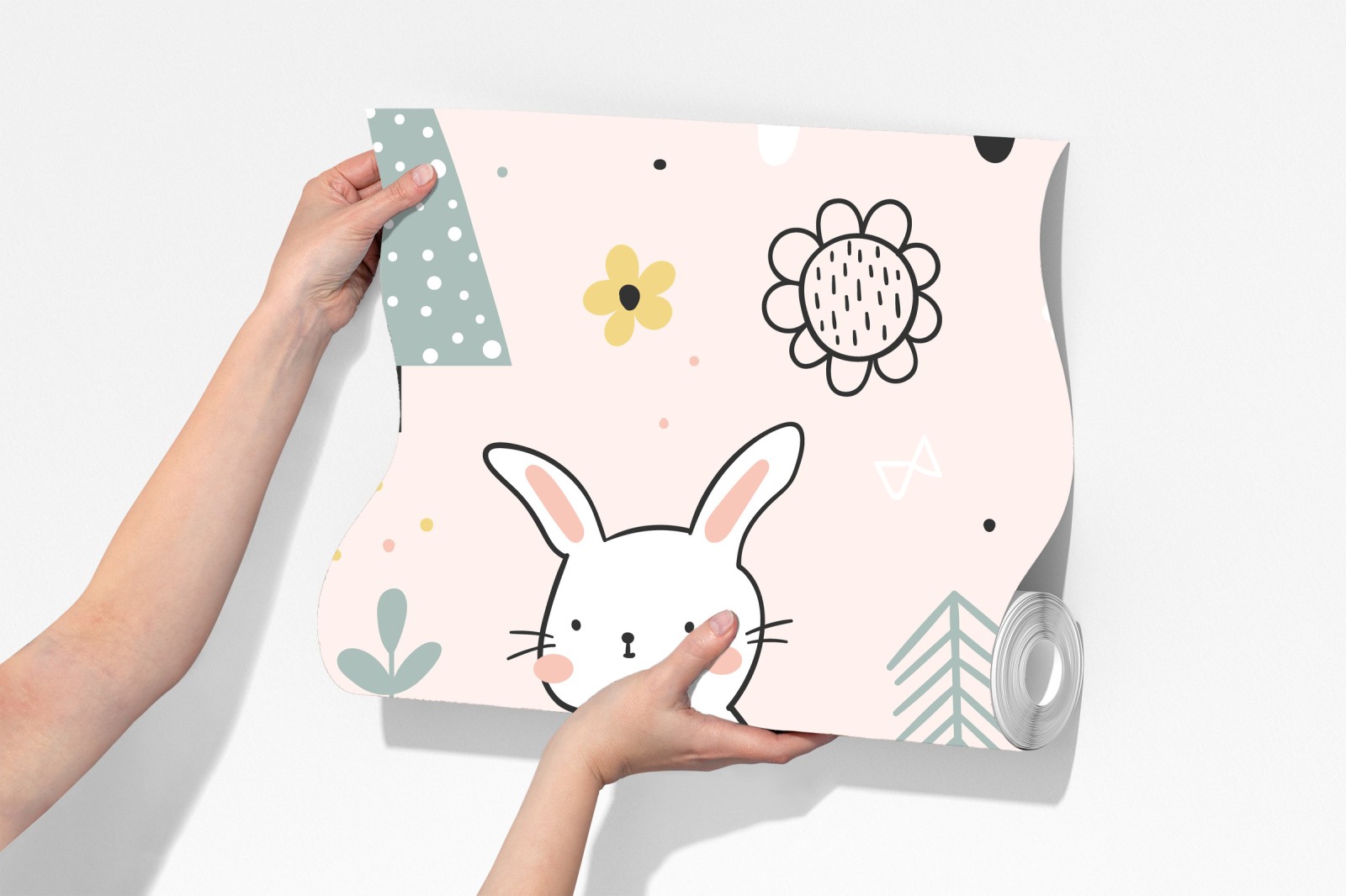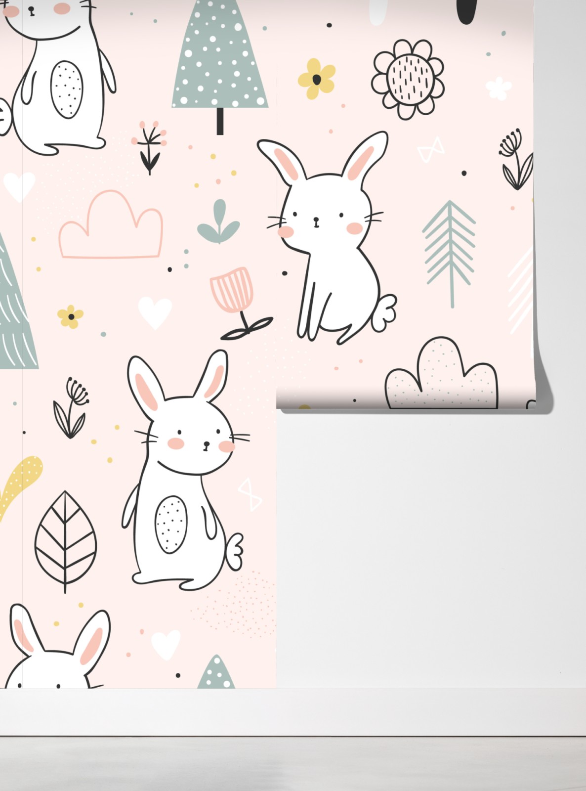 Charmantes pastellfarbenes Hasenmuster, ideal für Kinderzimmer und Babyzimmer, das einen skandinavischen, verspielten Waldcharme verleiht.