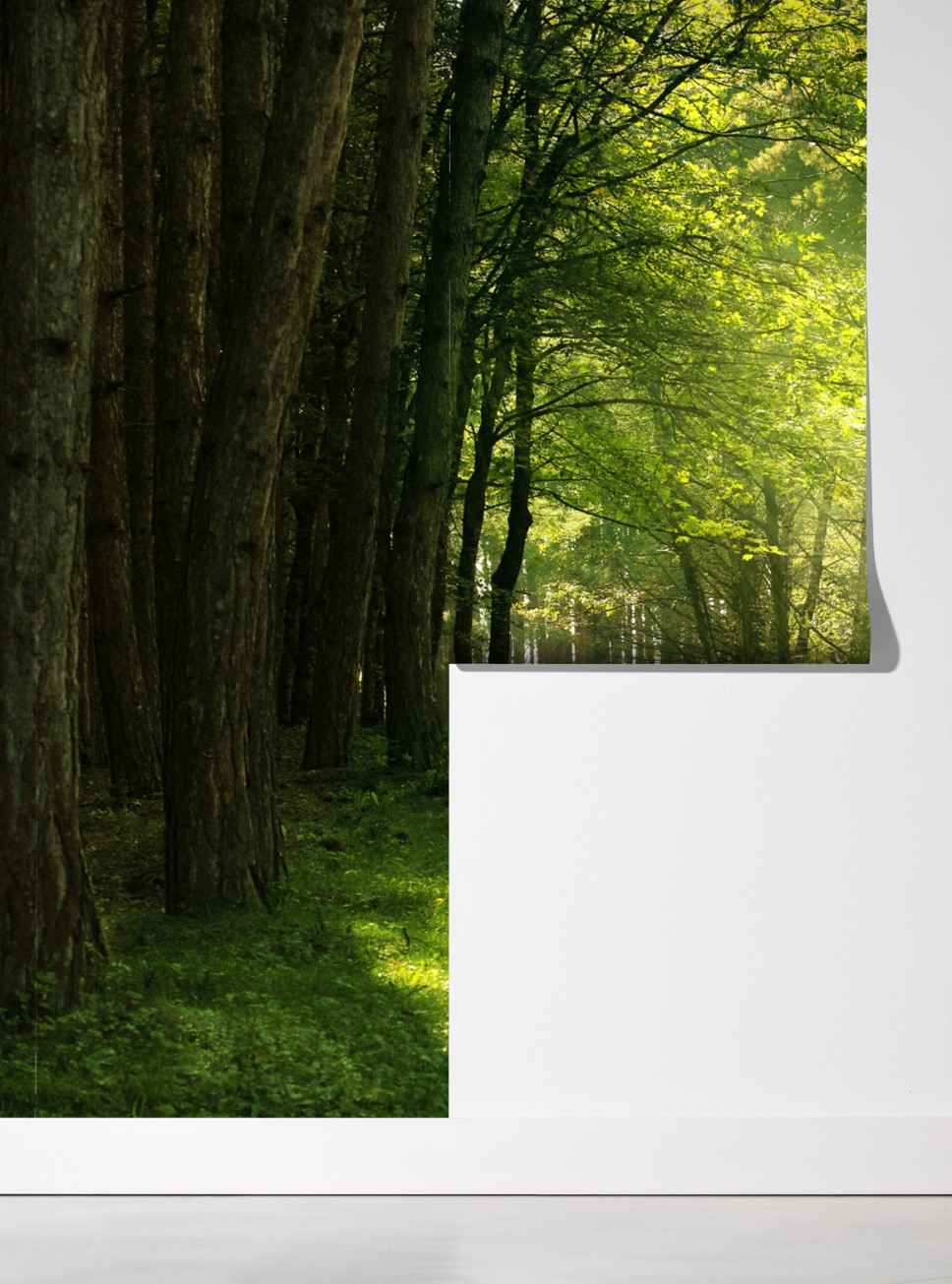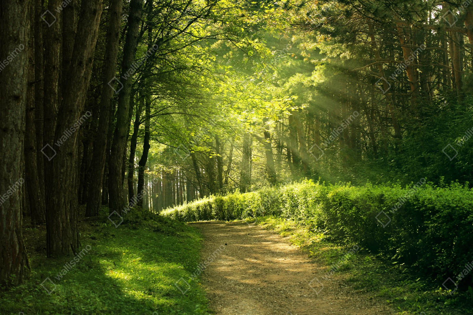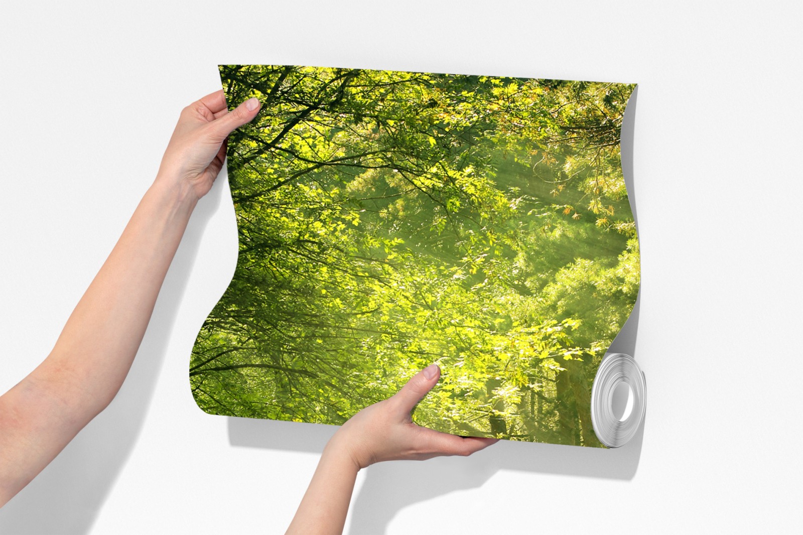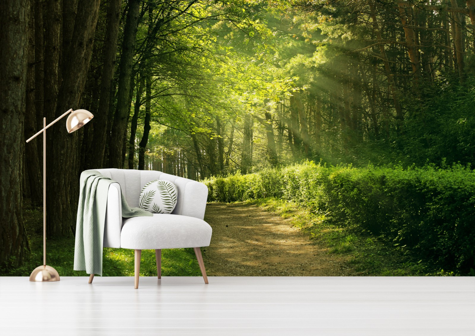 Bringen Sie beruhigende Natur ins Zuhause mit diesem sonnenbeschienenen Waldweg, der Ruhe und Tiefe an jede Wand bringt.