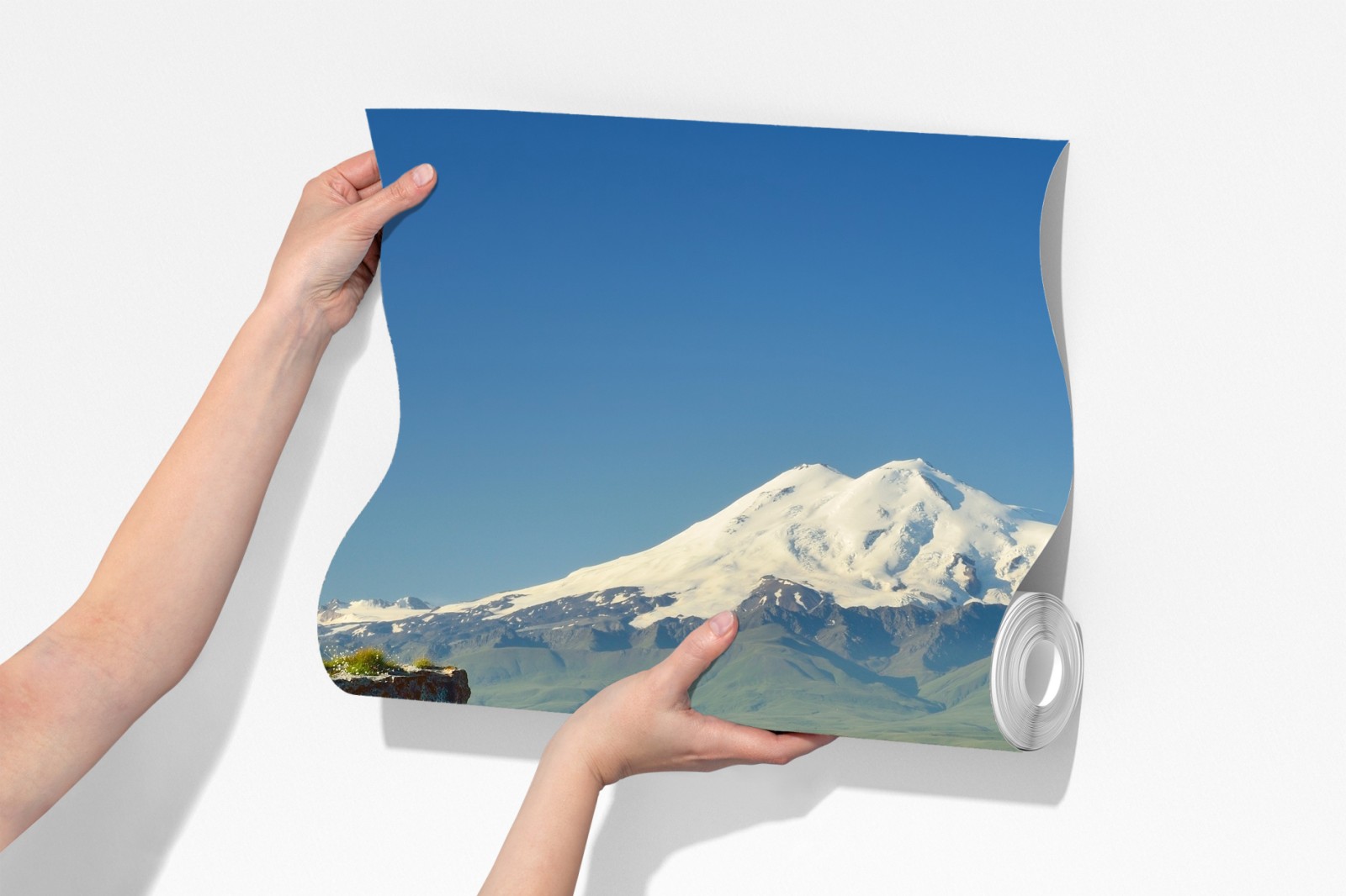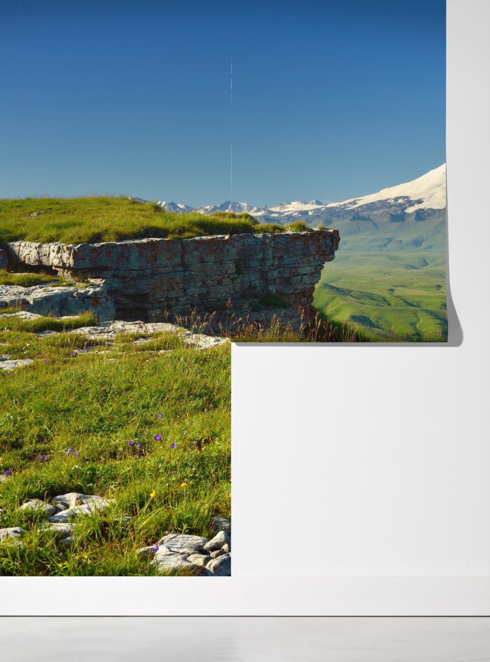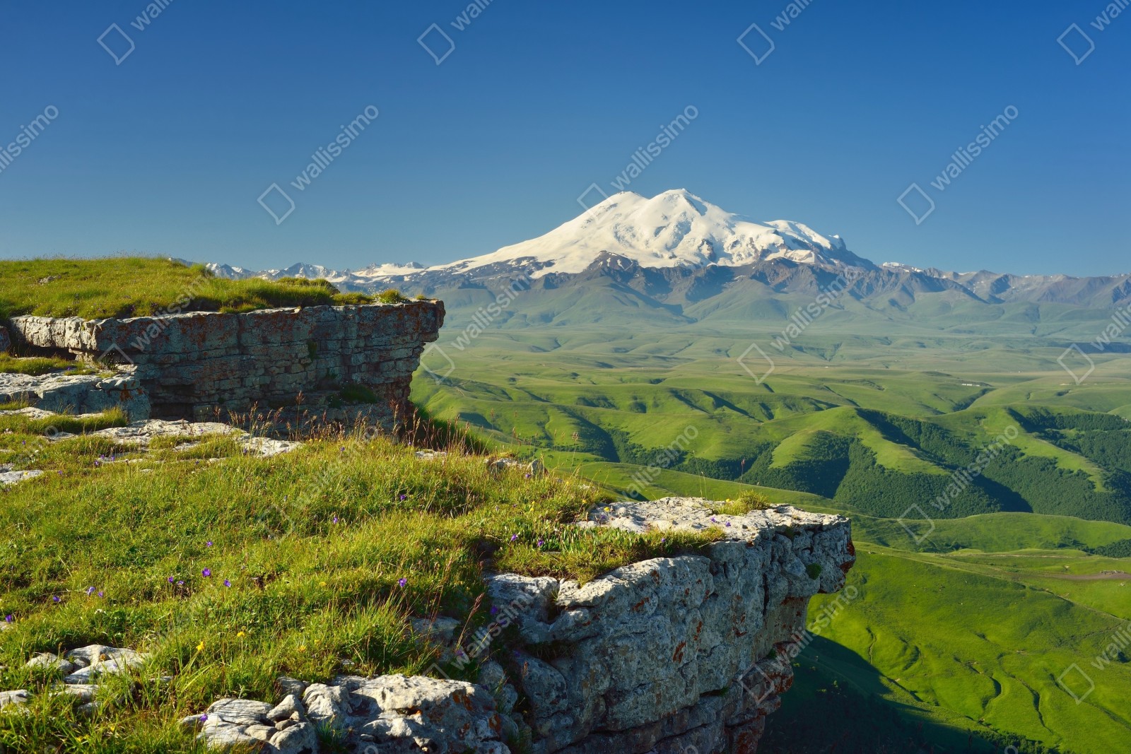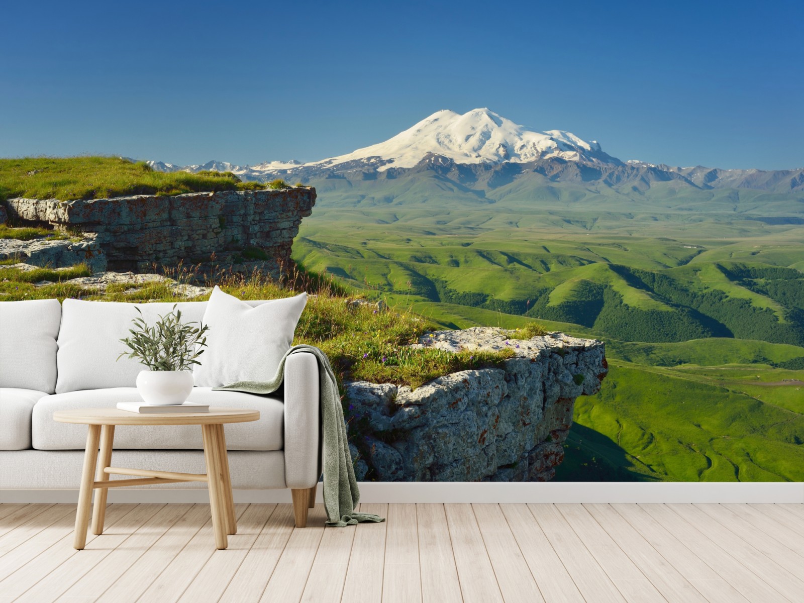 Bringen Sie die ruhige Schönheit des Elbrus in Ihr Zuhause mit diesem lebendigen Panorama einer sonnigen Sommermorgenlandschaft über grünen Tälern und schneebedeckten Gipfeln.