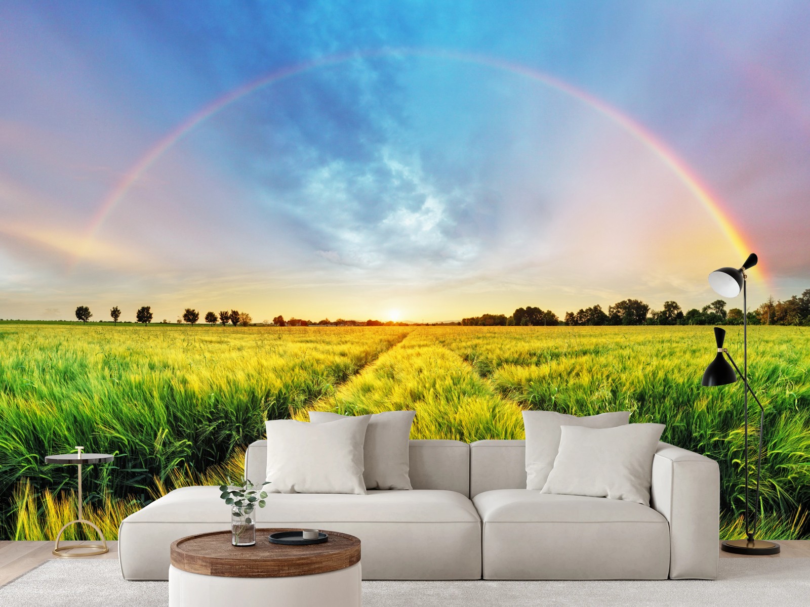 Fototapete Regenbogen über goldenem weizenfeld bei sonnenuntergang