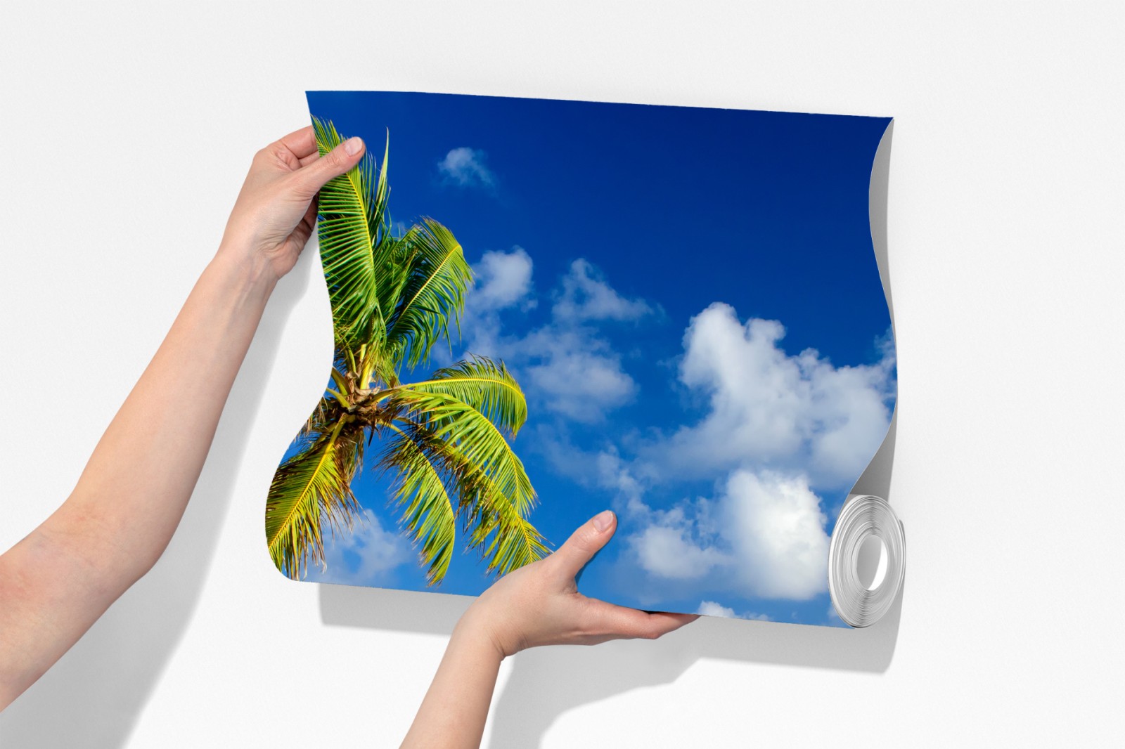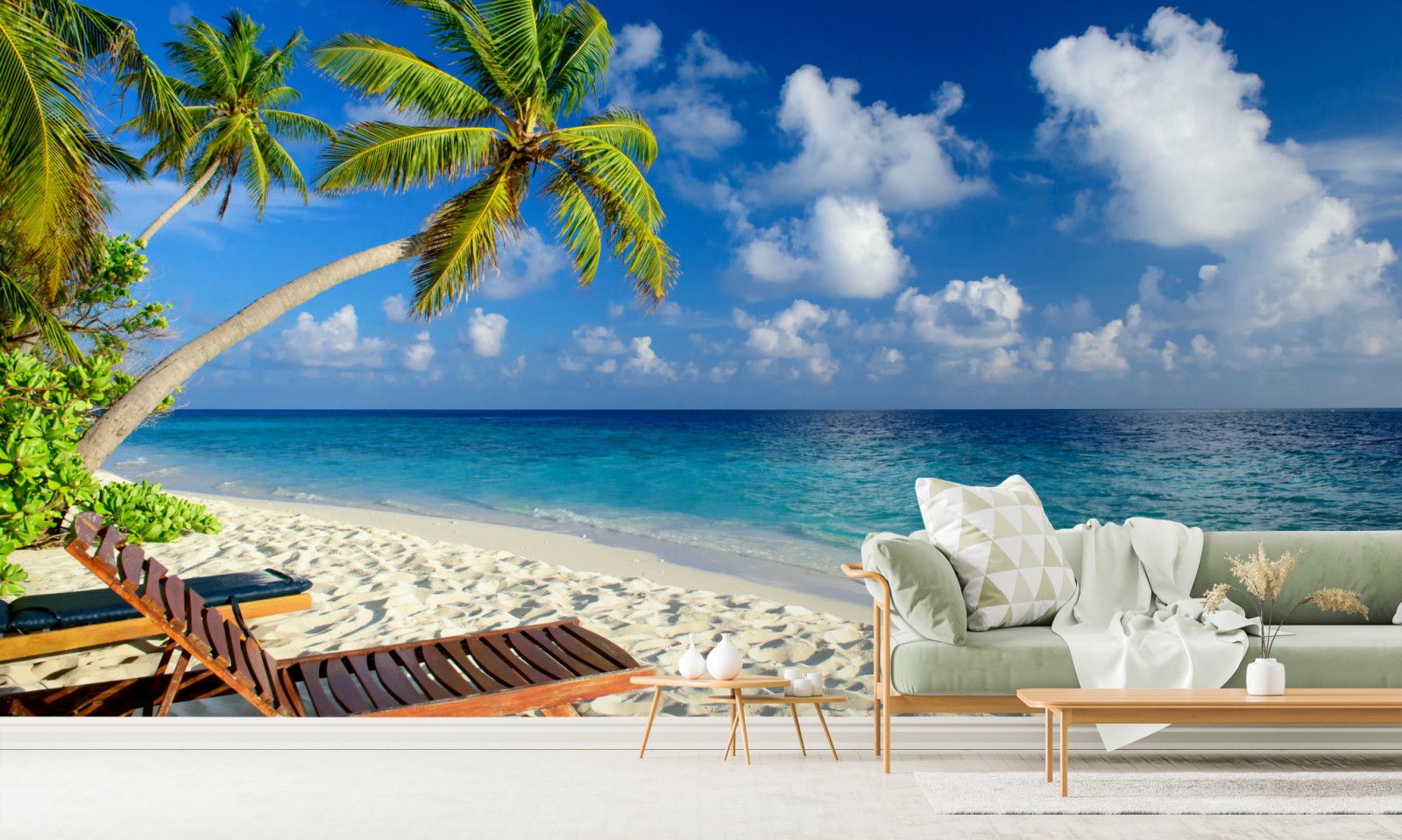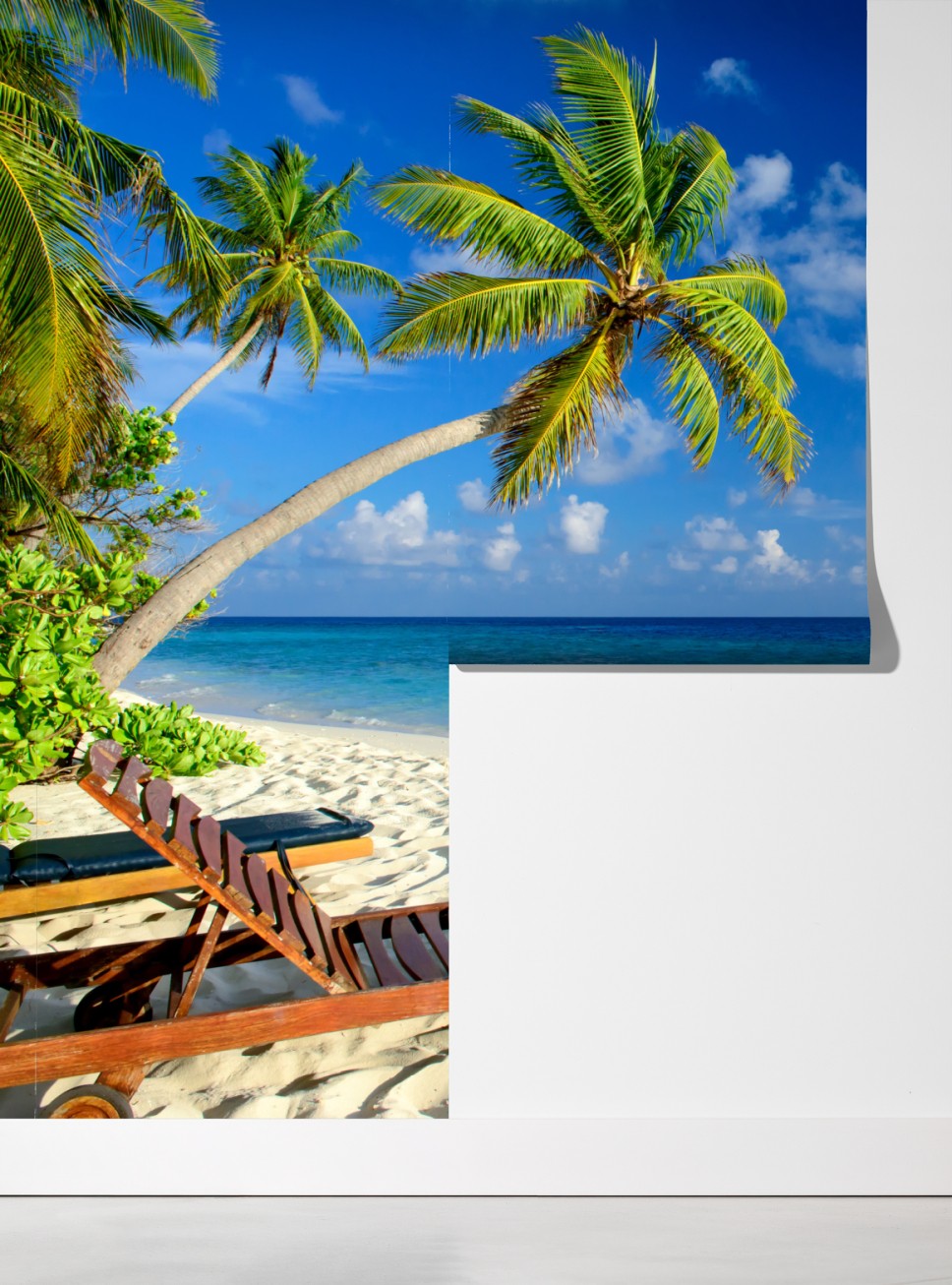 Bringen Sie entspannten Urlaubsflair mit Palmen, weißem Sand und türkisfarbenem Meer in Ihr Zuhause.