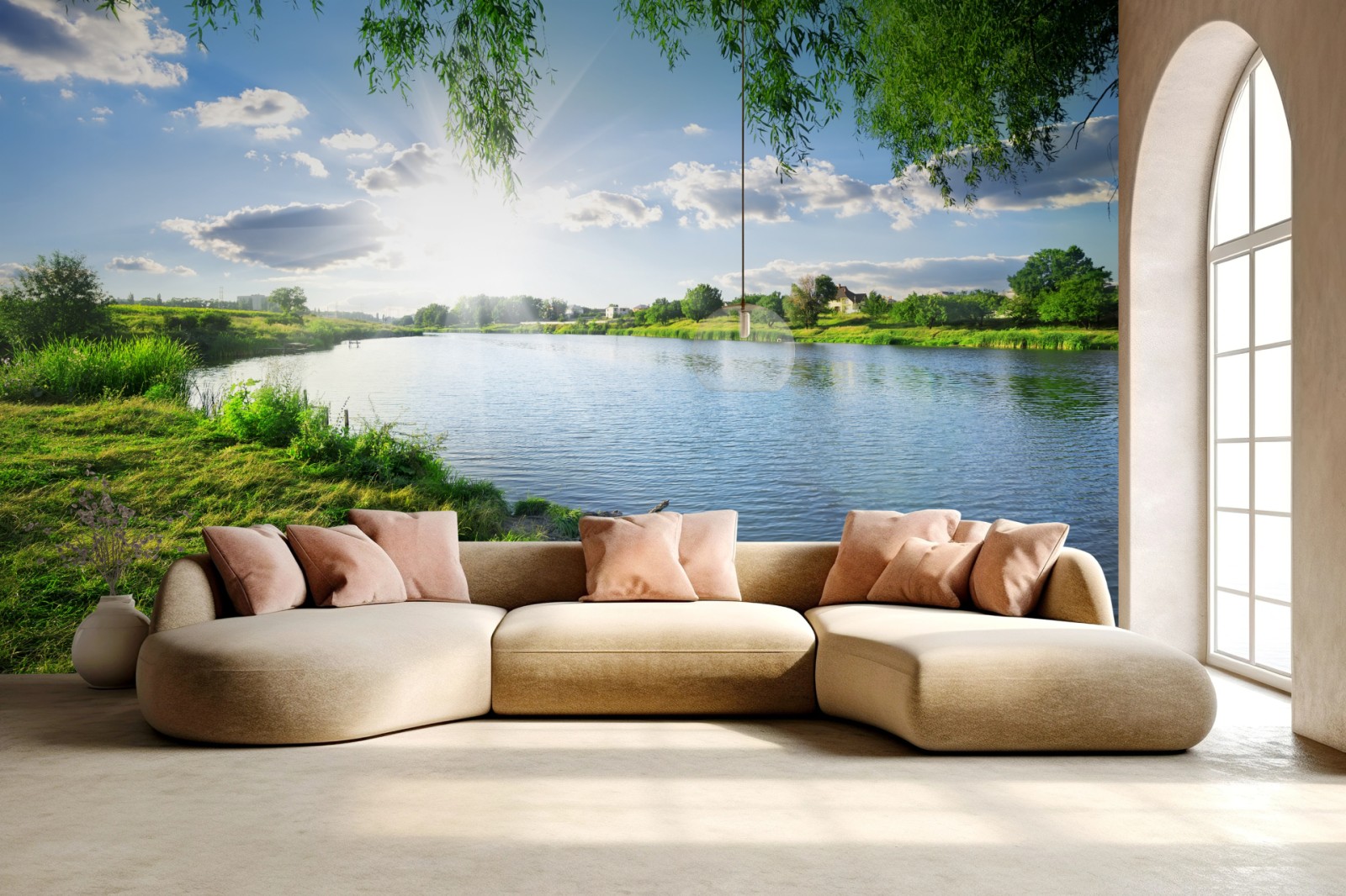 Fototapete Sonnenbeschienenes flussufer mit üppigem grün
