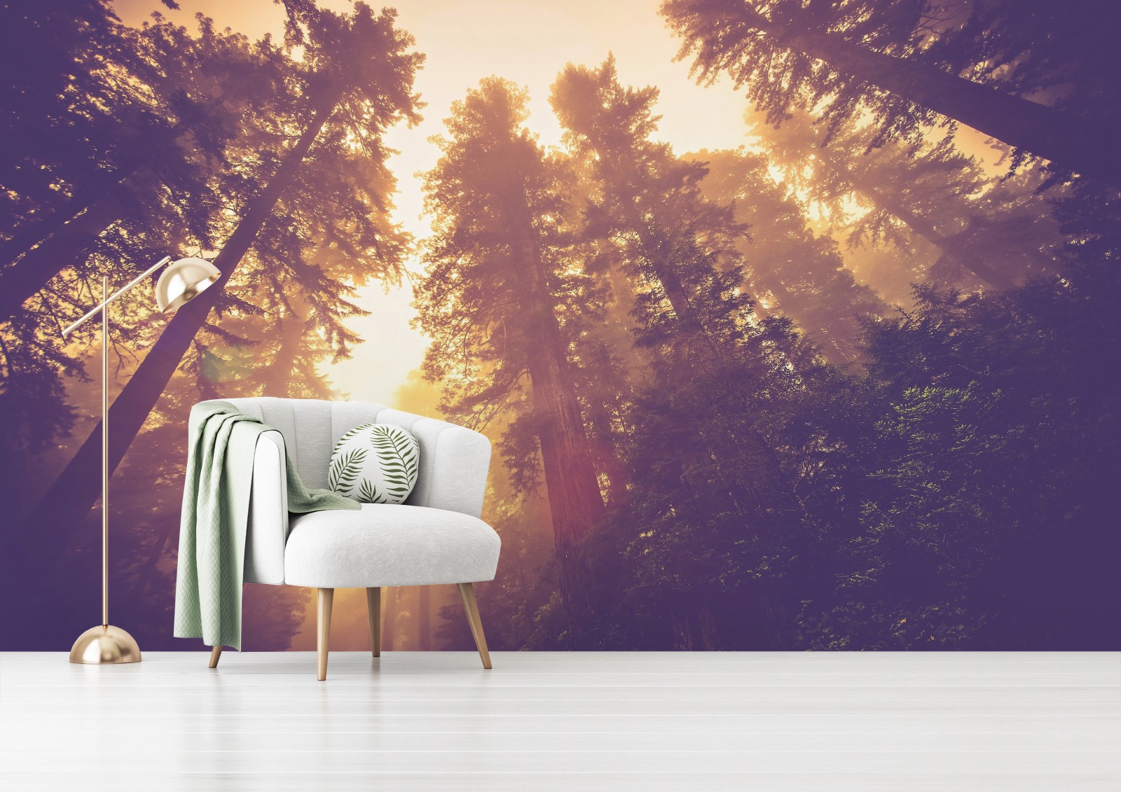 Fototapete Nebeliger mamutbaumwald im goldenen vintagelicht