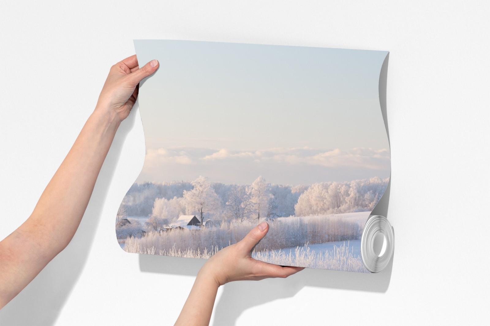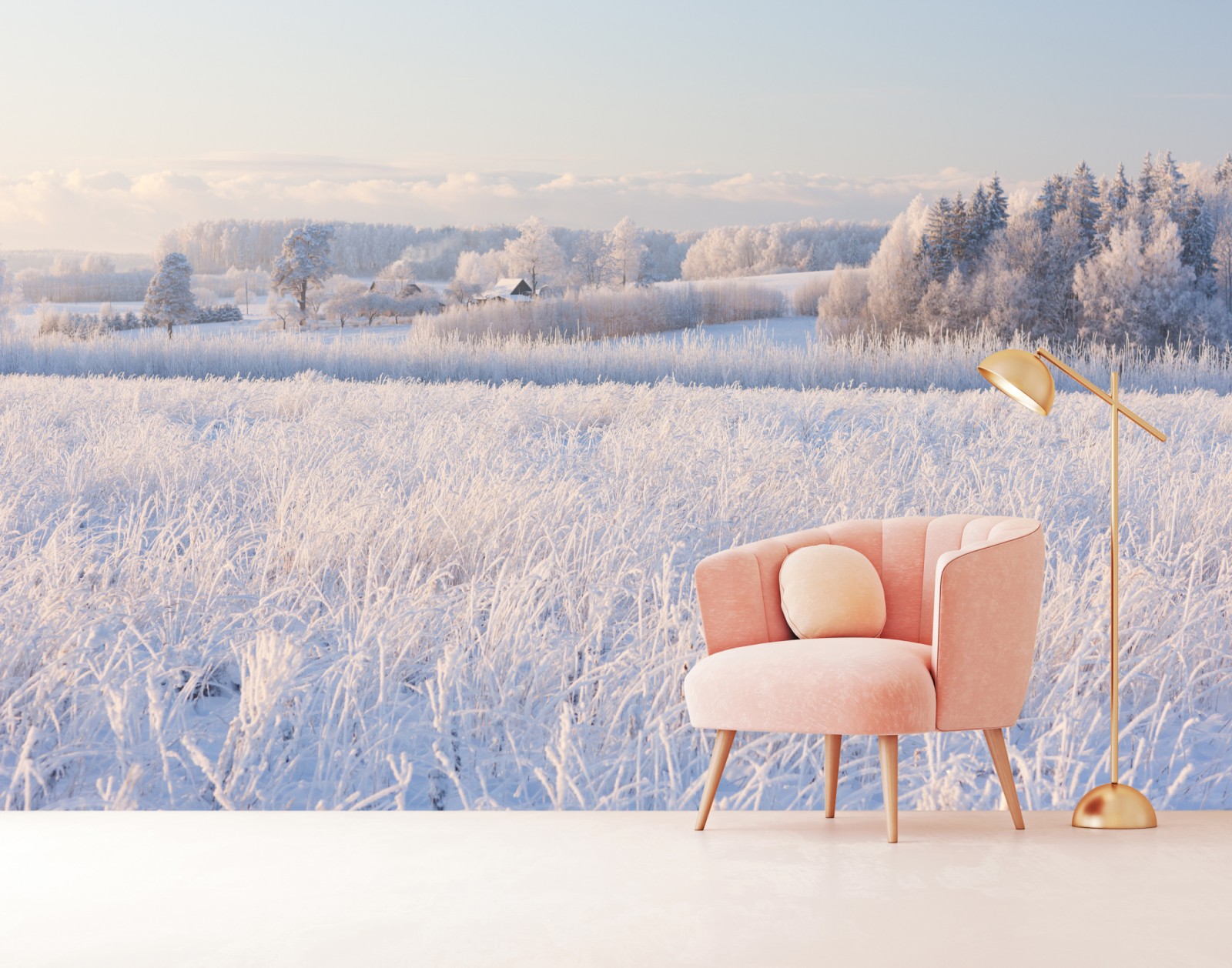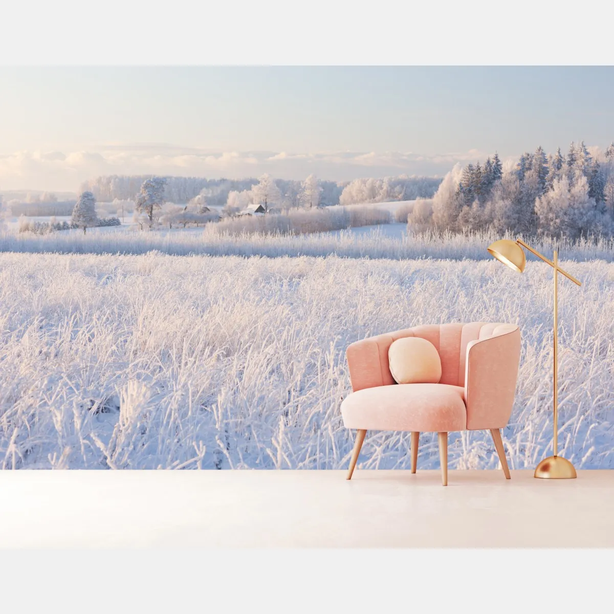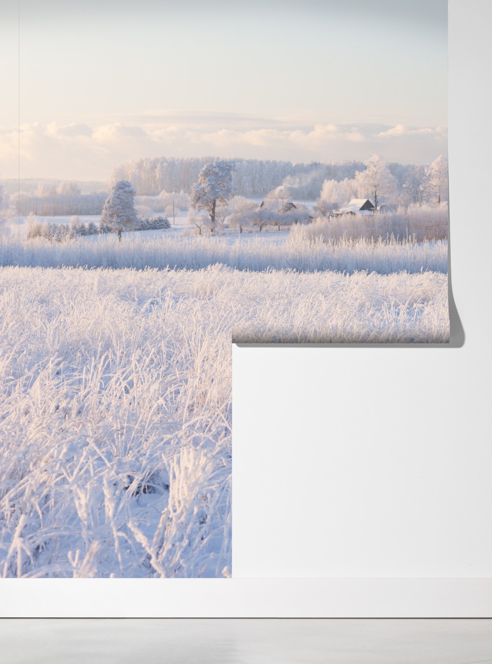 Erleben Sie die ruhige Schönheit einer reifbedeckten Wiese im sanften Morgenlicht, perfekt, um winterlichen Charme an die Wand zu bringen.