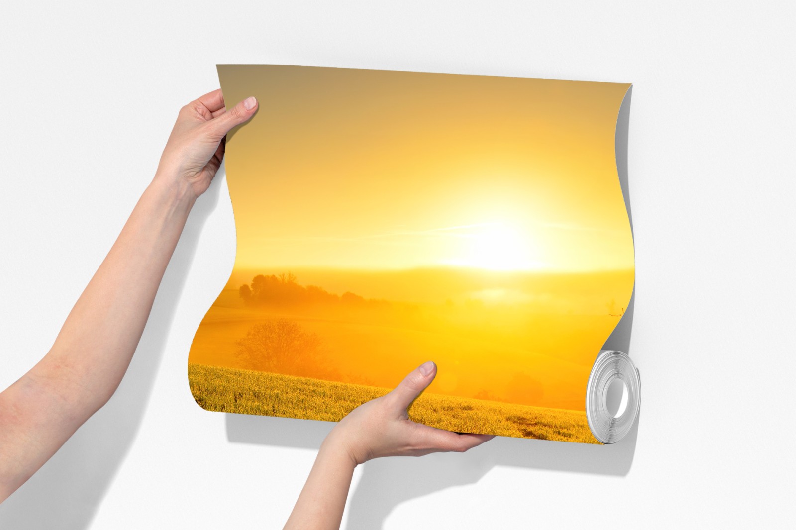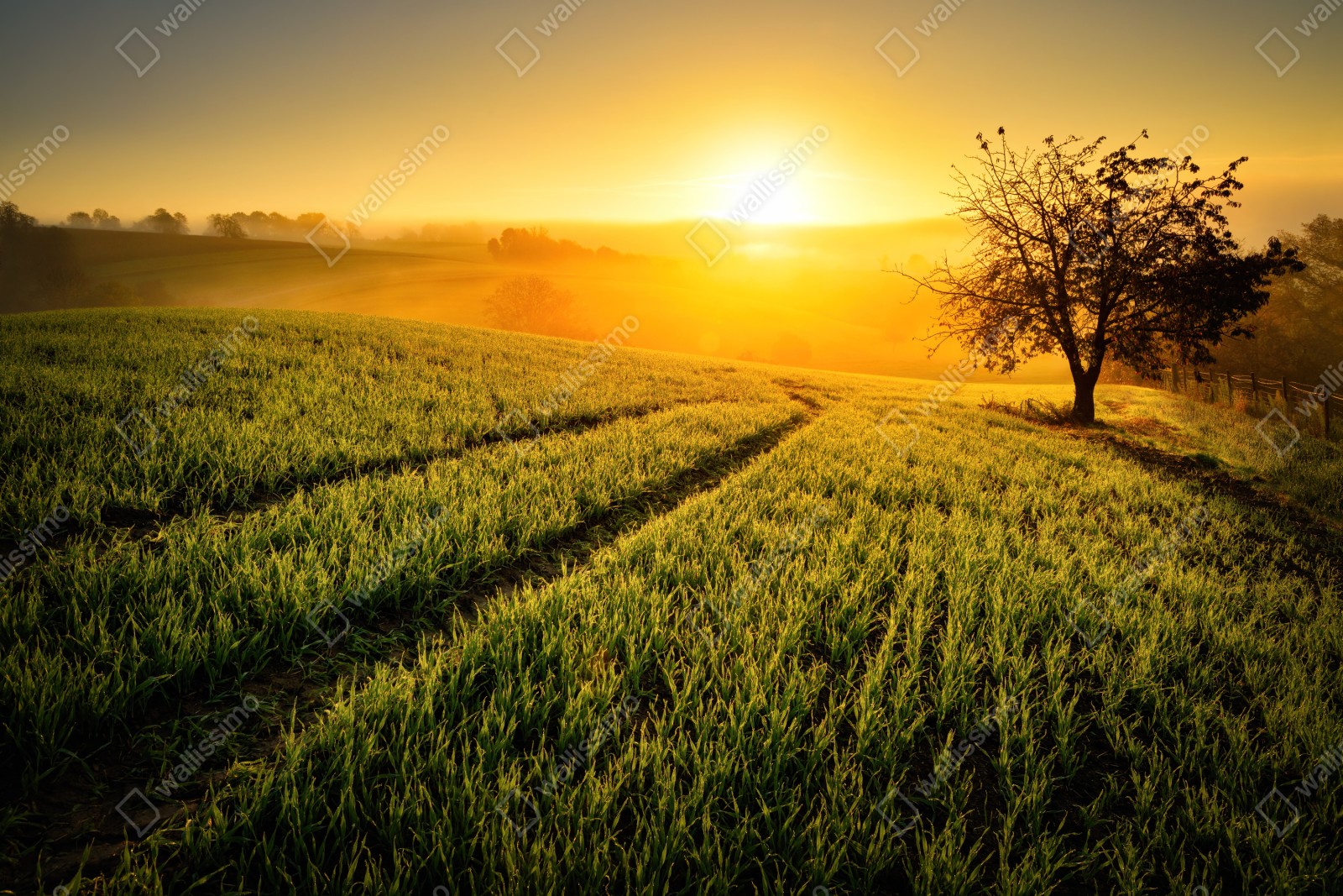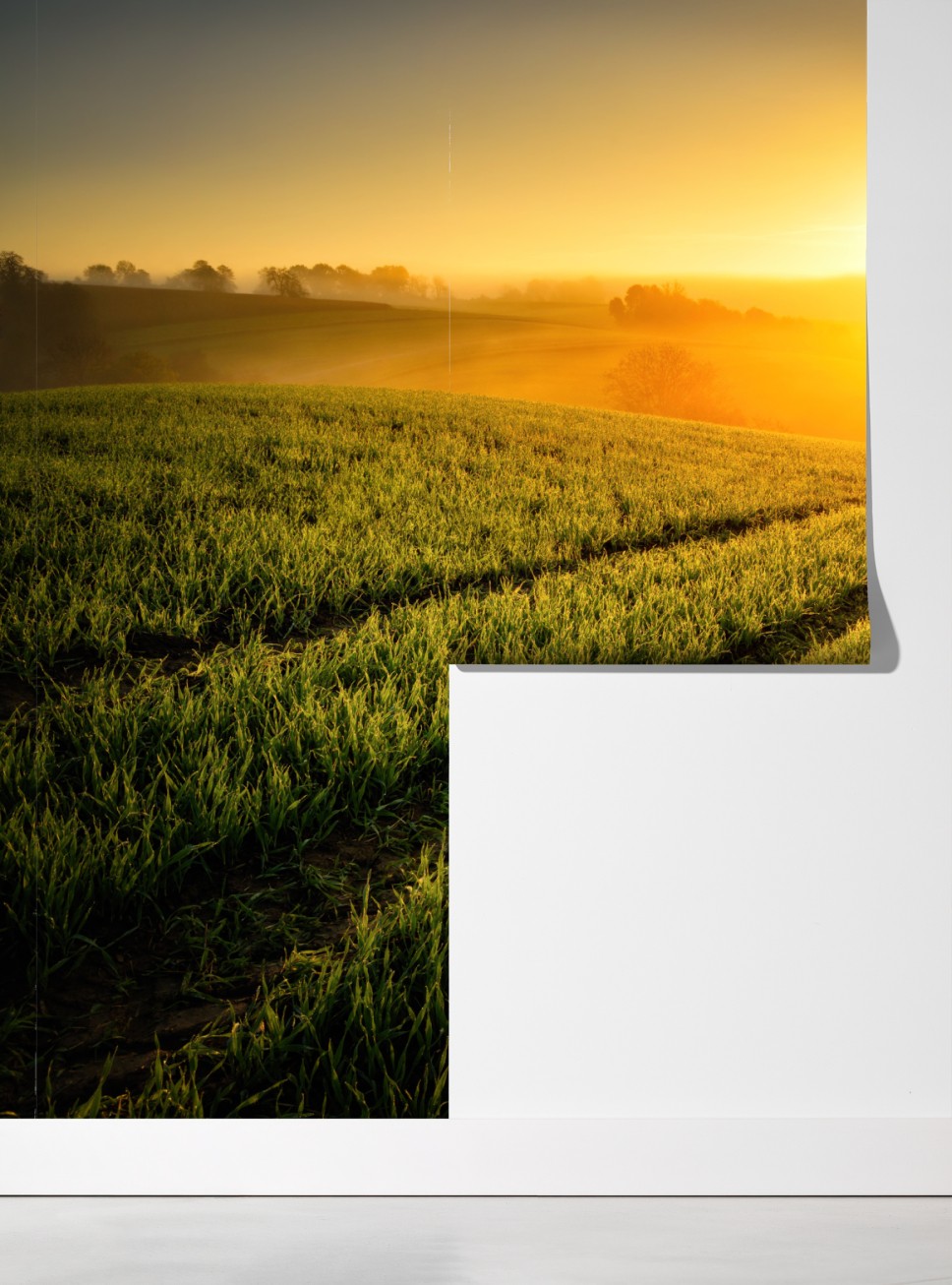 Fototapete sonnenbeschienene wiese im frühlicht – Wallnifity®