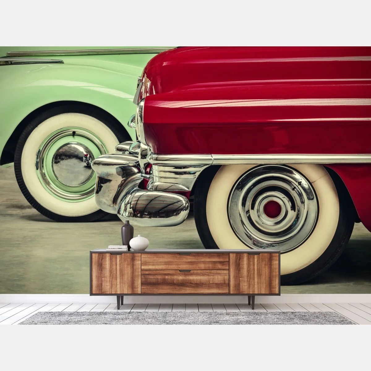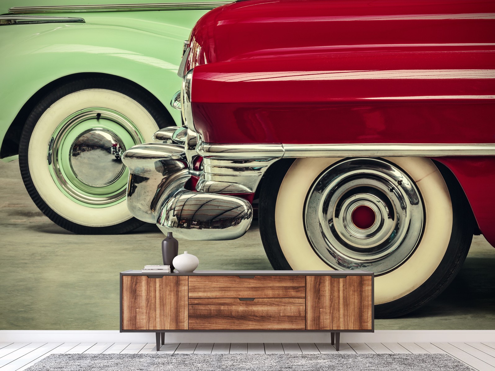 Fototapete Nahaufnahme klassischer autos in rot und mint