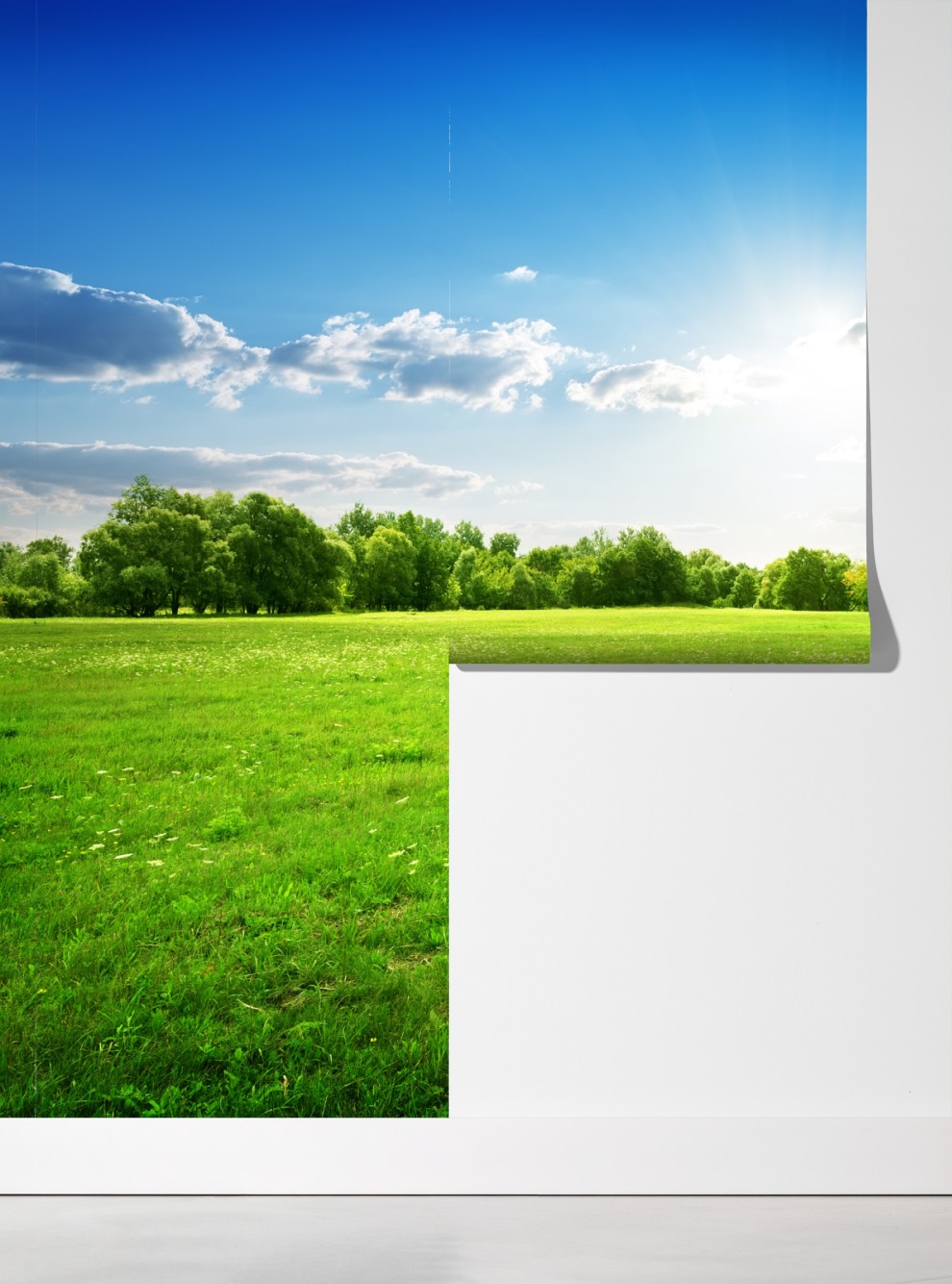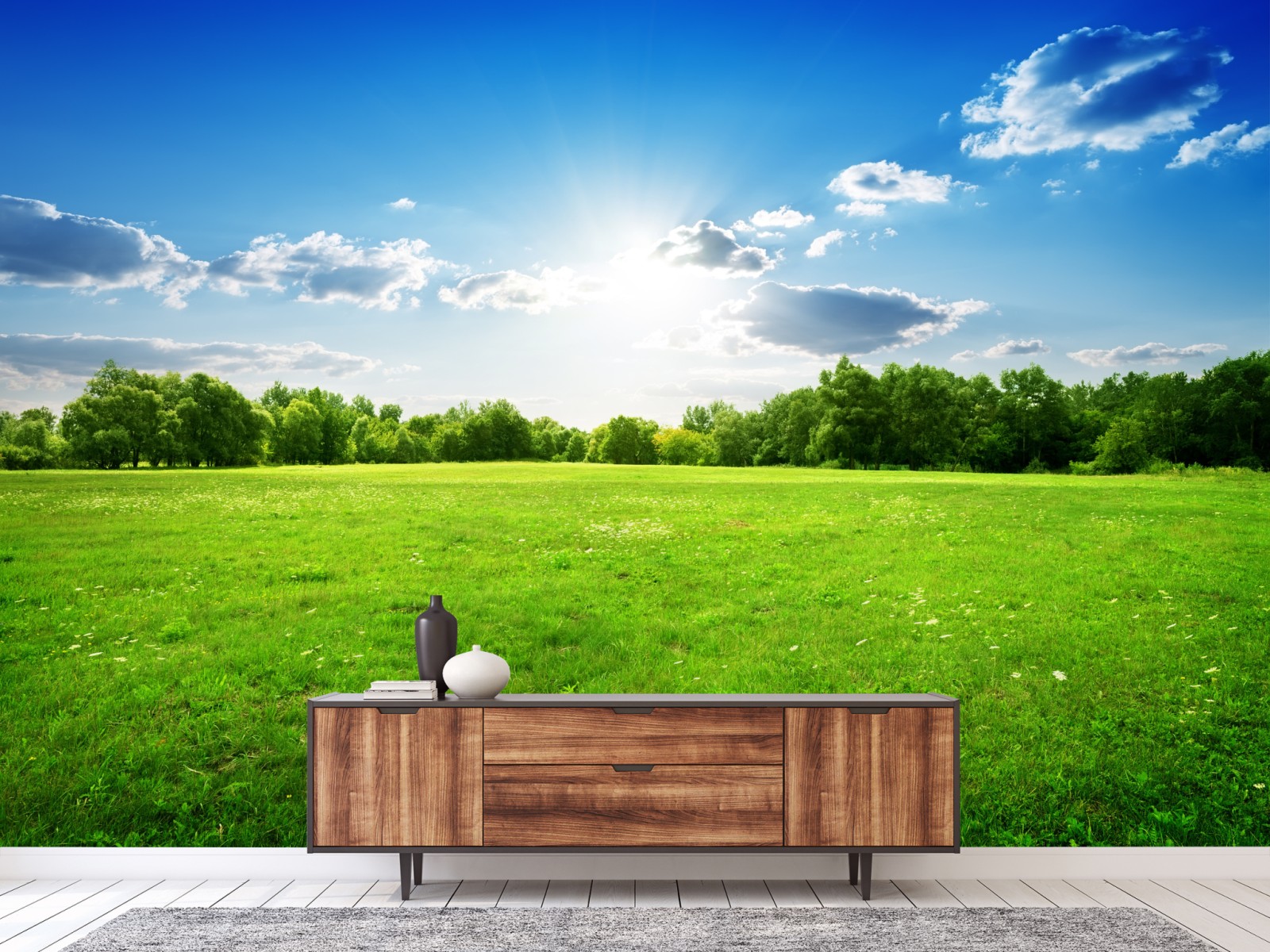 Bringen Sie beruhigende Natur in Ihr Zuhause mit diesem Bild einer sonnigen grünen Wiese, das lebhaftes Gras, entfernte Bäume und einen klaren blauen Himmel zeigt.