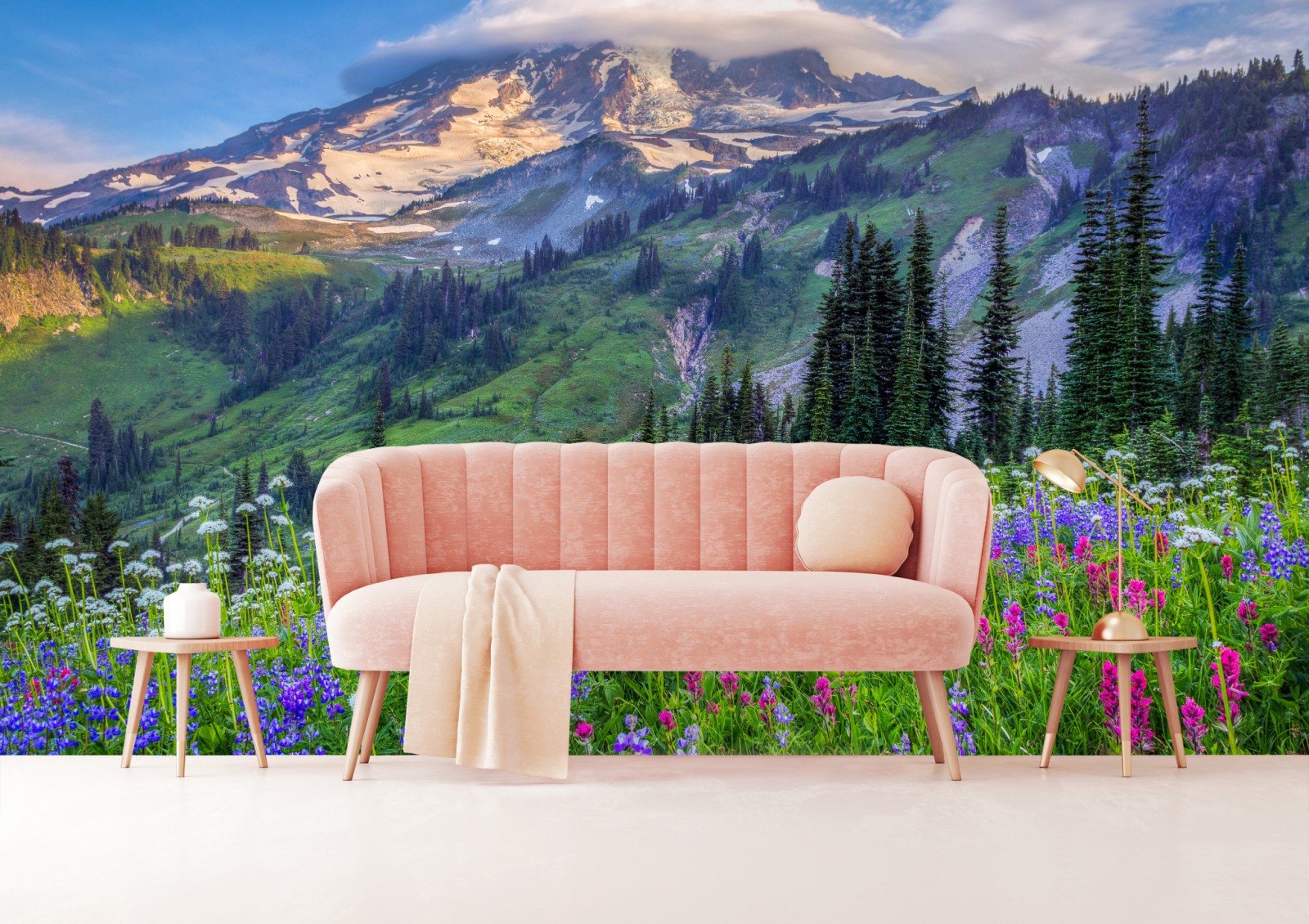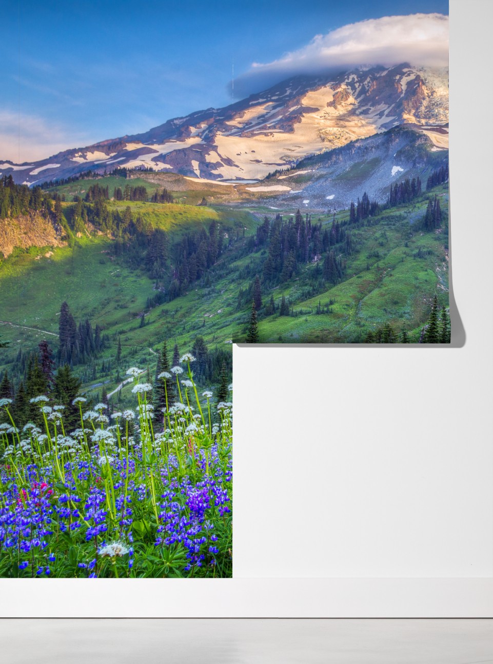 Bringen Sie die Ruhe alpiner Blütenwiesen und schneebedeckter Gipfel in Ihr Zuhause mit diesem lebendigen Landschaftsbild.