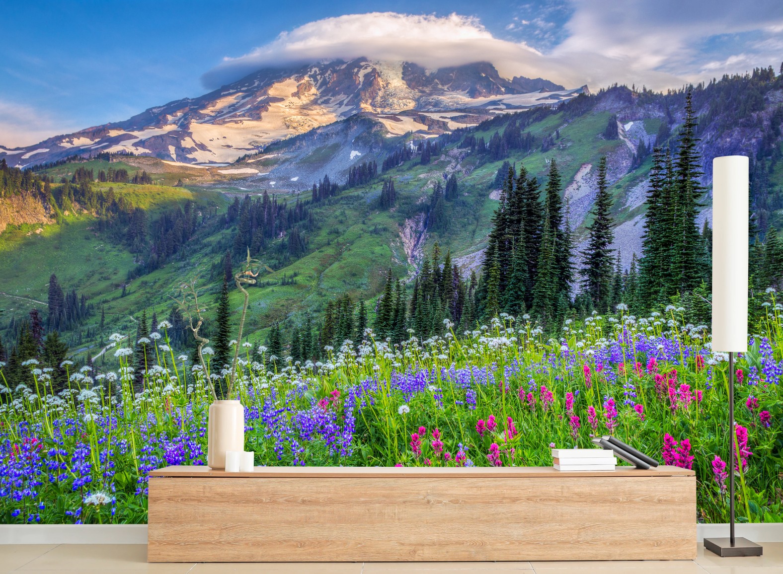 Bringen Sie die Ruhe alpiner Blütenwiesen und schneebedeckter Gipfel in Ihr Zuhause mit diesem lebendigen Landschaftsbild.MehrWeniger