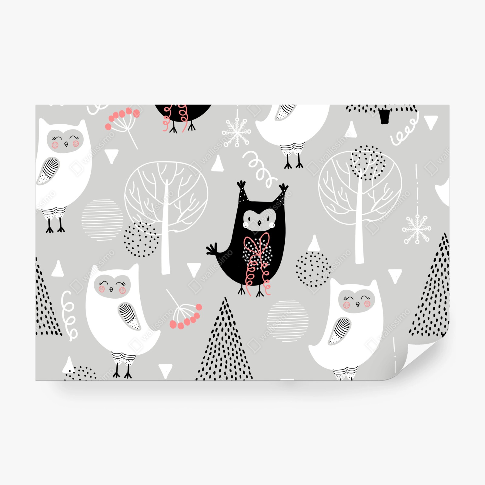 niedliches skandinavisches eulenmuster in sanften grauen und rosa tönen ideal zur dekoration von kinderzimmern.MehrWeniger