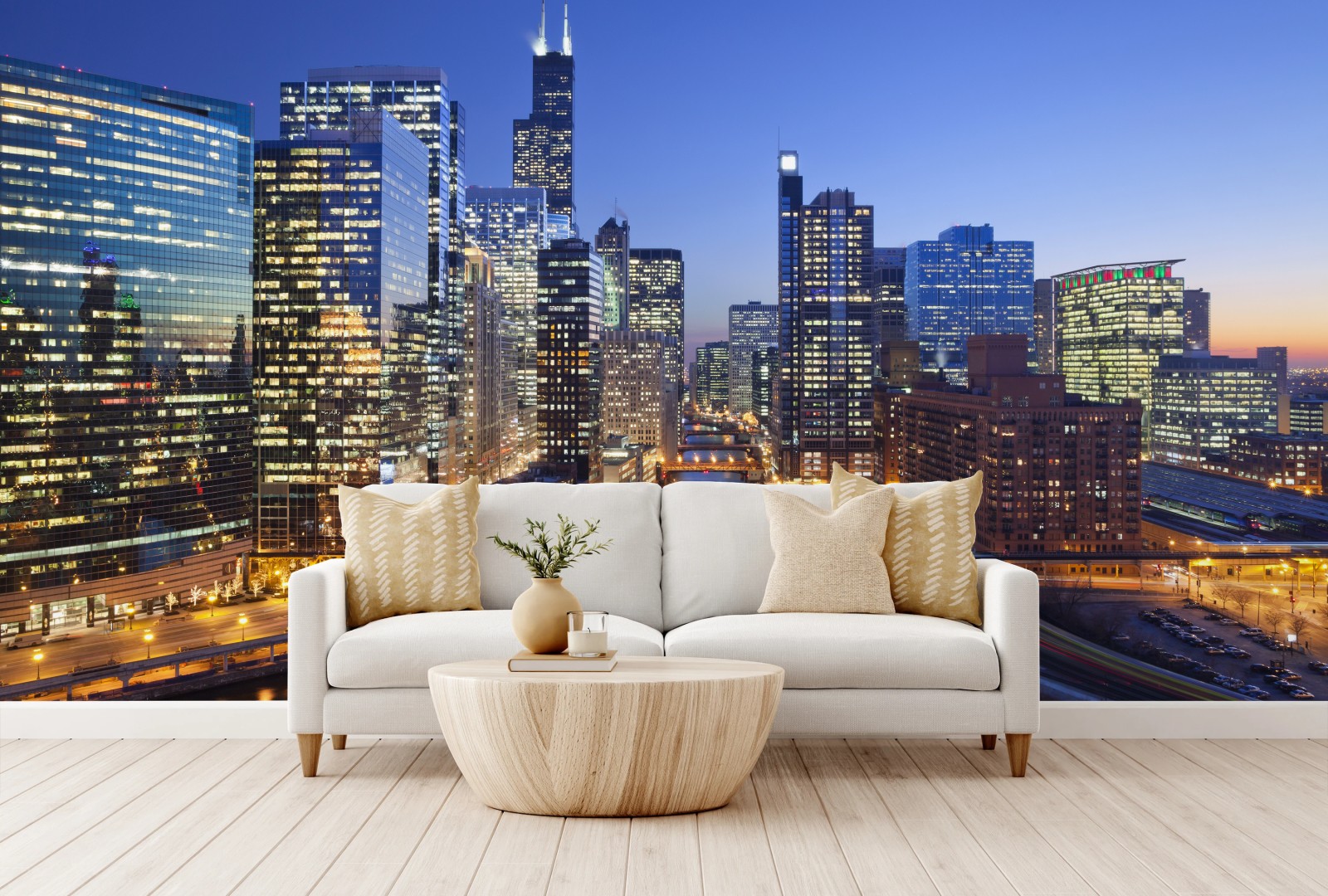 Bringen Sie urbane Energie in Ihr Zuhause mit diesem Abendblick auf die Skyline von Chicago, leuchtende Lichter und reflektierendes Wasser schaffen einen modernen Blickfang.MehrWeniger