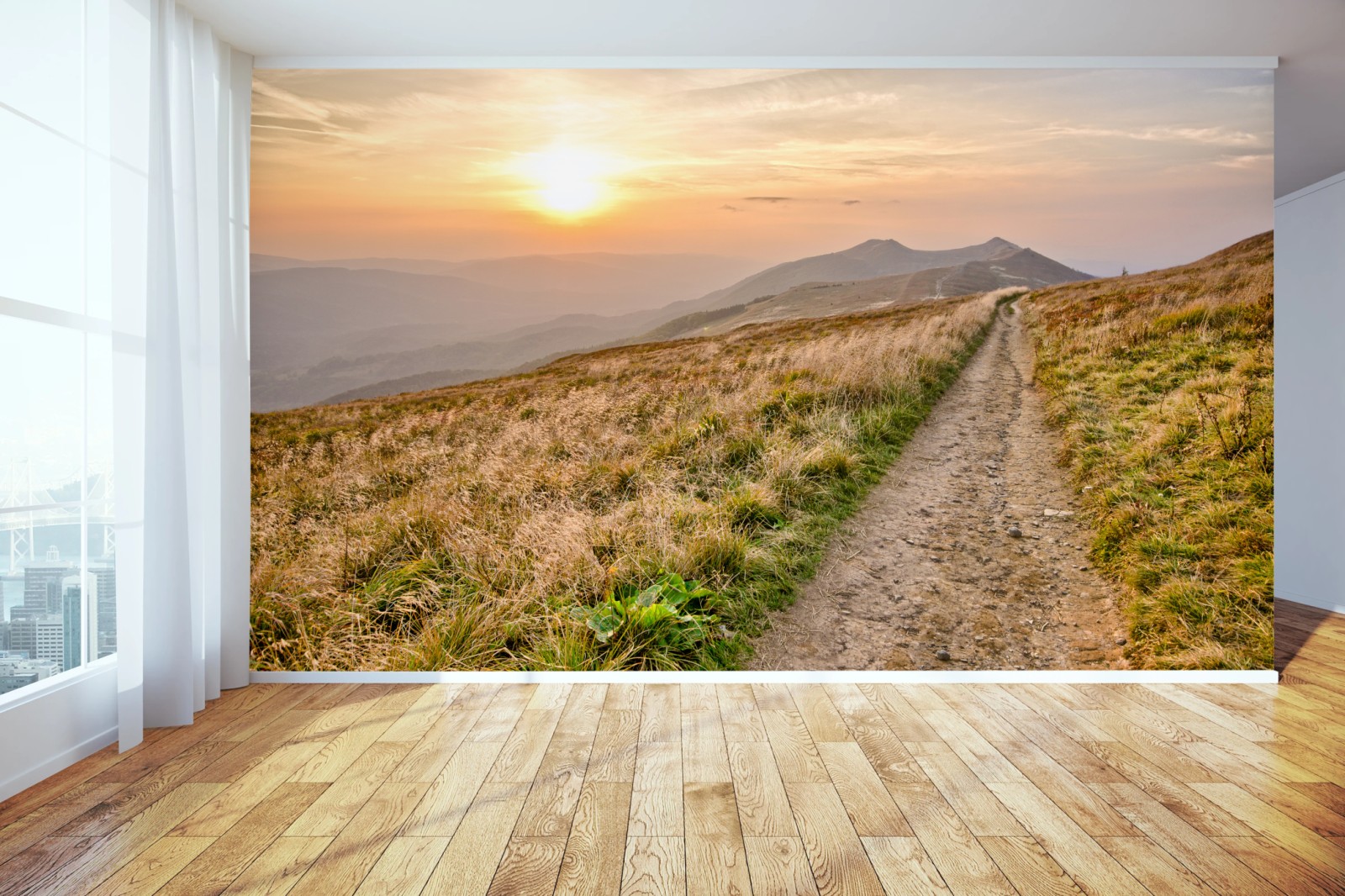 Fototapete Wanderpfad bei sonnenuntergang in Bieszczady
