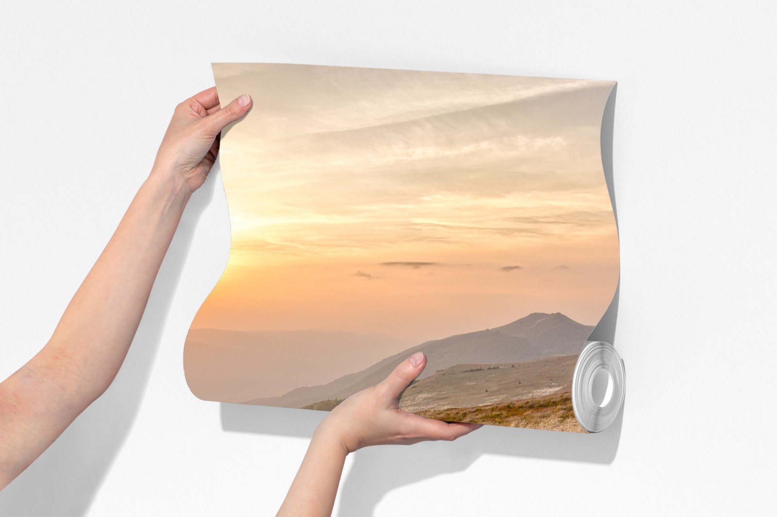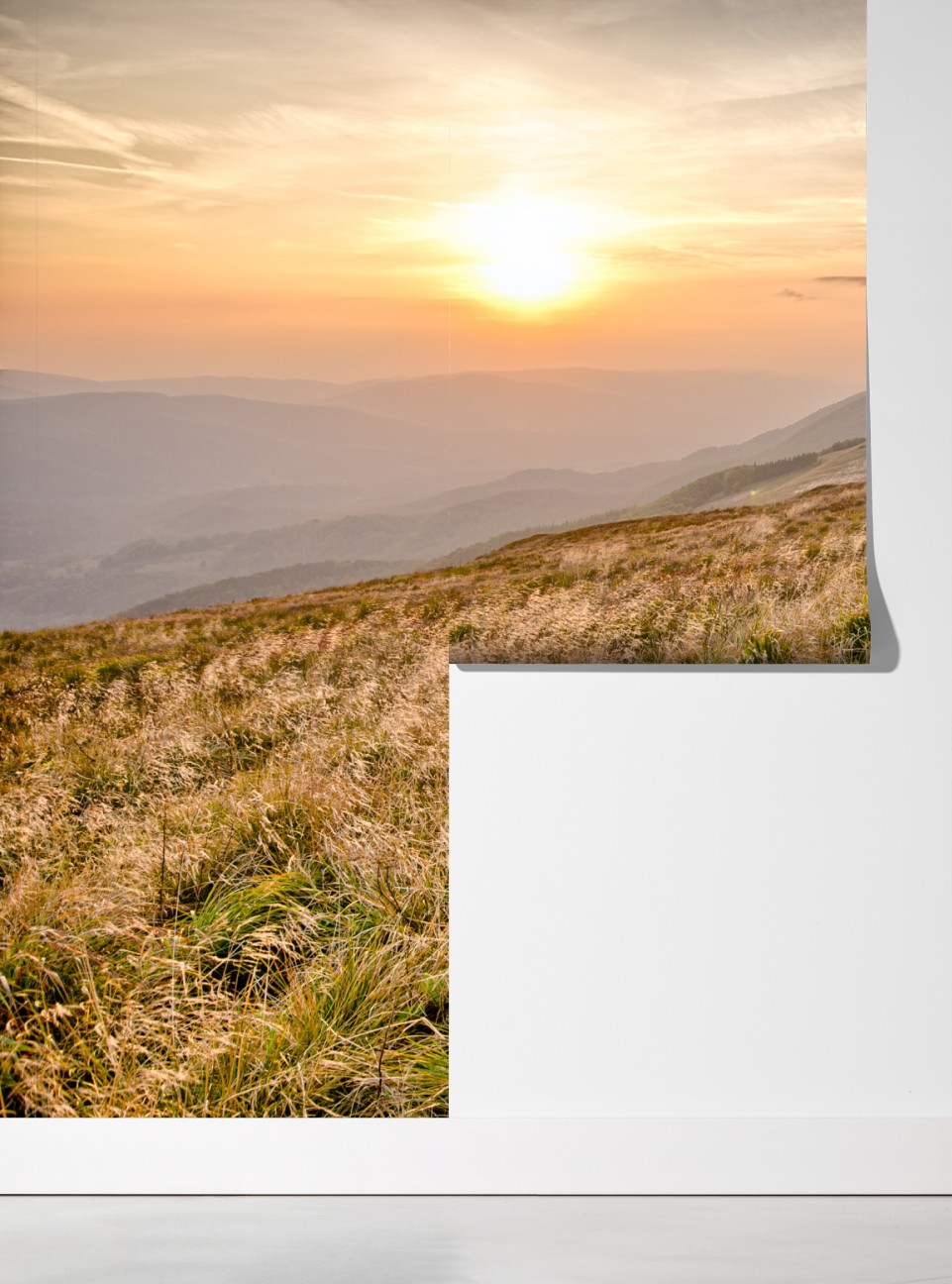 Bringen Sie die ruhige Schönheit der Bieszczady ins Zuhause mit dieser warmen Berglandschaft bei Sonnenuntergang, perfekt für eine entspannte, naturinspirierte Atmosphäre.