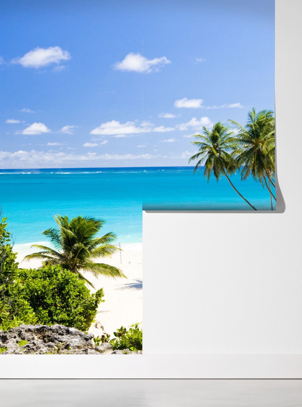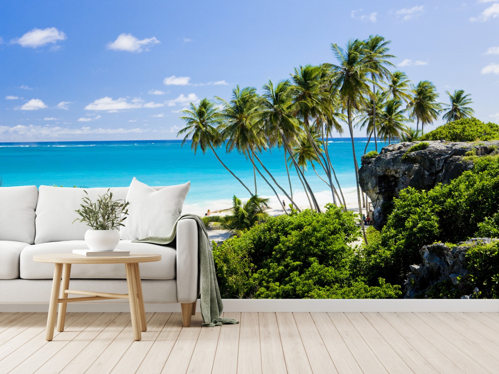 Bringen Sie die tropische Ruhe von Bottom Bay auf Barbados in Ihren Raum mit lebhaft türkisblauem Wasser, weißem Sand und sanft wiegenden Palmen.