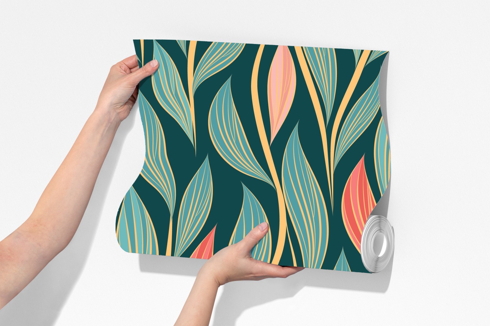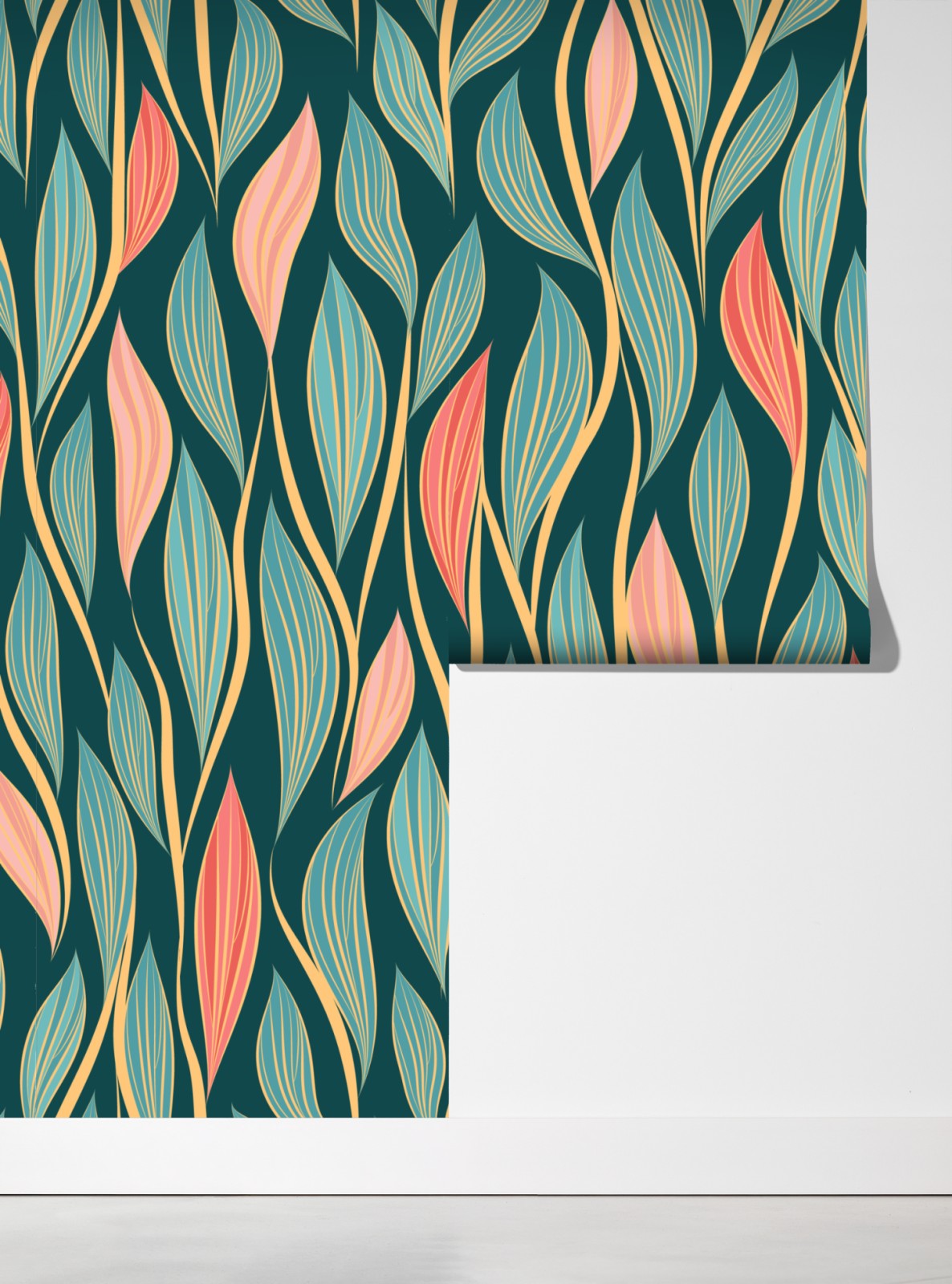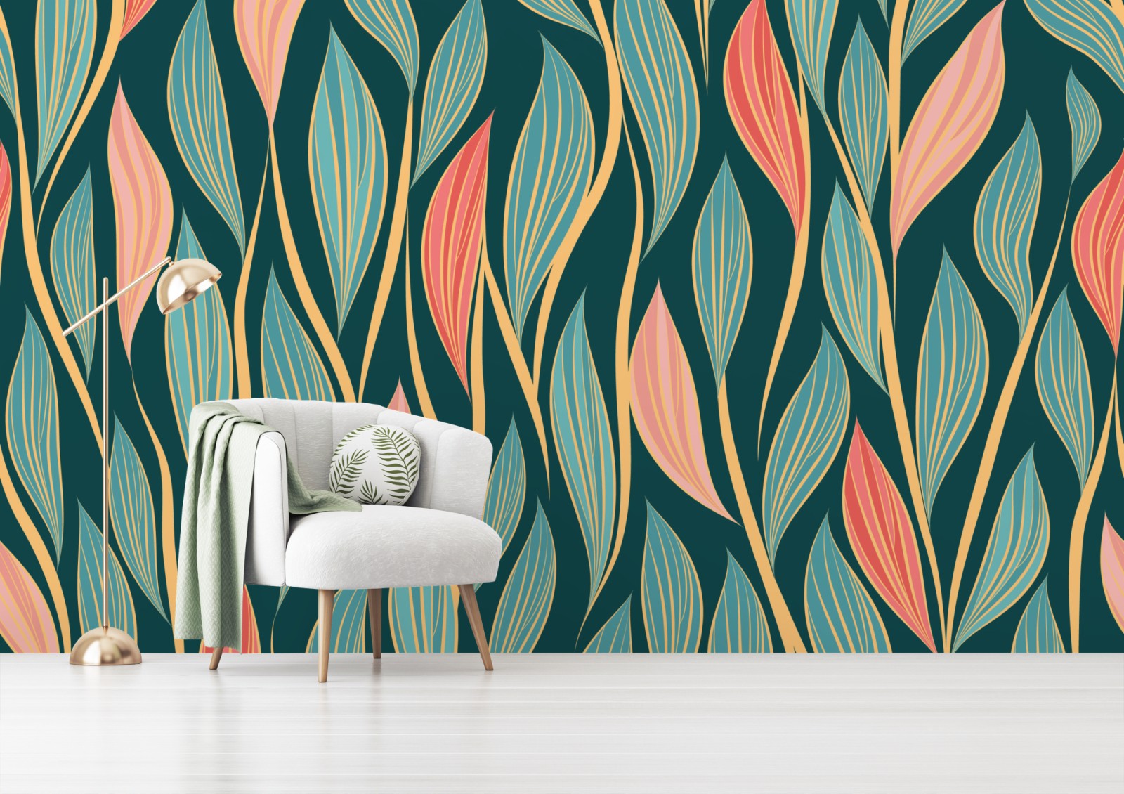 lebendiges botanisches muster mit fließenden blättern in türkis-, korallen- und goldtönen verleiht jedem raum einen modernen boho-touch.