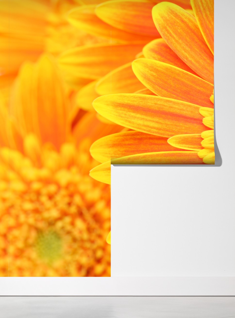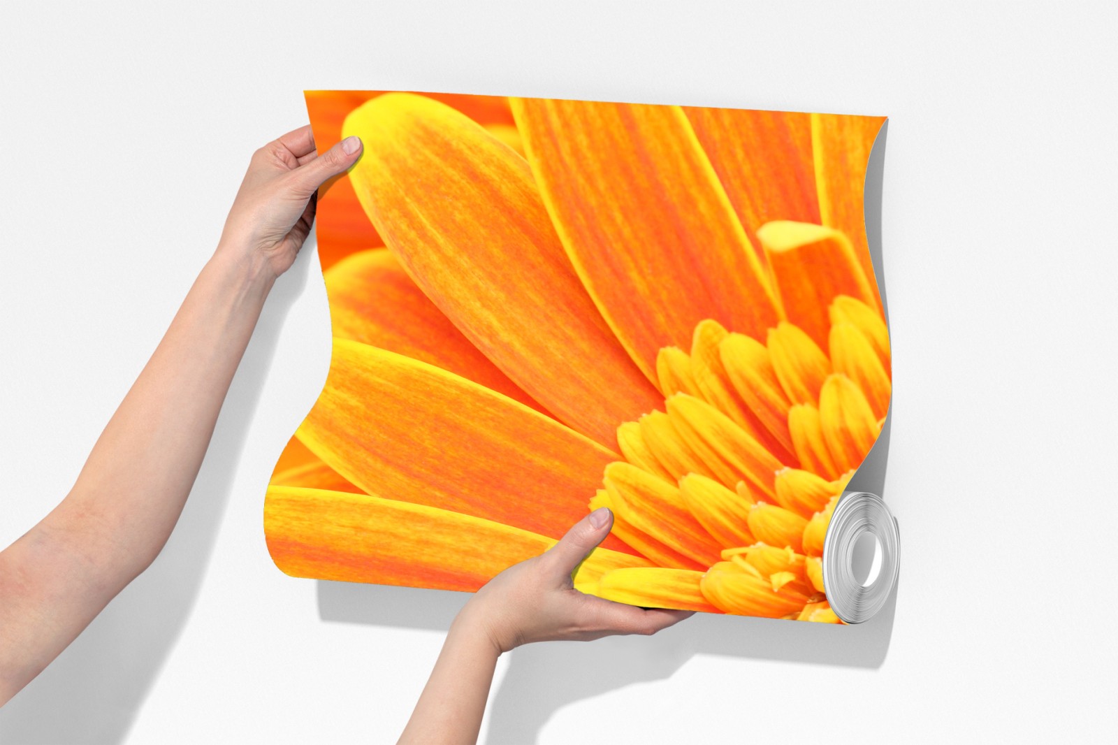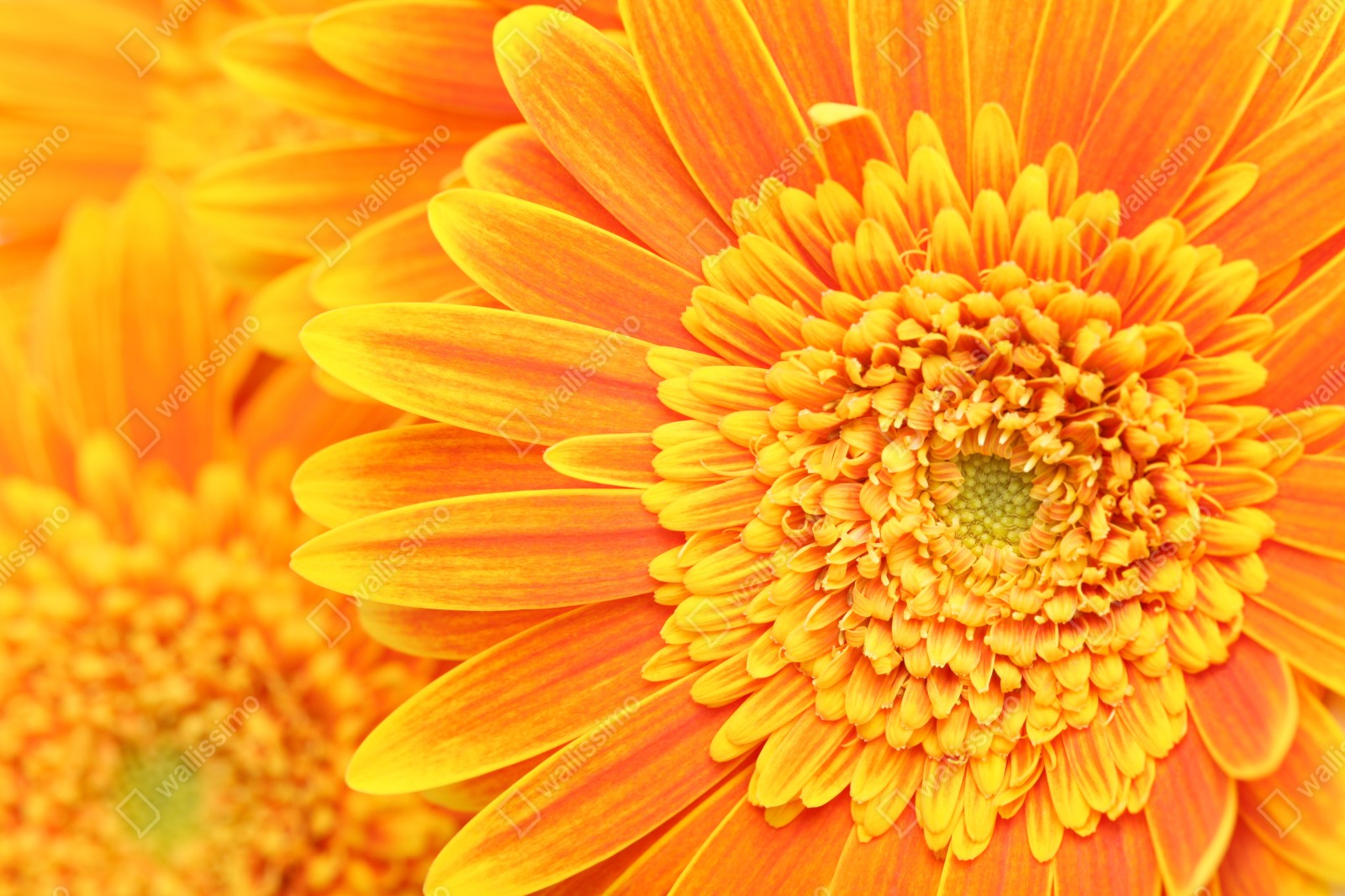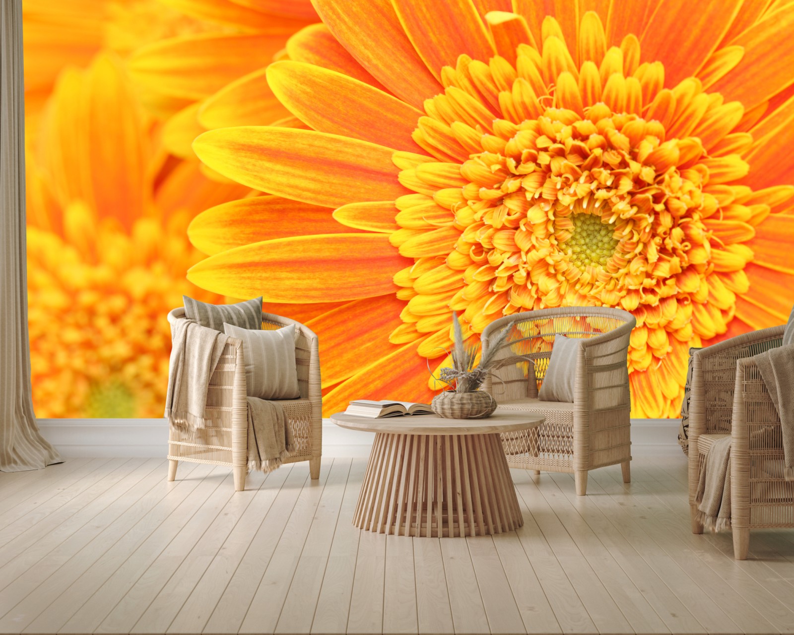 Bringen Sie lebendige Wärme in Ihr Zuhause mit einer Nahaufnahme einer leuchtend orangefarbenen Gerbera, die filigrane Blütenstrukturen und sonnige Töne zeigt.