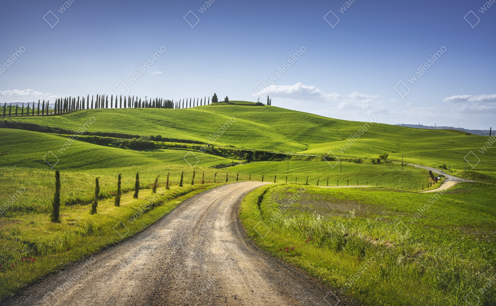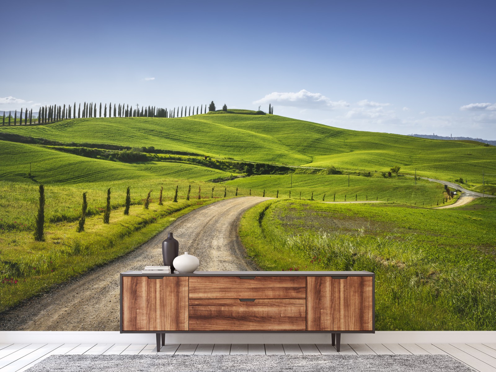 Bringen Sie die ruhige Schönheit der Toskana in Ihr Zuhause mit dieser Panoramaaufnahme einer gewundenen Landstraße durch grüne Hügel.