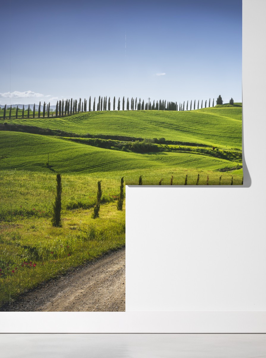 Fototapete ländliche straße in der Toskana durch grüne hügel