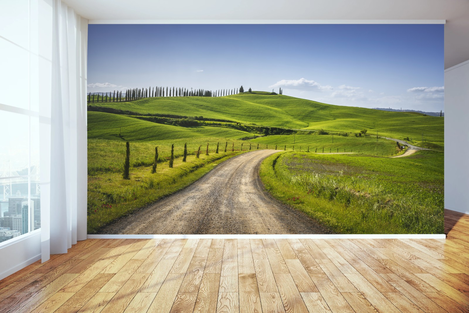 Fototapete Ländliche straße in der Toskana durch grüne hügel