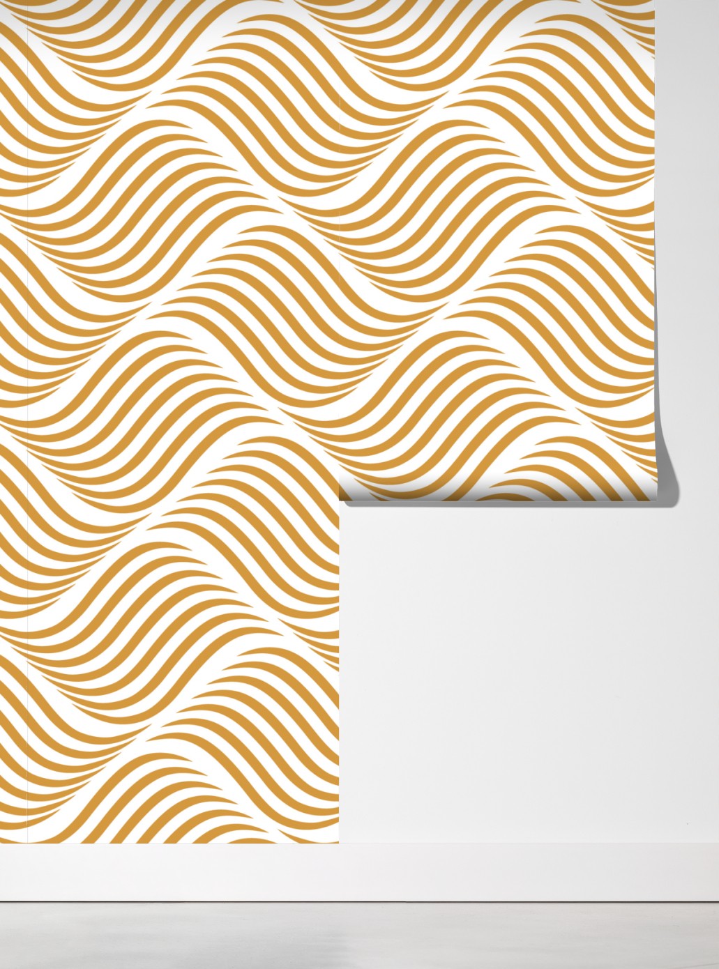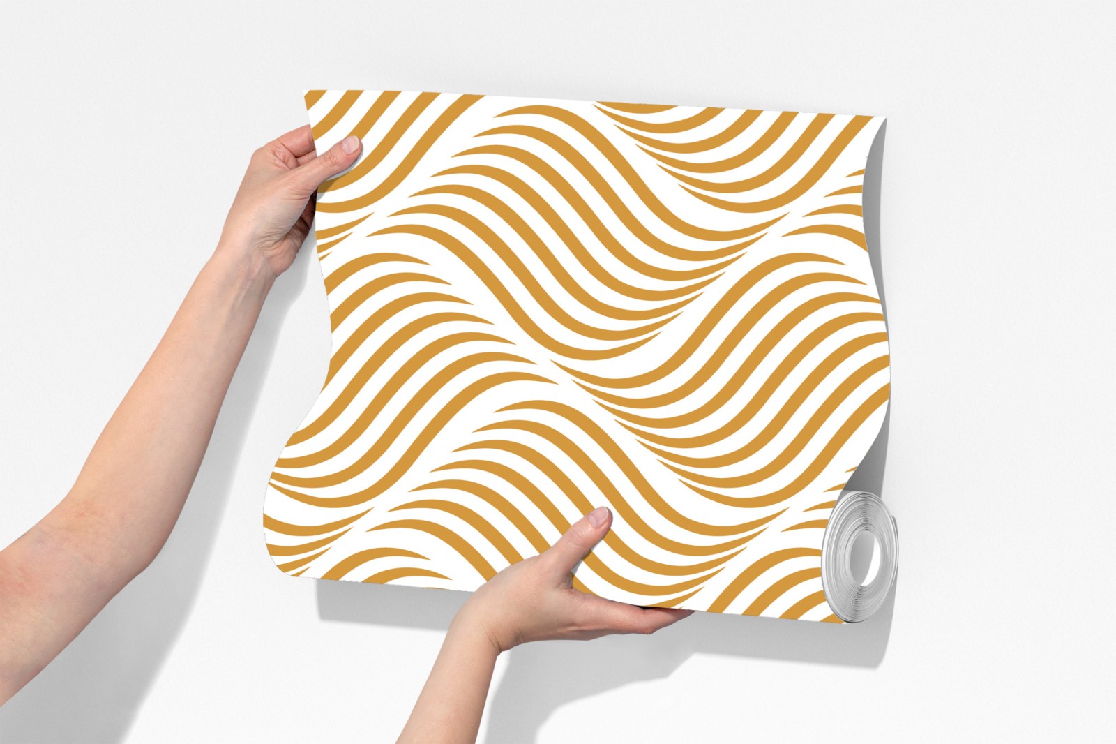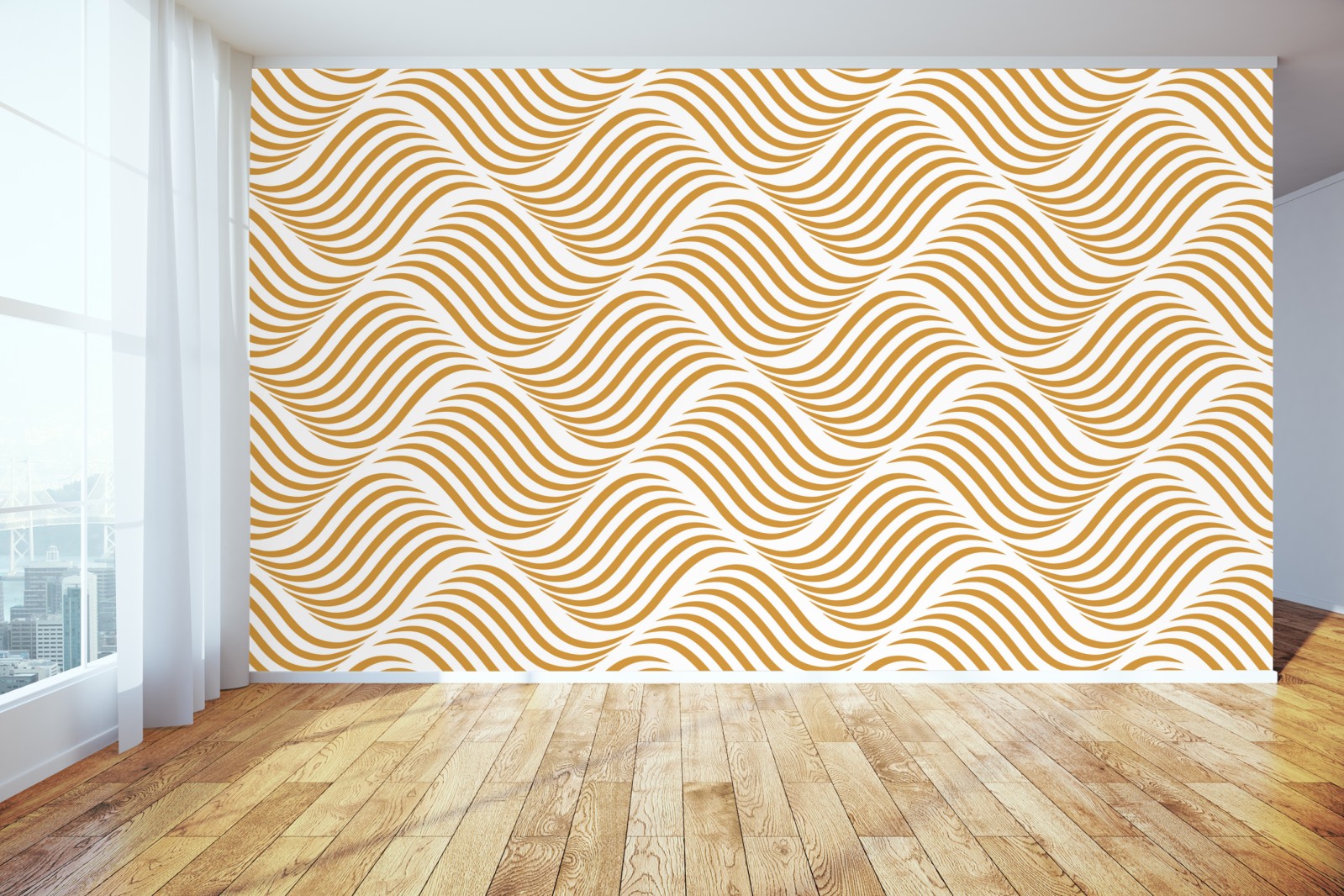 Verleihen Sie Ihrem Raum elegante Dynamik mit diesem wiederholenden goldenen Wellenmuster, ideal für Akzentwände oder gerahmte Dekoration.