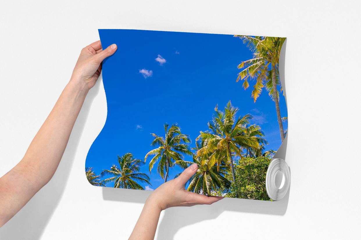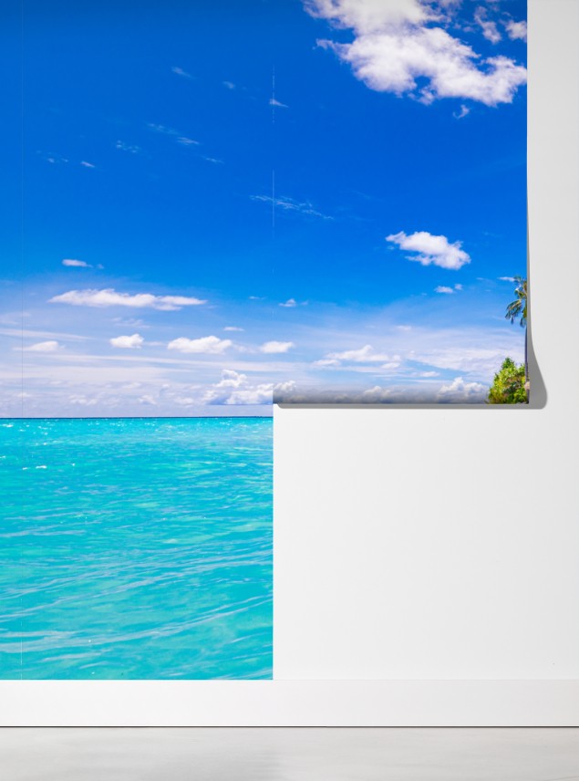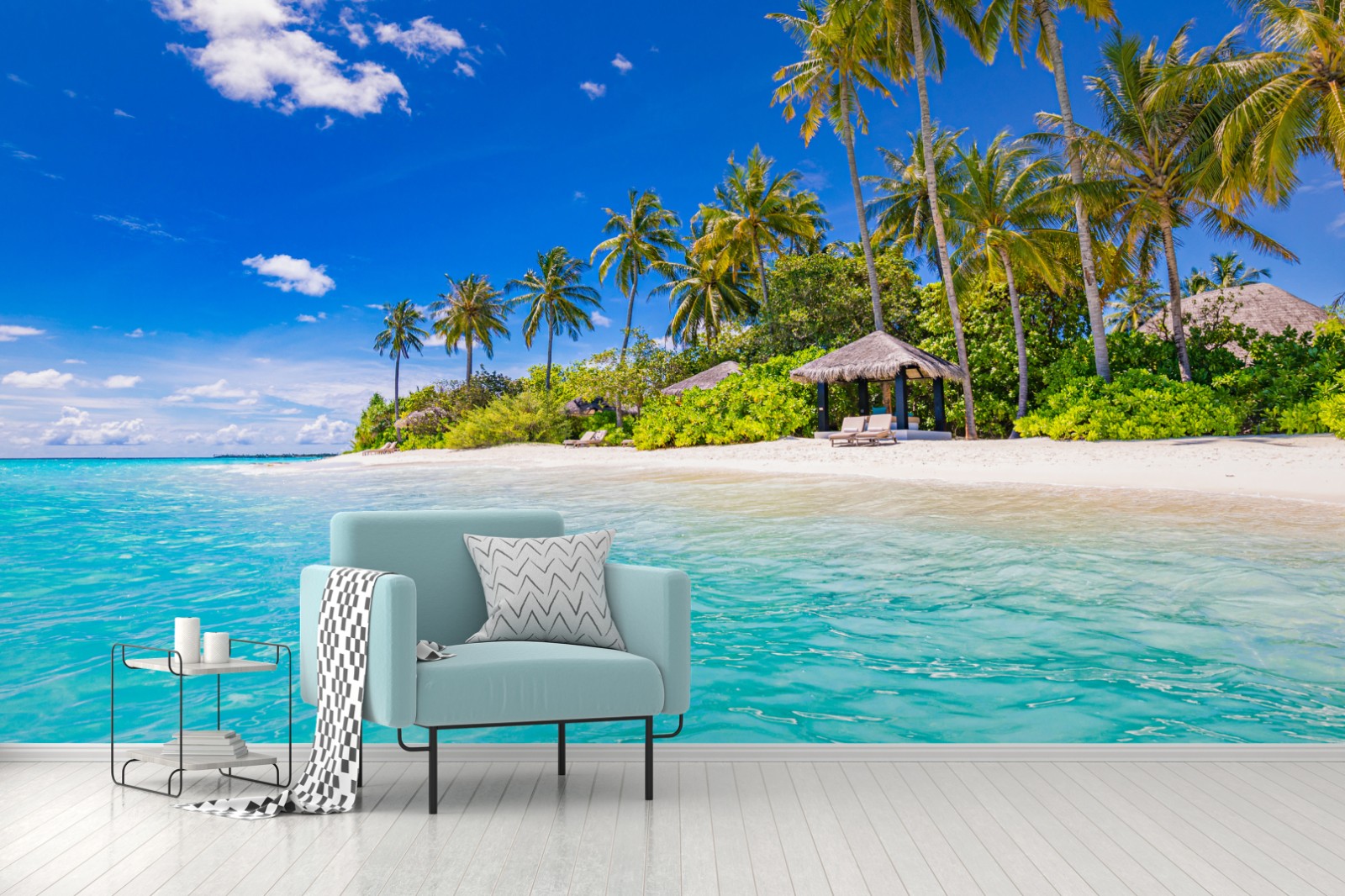 Bringen Sie die beruhigende Atmosphäre eines tropischen Strandes mit leuchtend türkisblauem Wasser und wiegenden Palmen in Ihr Zuhause.