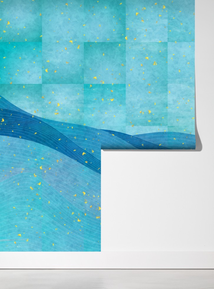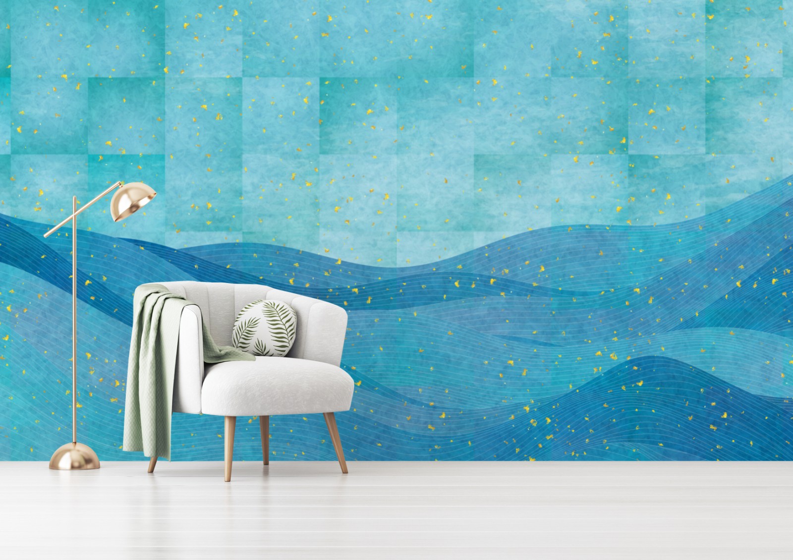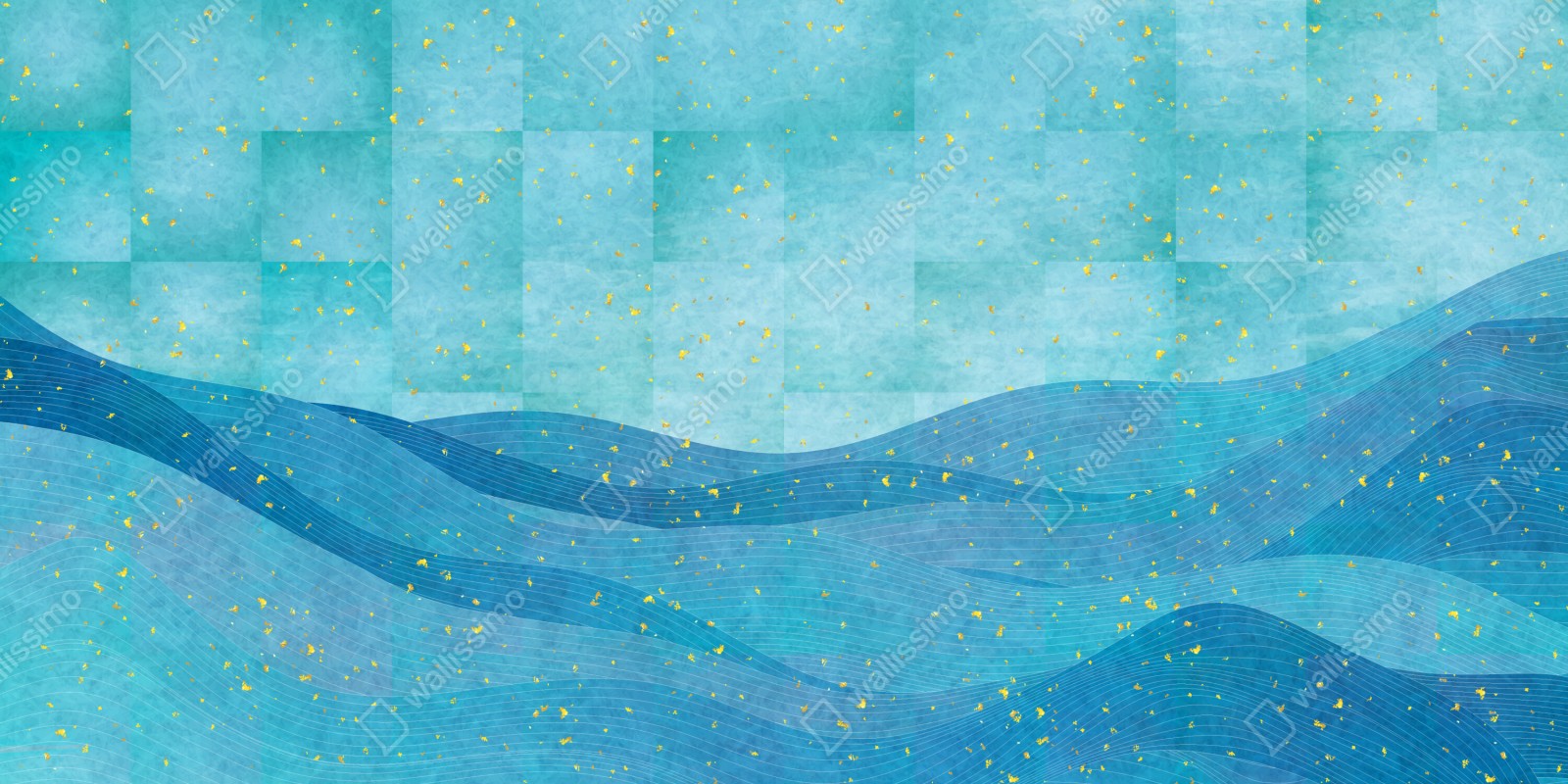 Bringen Sie mit dieser abstrakten türkisen Wellenkomposition mit goldenen Akzenten beruhigende Meeresstimmung in Ihr Zuhause.
