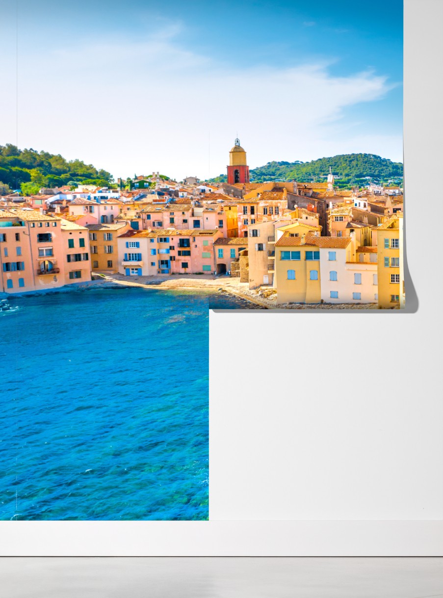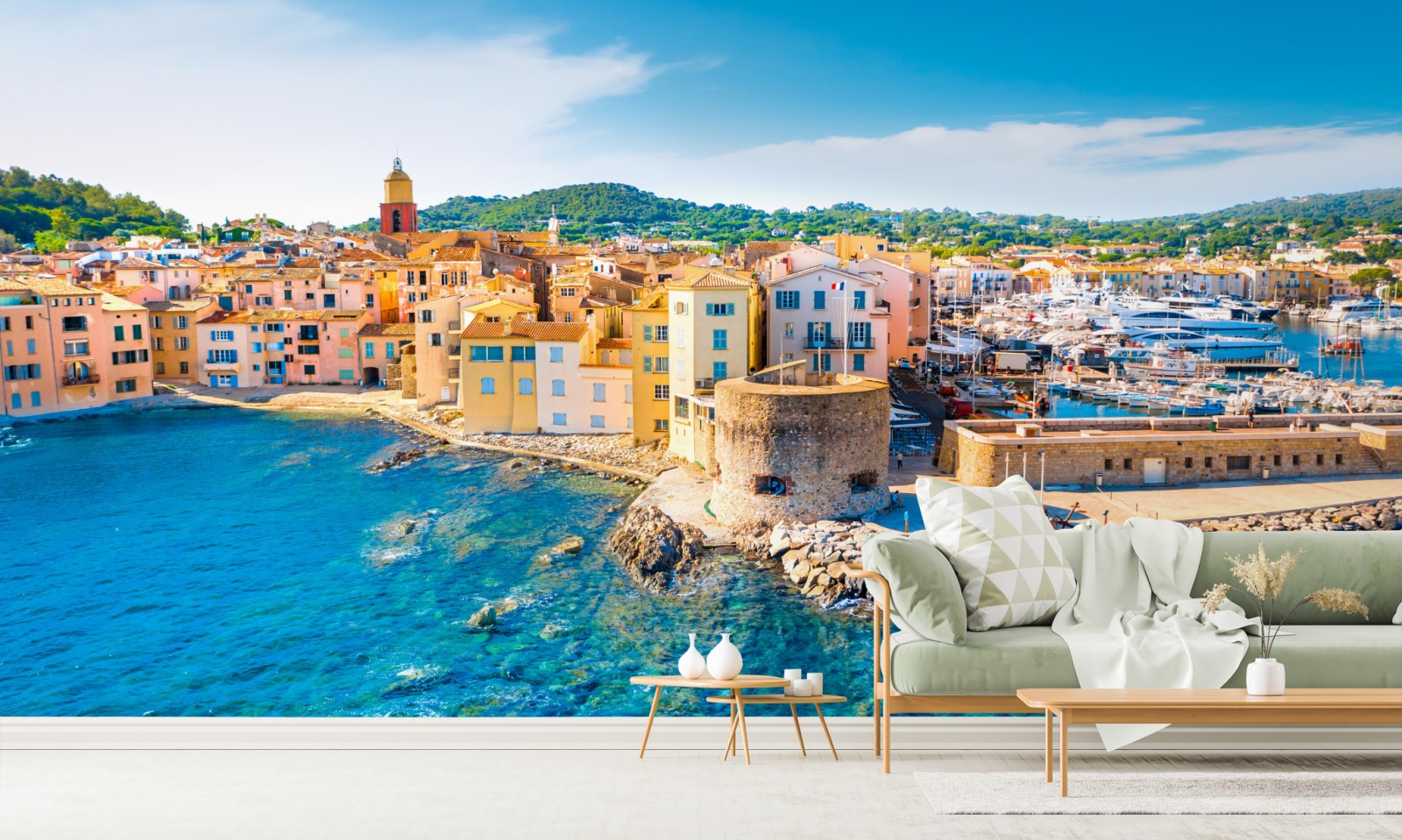 Bringen Sie mediterranes Flair an Ihre Wände mit einer lebendigen Aufnahme eines sonnigen Hafens und kristallblauem Wasser.