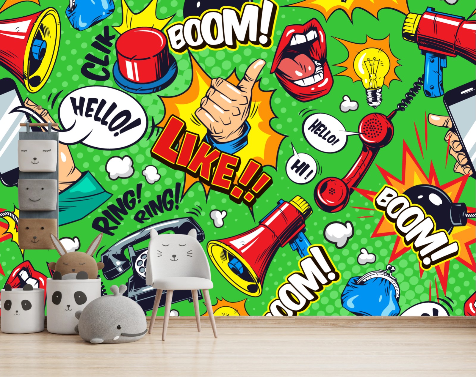 Lebhafter comic-pop-art-stil mit dynamischen ikonen und sprechblasen, der jeden raum belebt.MehrWeniger