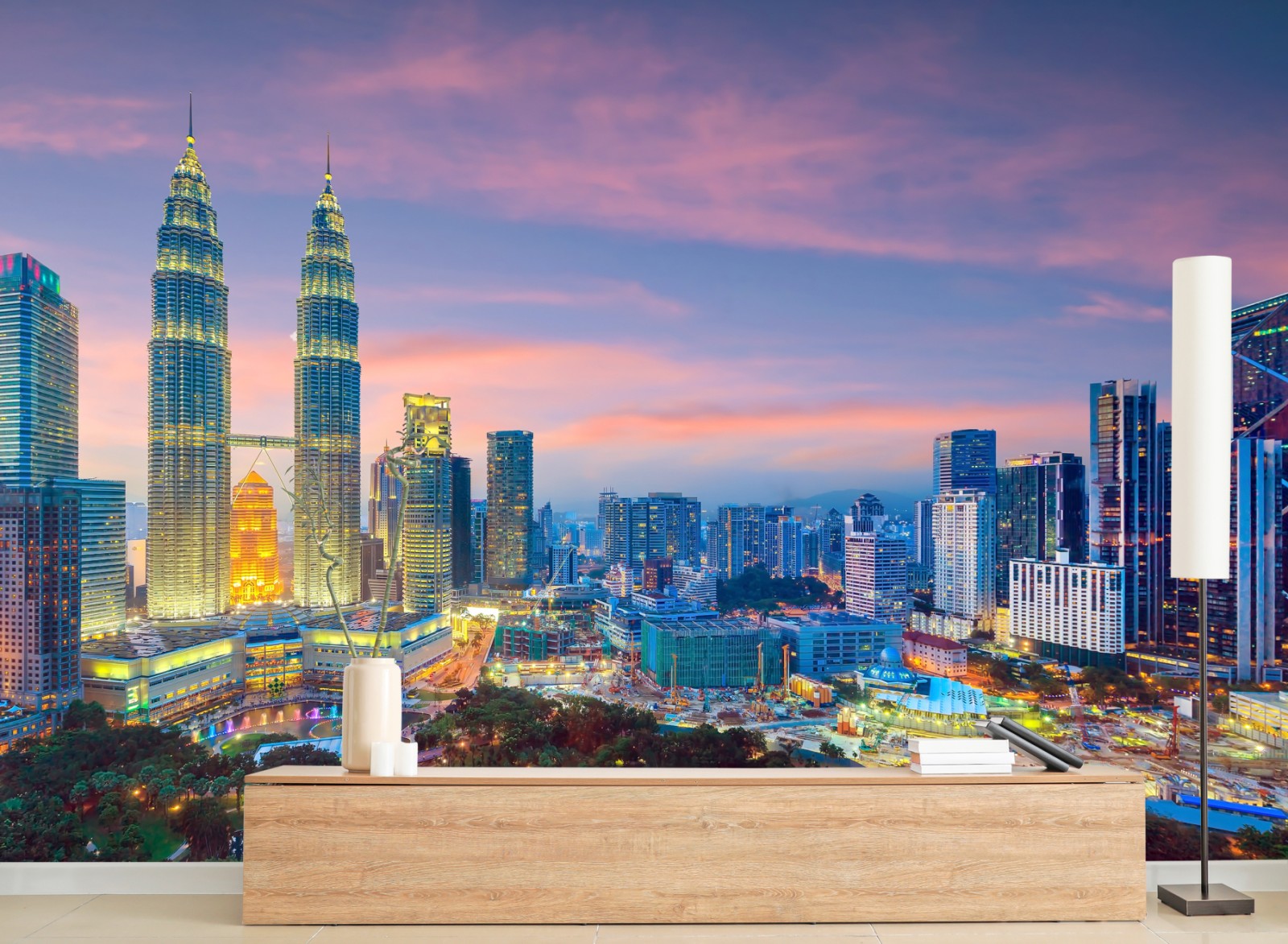 Erleben Sie das lebendige Dämmerungslicht von Kuala Lumpur mit dieser Panorama-Stadtansicht, die urbane Energie und beruhigende Farbtöne an Ihre Wand bringt.