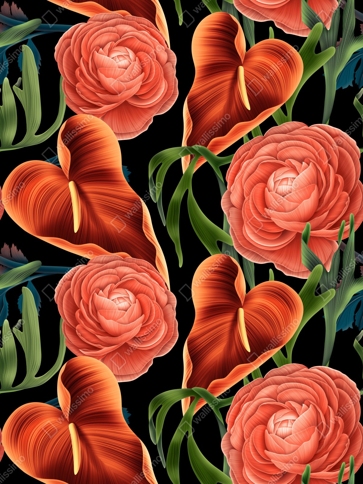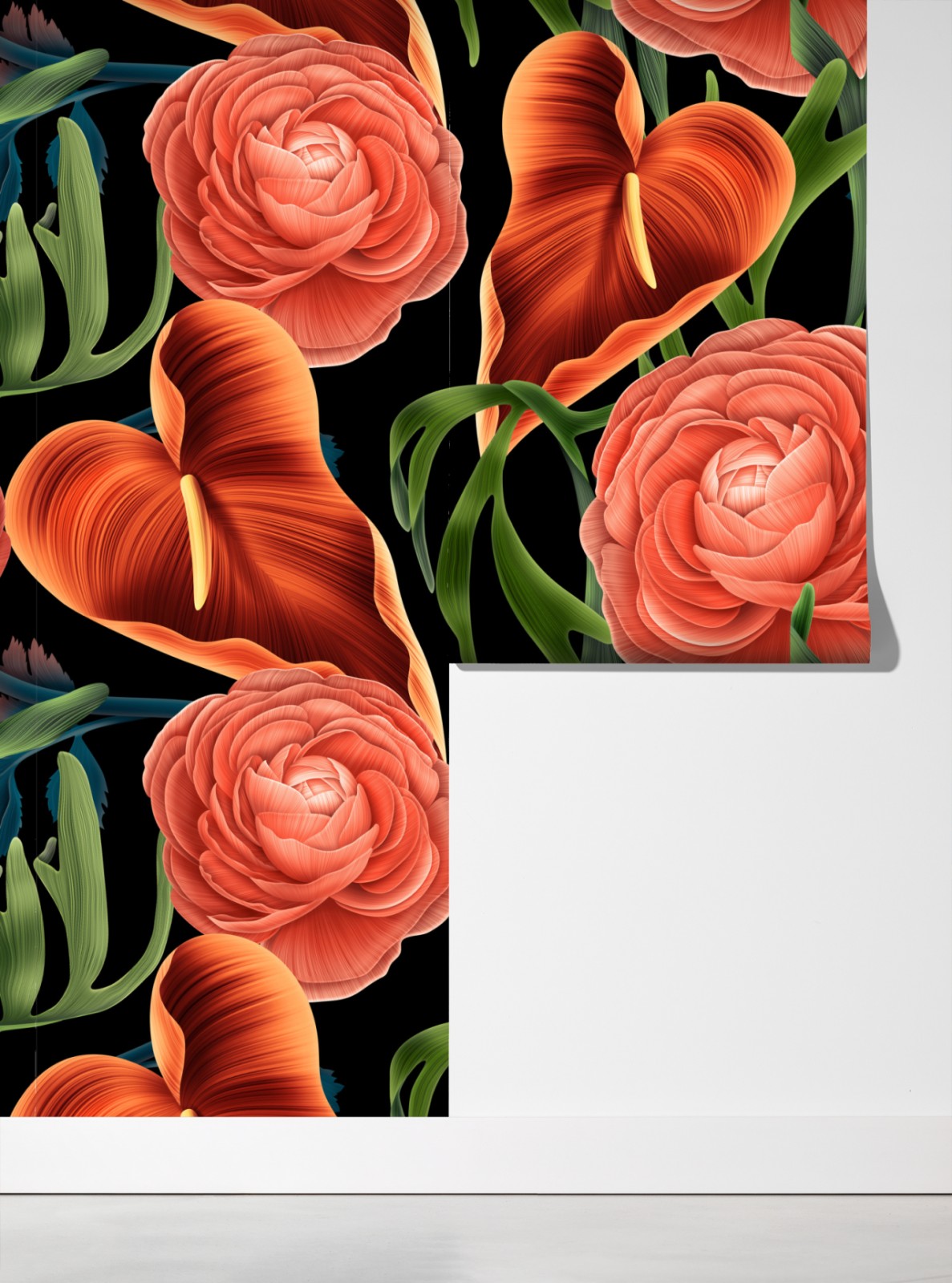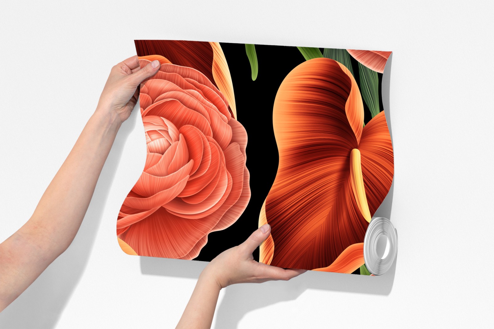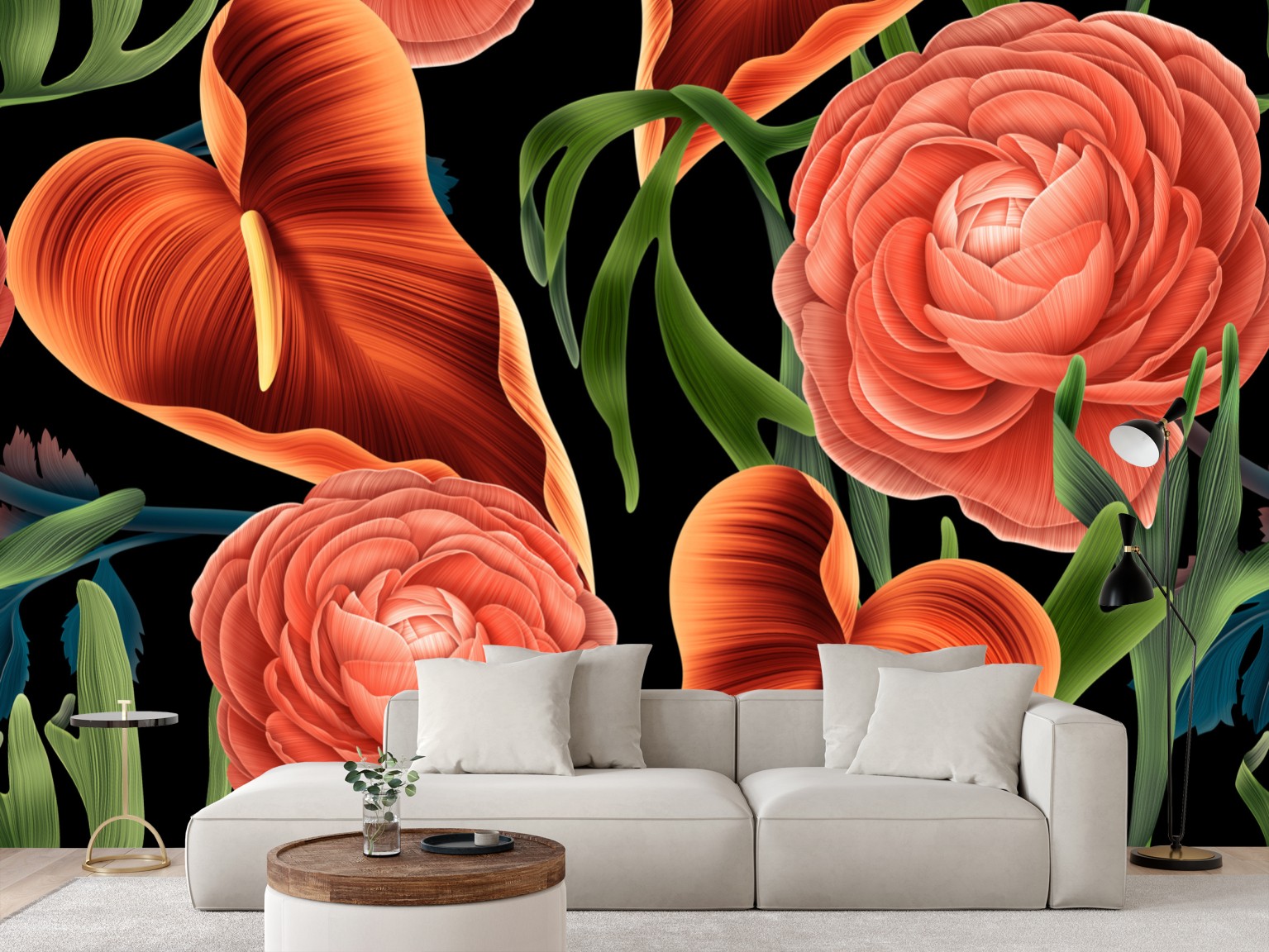 Bringen Sie kräftige botanische Eleganz in Ihr Zuhause mit diesem lebhaften korallenfarbigen Blumenmotiv auf tiefschwarzem Hintergrund, perfekt für moderne Räume.