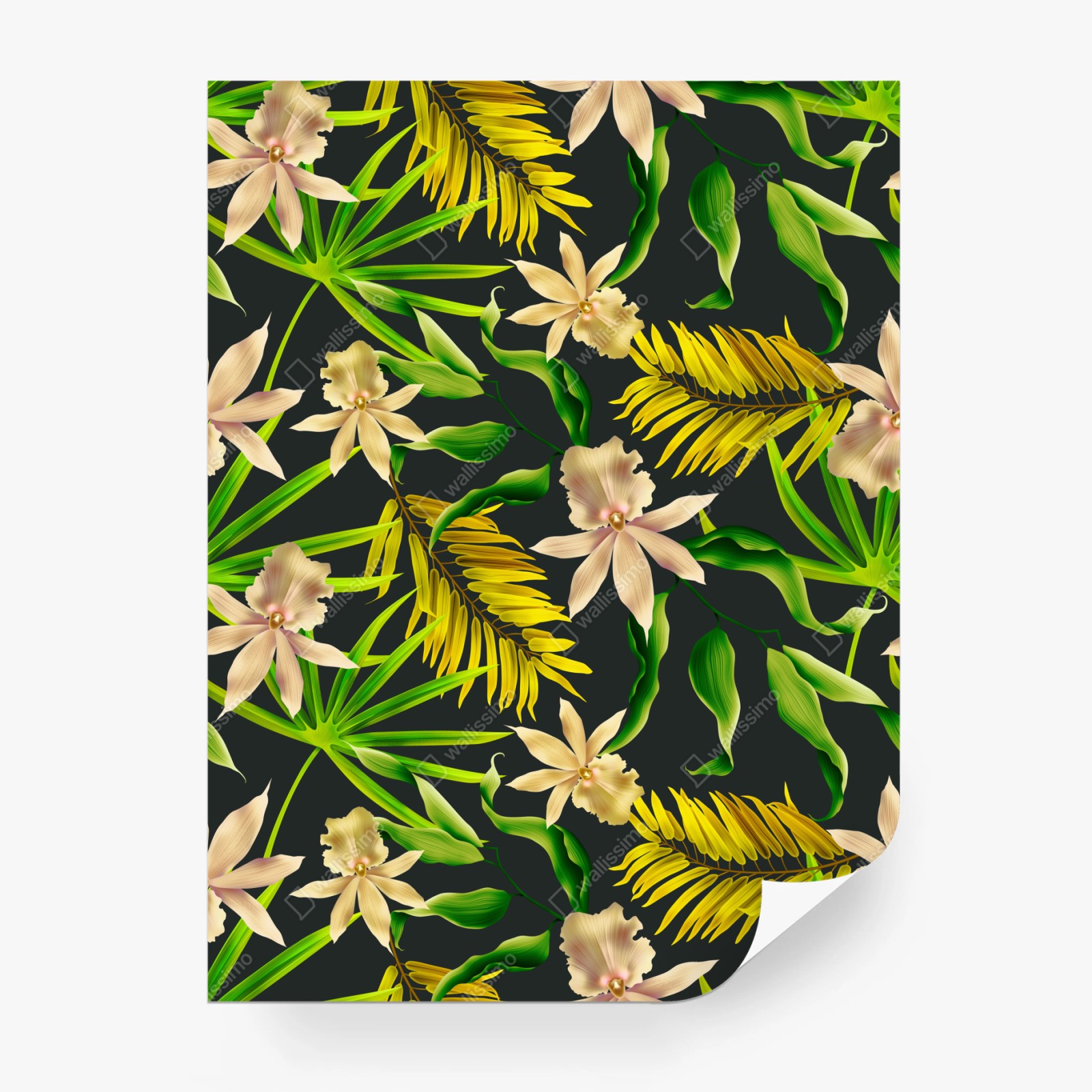 Fototapete Tropisches orchideenmuster auf dunklem hintergrund