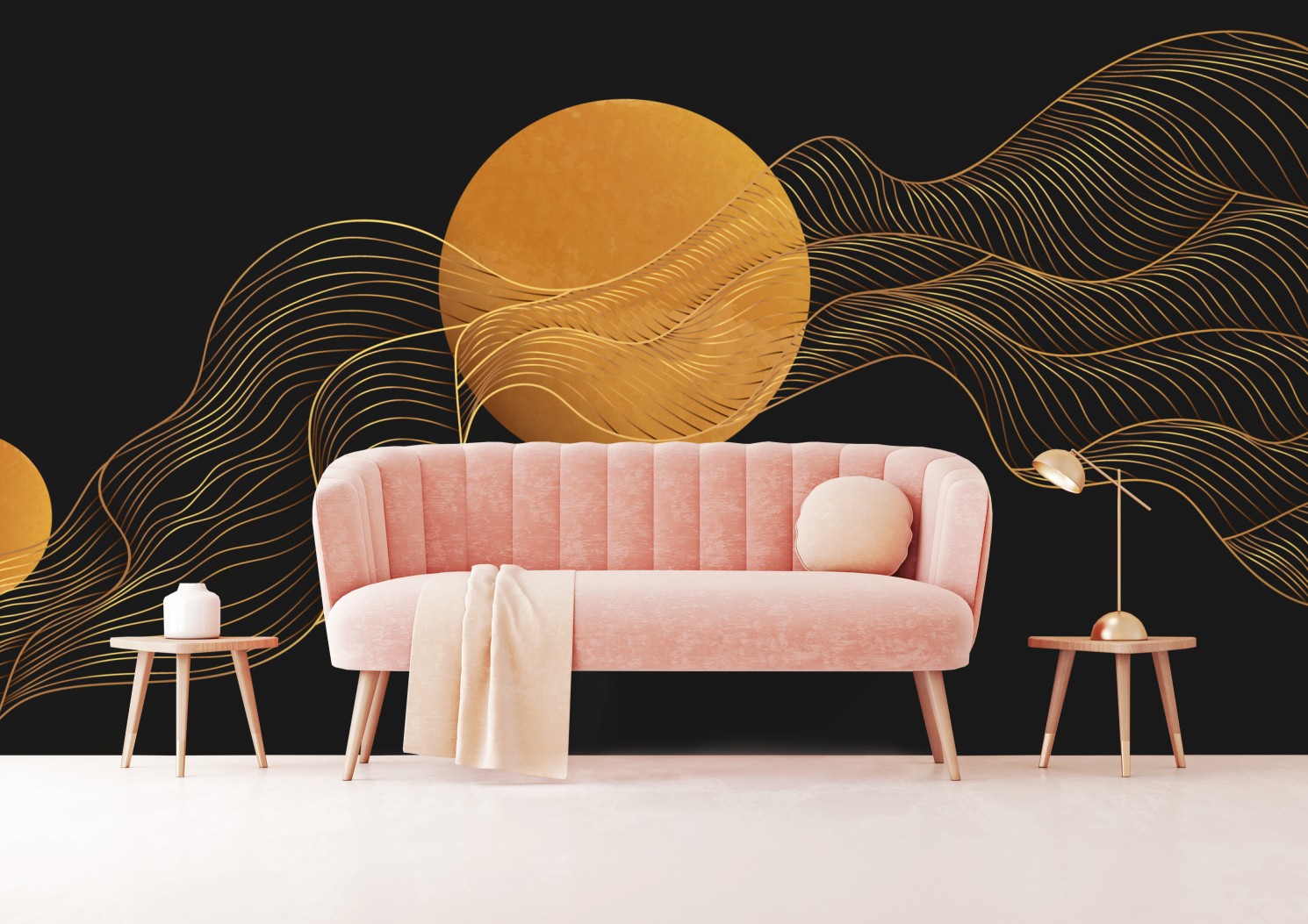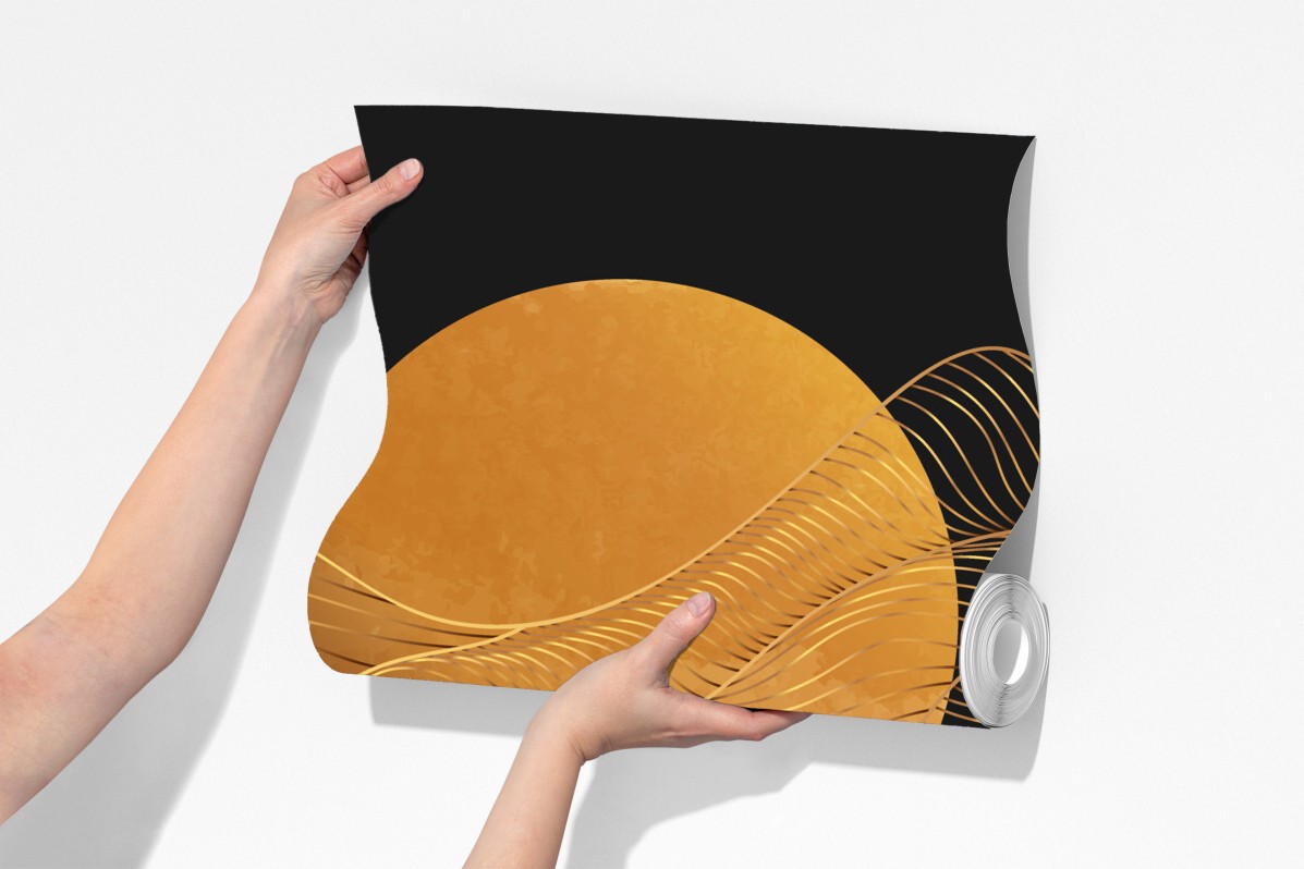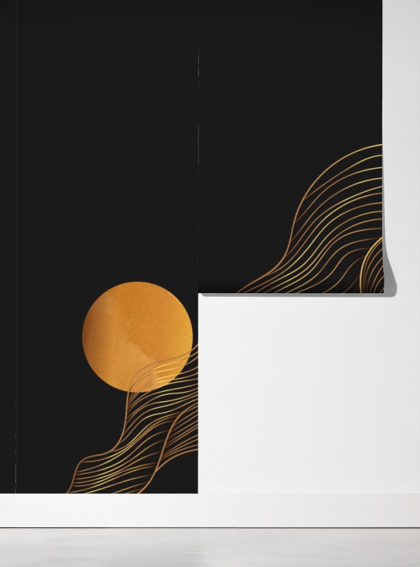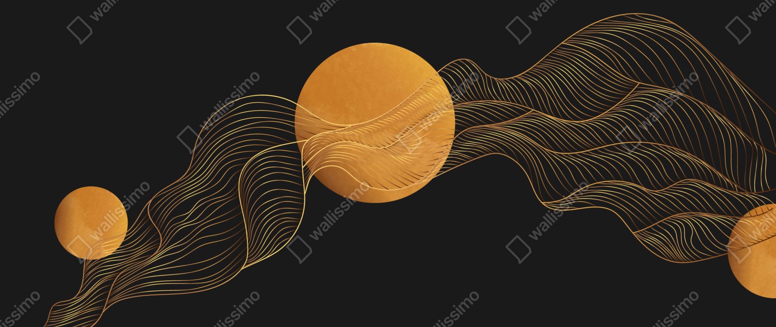 Verleihen Sie Ihrem Raum eine elegante gold-schwarze abstrakte Komposition mit fließenden Linien und geometrischen Kreisen, ideal für moderne und Art deco Interieurs.