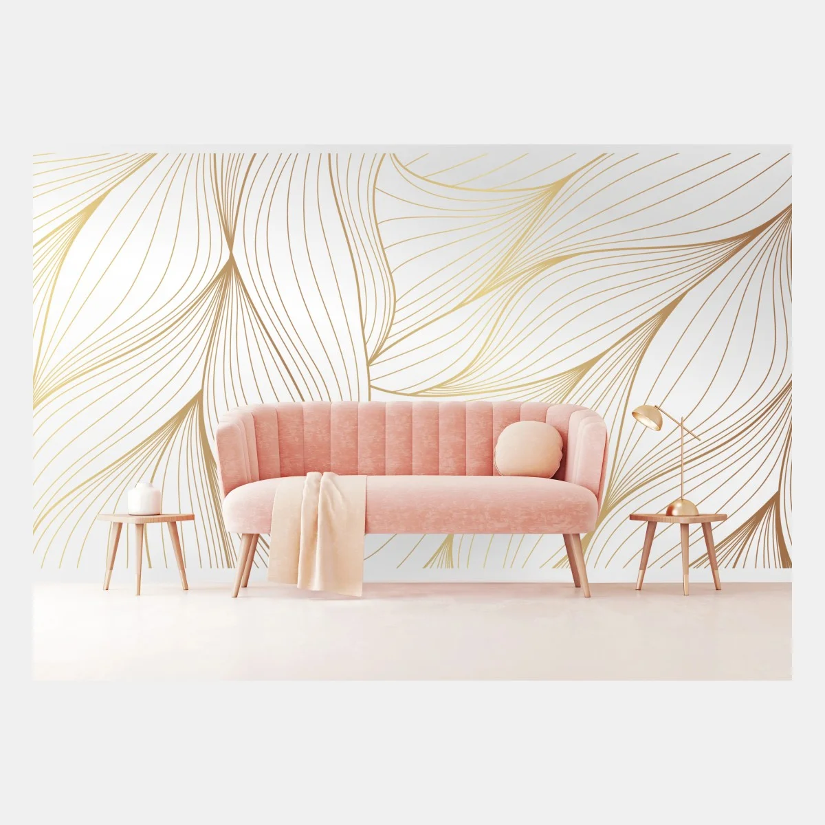 Elegantes abstraktes Design mit feinen goldenen Linien auf weißem Hintergrund, das jedem Raum moderne Raffinesse verleiht.MehrWeniger