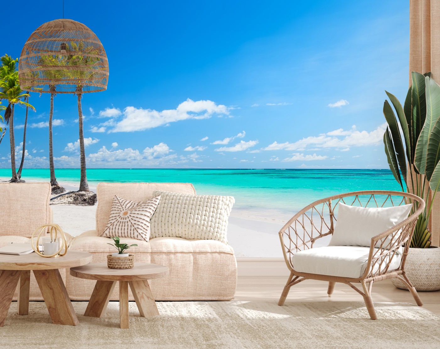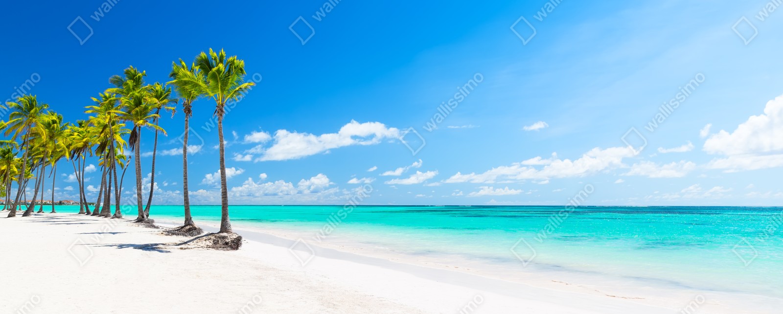 Bringen Sie die ruhige Schönheit des weißen Sandes und des türkisfarbenen Wassers von Punta Cana mit dieser panoramischen tropischen Strandaufnahme in Ihr Zuhause.