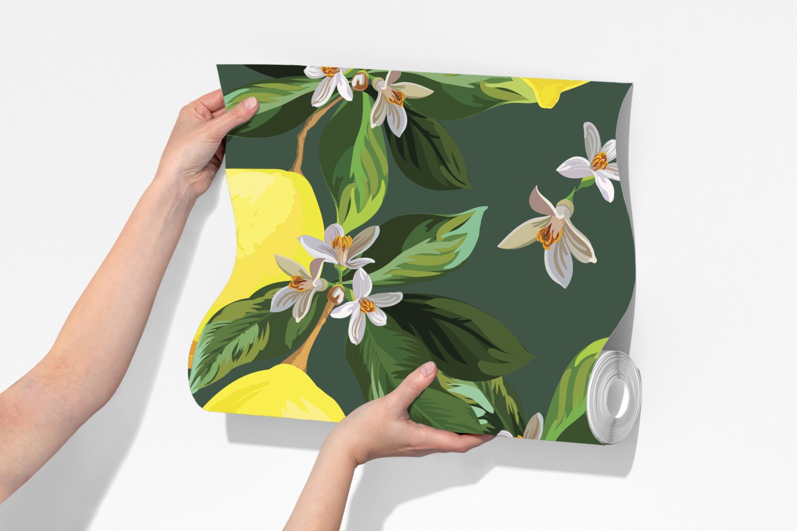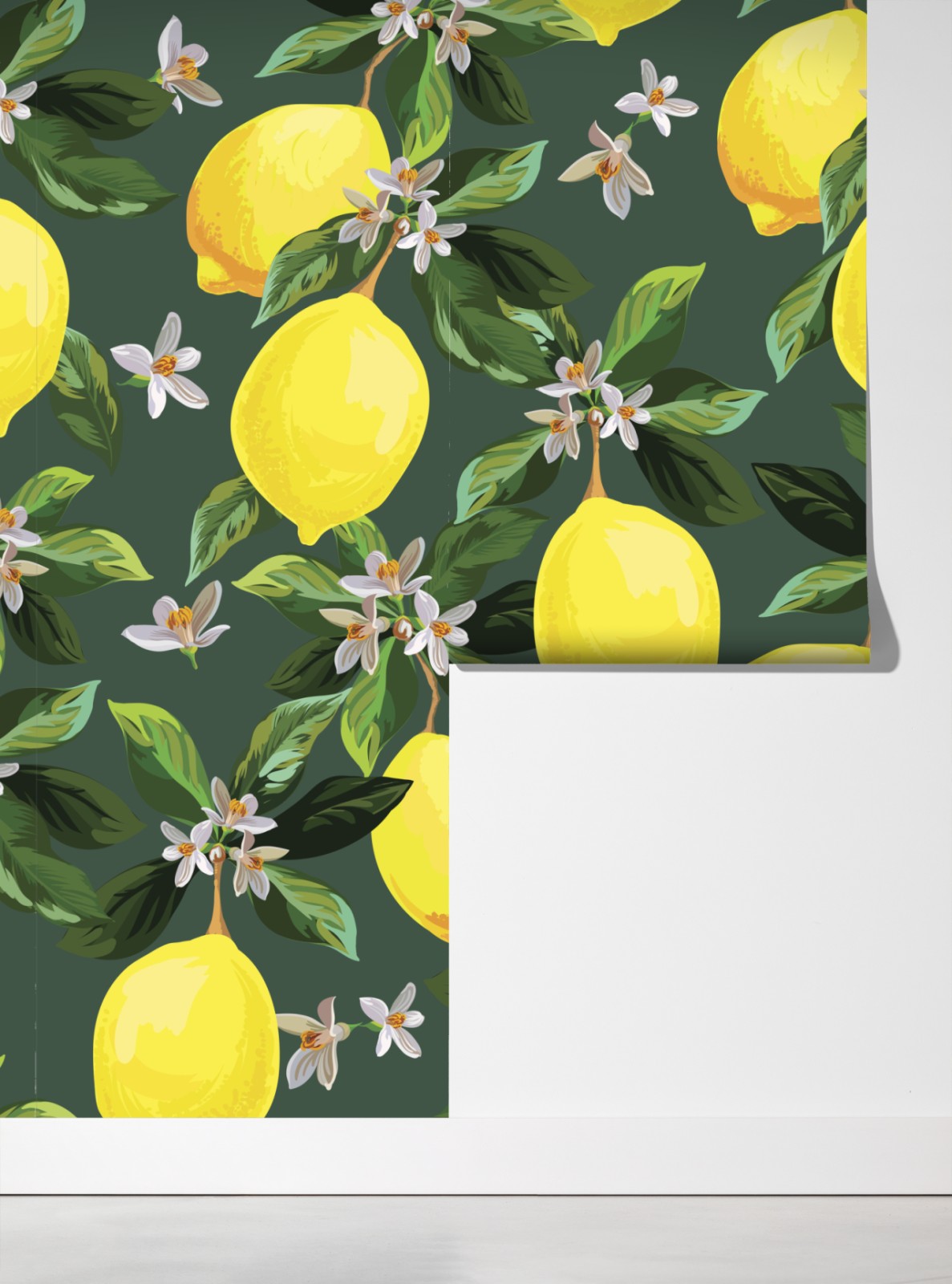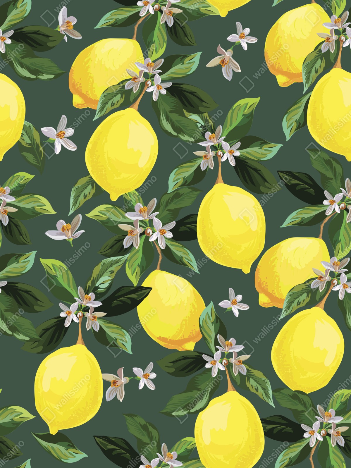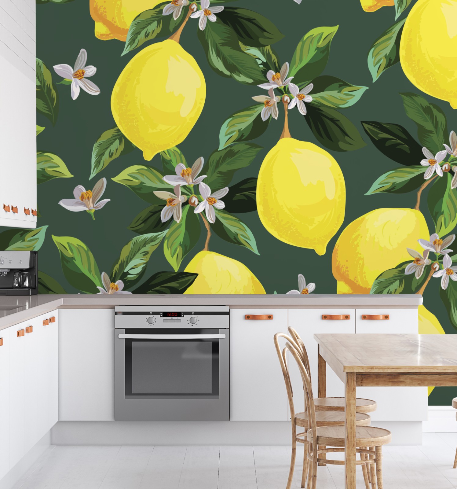 Verleihen Sie Ihrem Raum frischen, sonnigen Charme mit dieser lebendigen Illustration von Zitronen und Blüten auf dunkelgrünem Hintergrund, ideal für die Küche.
