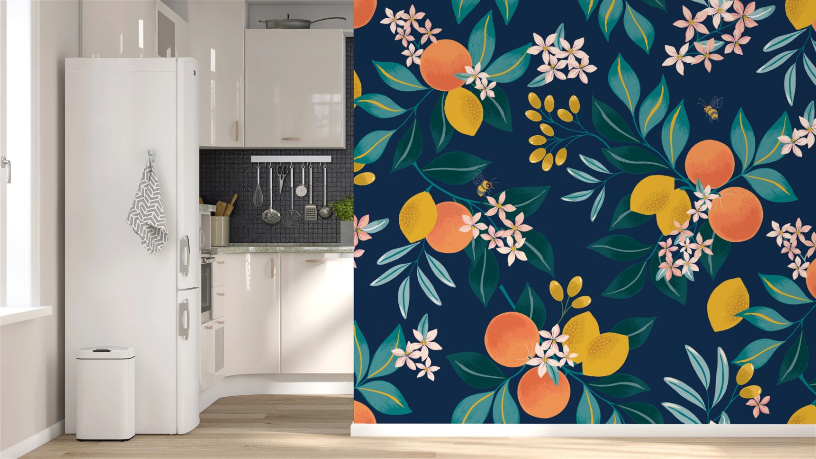 Bringen Sie frische, lebendige Zitrusblüten in Ihren Raum mit diesem illustrierten botanischen Design auf tiefem Marineblau.MehrWeniger