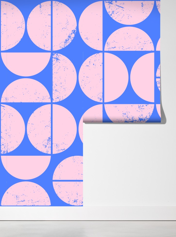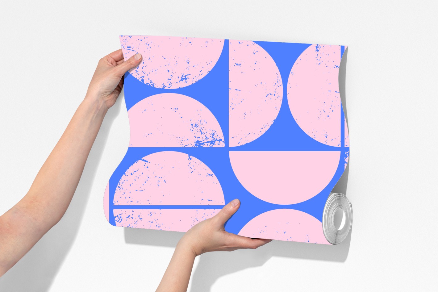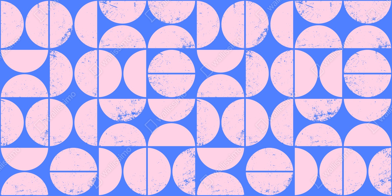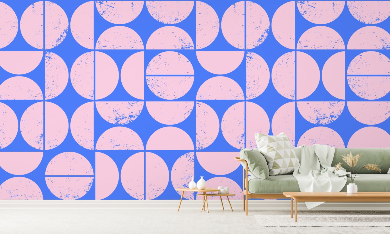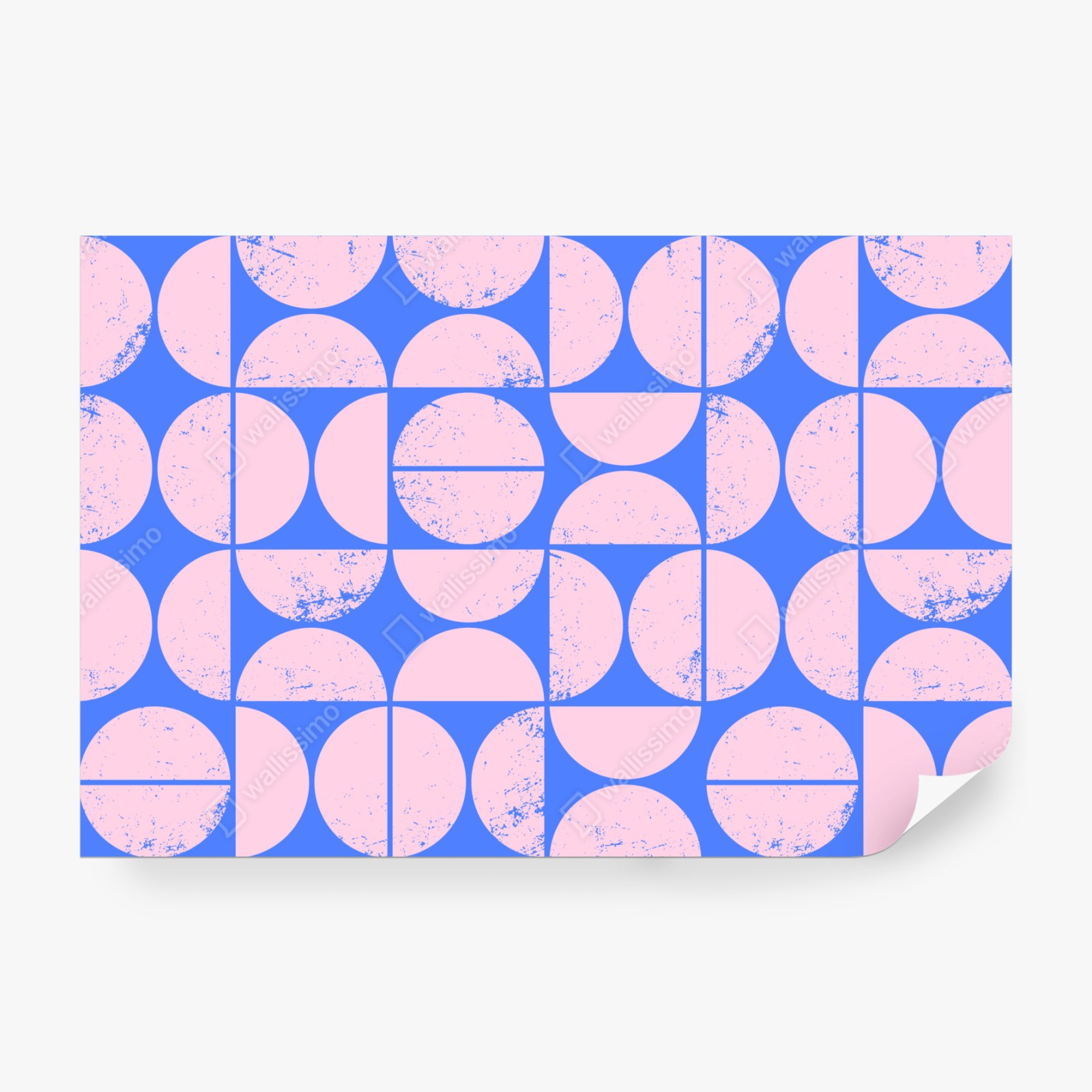 Verleihen Sie Ihrem Raum einen modernen Retro-Touch mit einem pastellfarbenen geometrischen Kreismuster aus rosa Formen auf blauem Hintergrund.