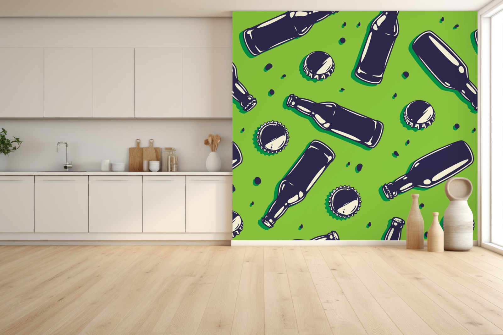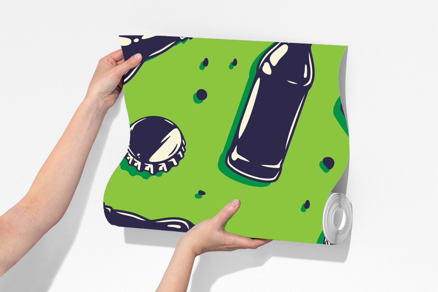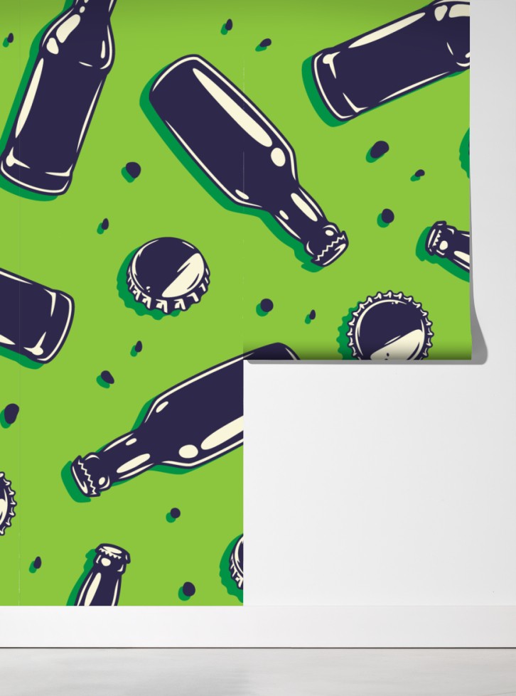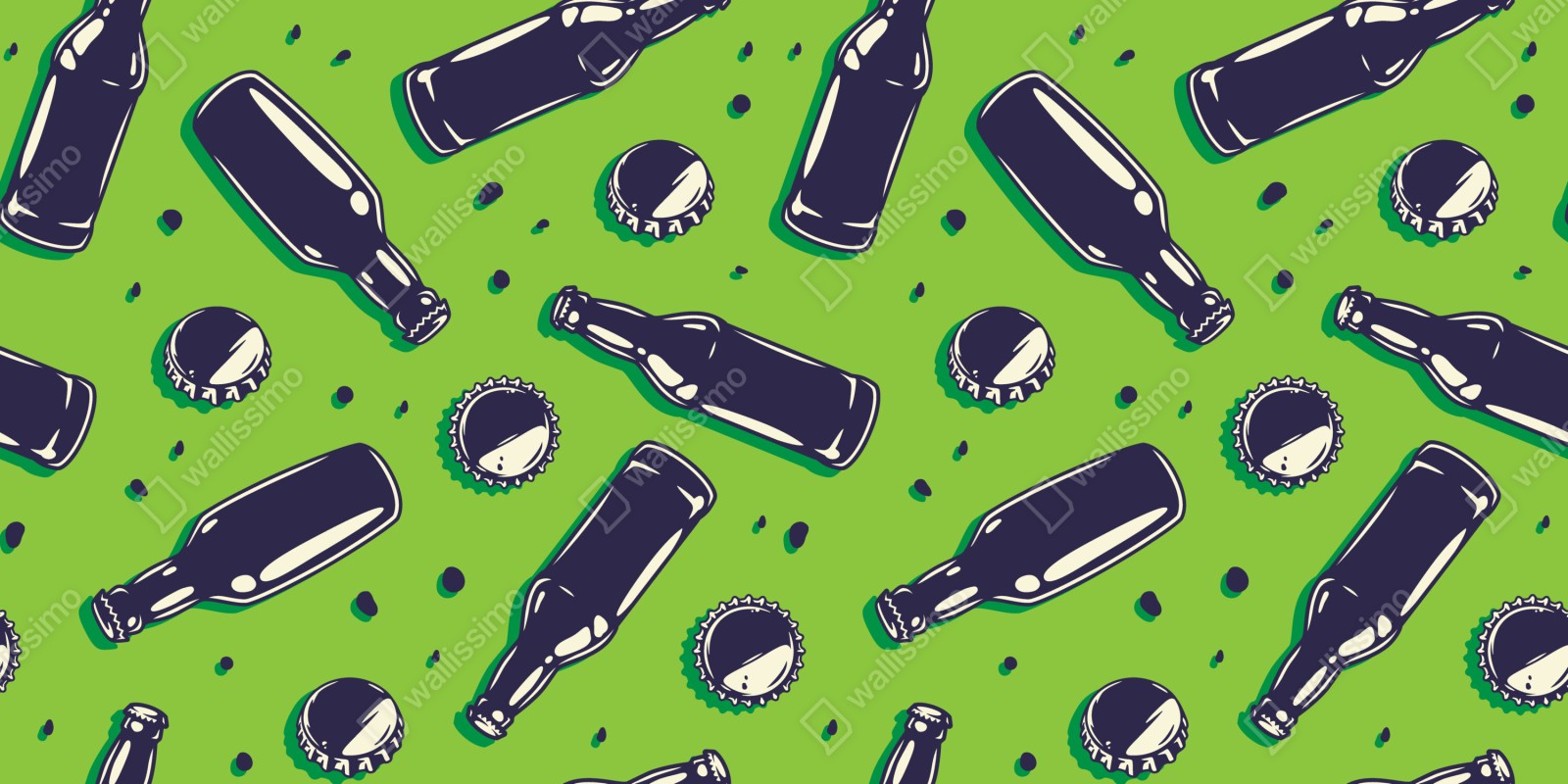 Lebhaftes Pop-Art-Muster mit Bierflaschen und Kronkorken auf kräftigem grün bringt einen verspielten, modernen Akzent in Küche oder Bar.