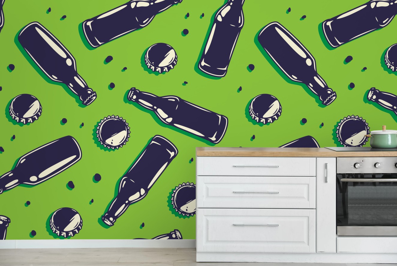 Fototapete Grünes pop-art-muster mit bierflaschen und kronkorken