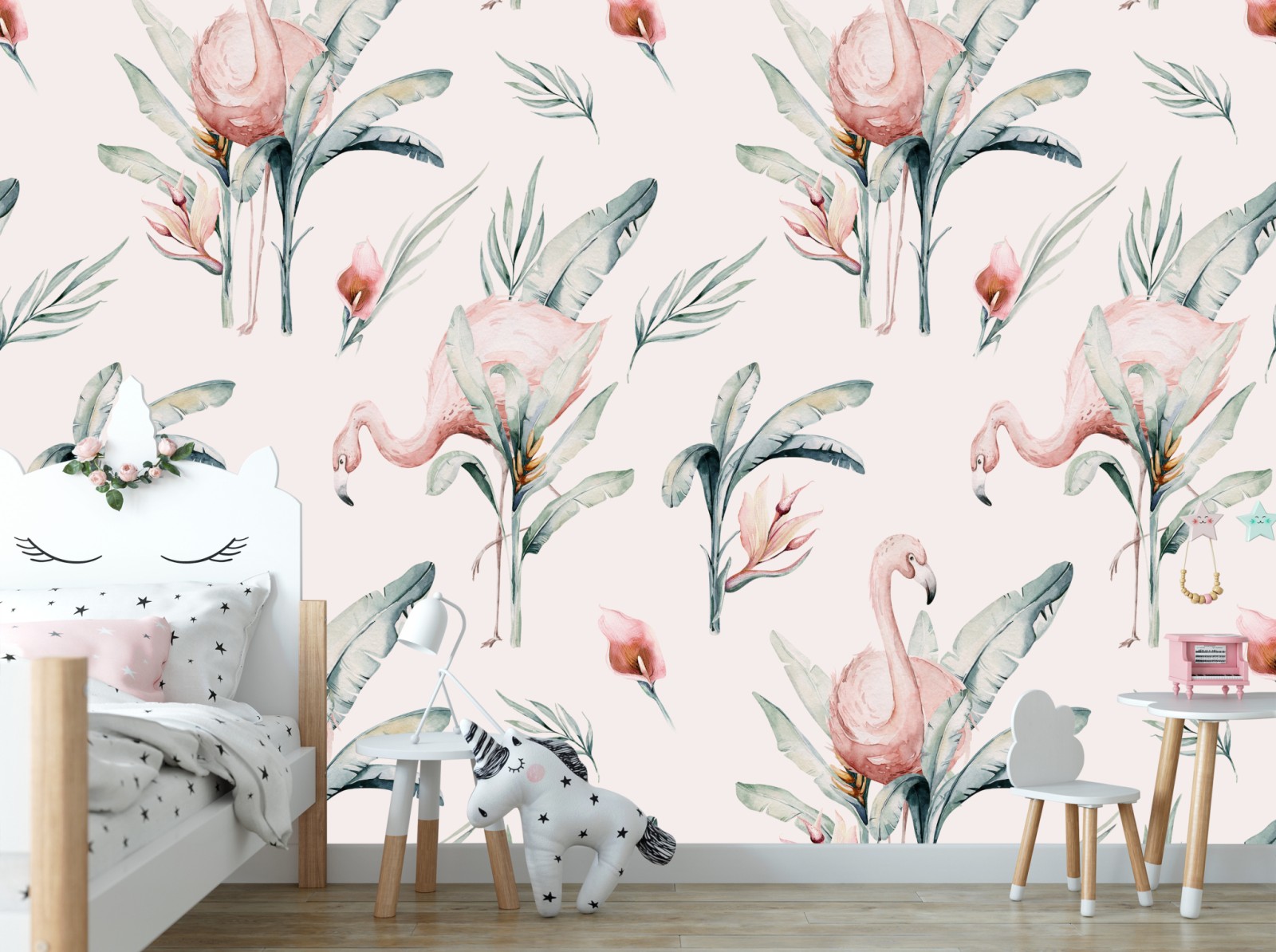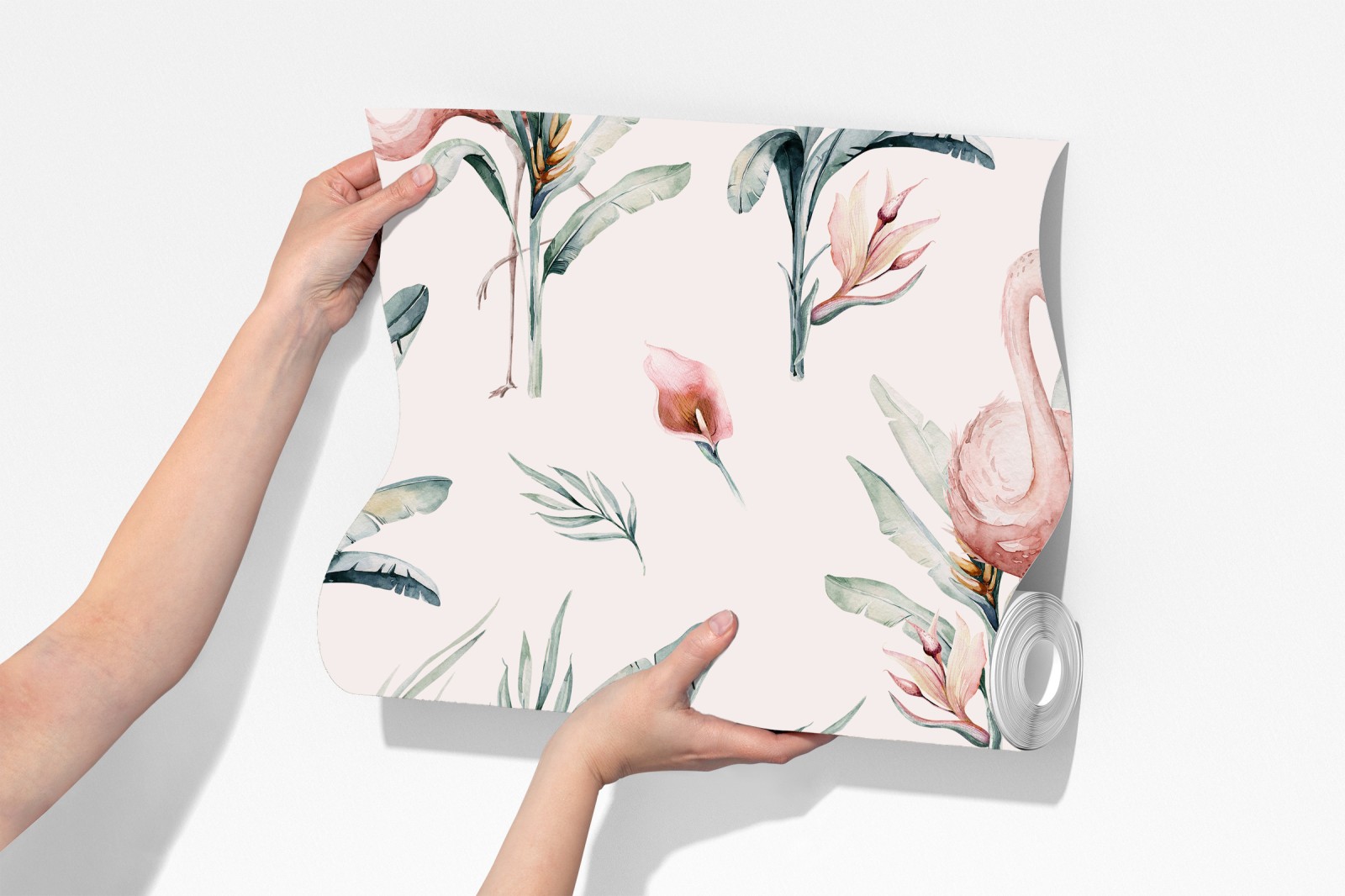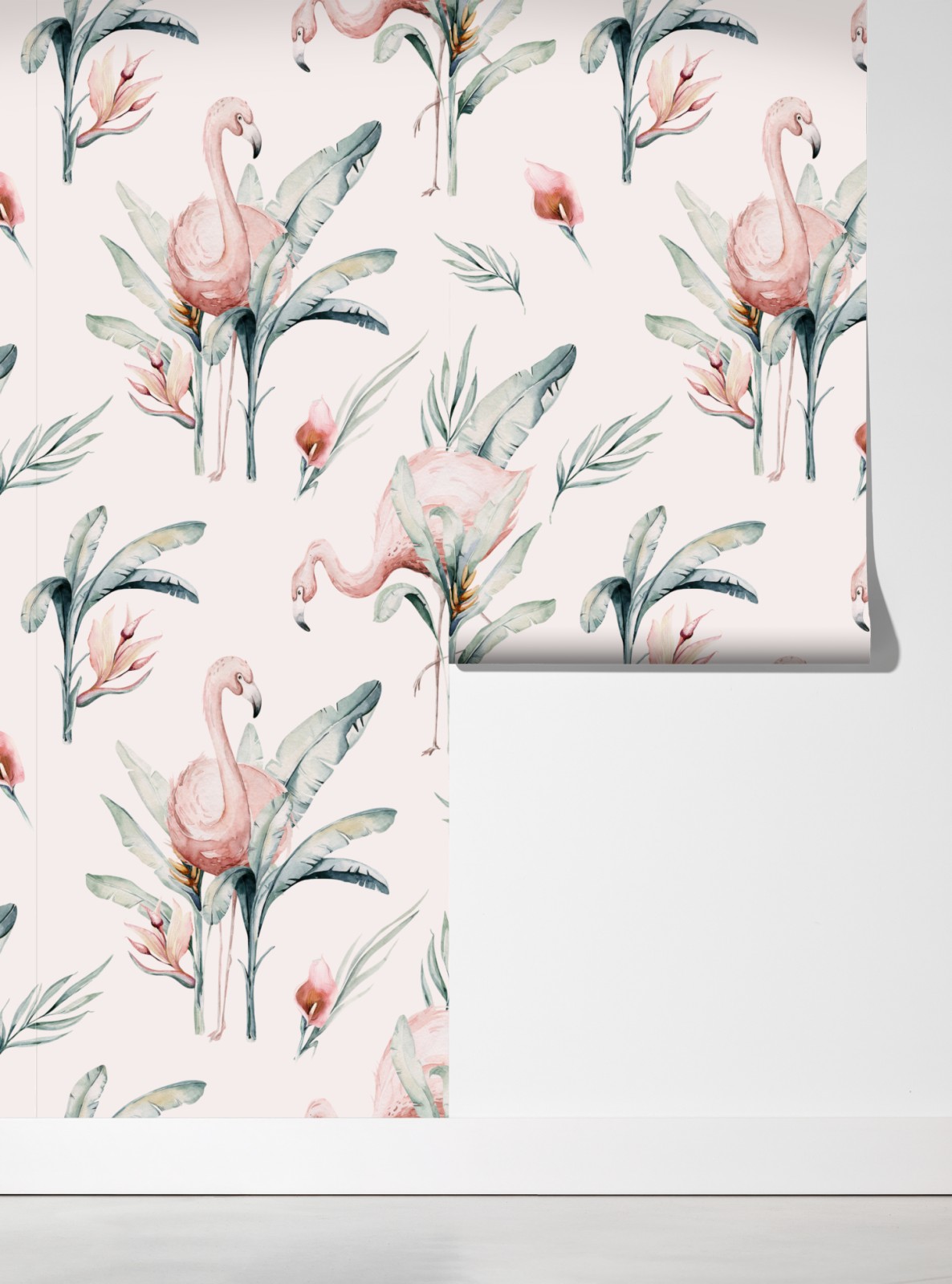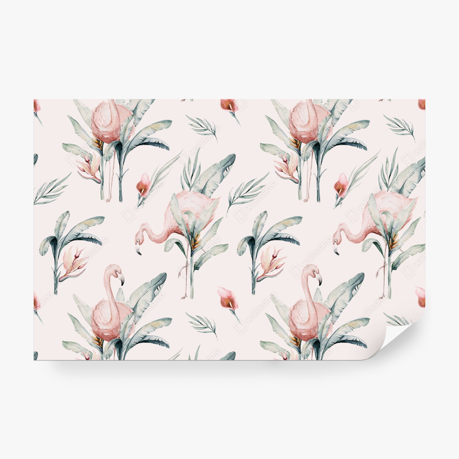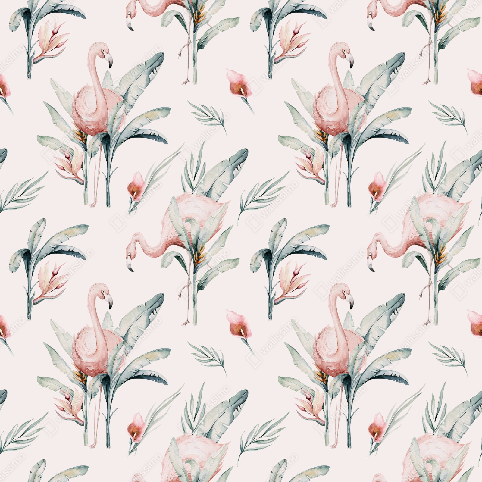 Verleihen Sie jedem Raum einen sanften tropischen Touch mit diesem zarten Aquarell-Flamingo-Muster, das rosa Vögel und üppiges Laub für eine boho-atmosphäre kombiniert.