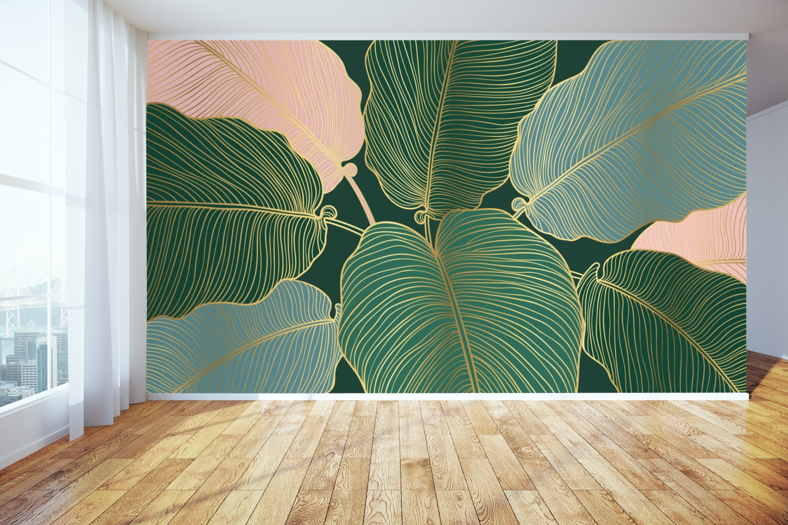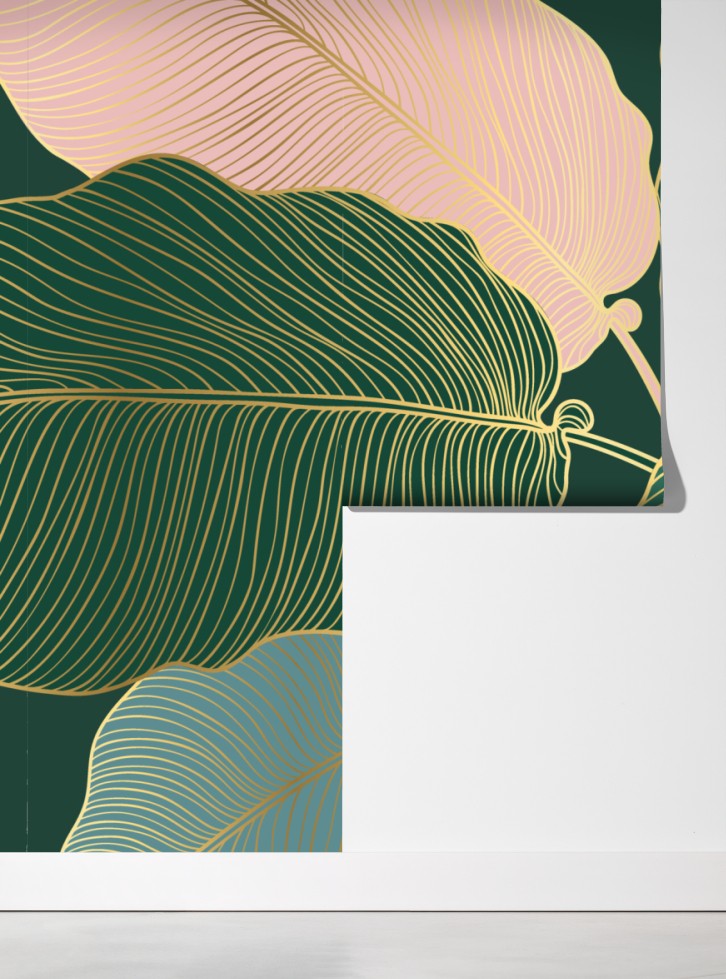 Bringen Sie tropische Eleganz in Ihr Zuhause mit dieser blattillustration mit goldenen Konturen, ideal für moderne Einrichtungen.