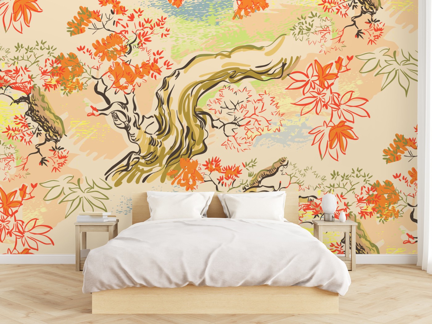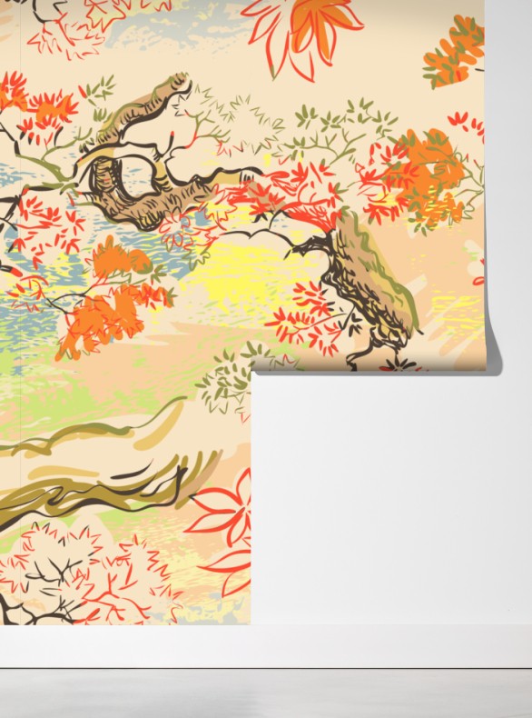 Bringen Sie beruhigende orientalische Atmosphäre in Ihr Zuhause mit diesem pastellfarbenen Muster aus Bäumen und Blättern, ideal für ruhige Wohnräume.