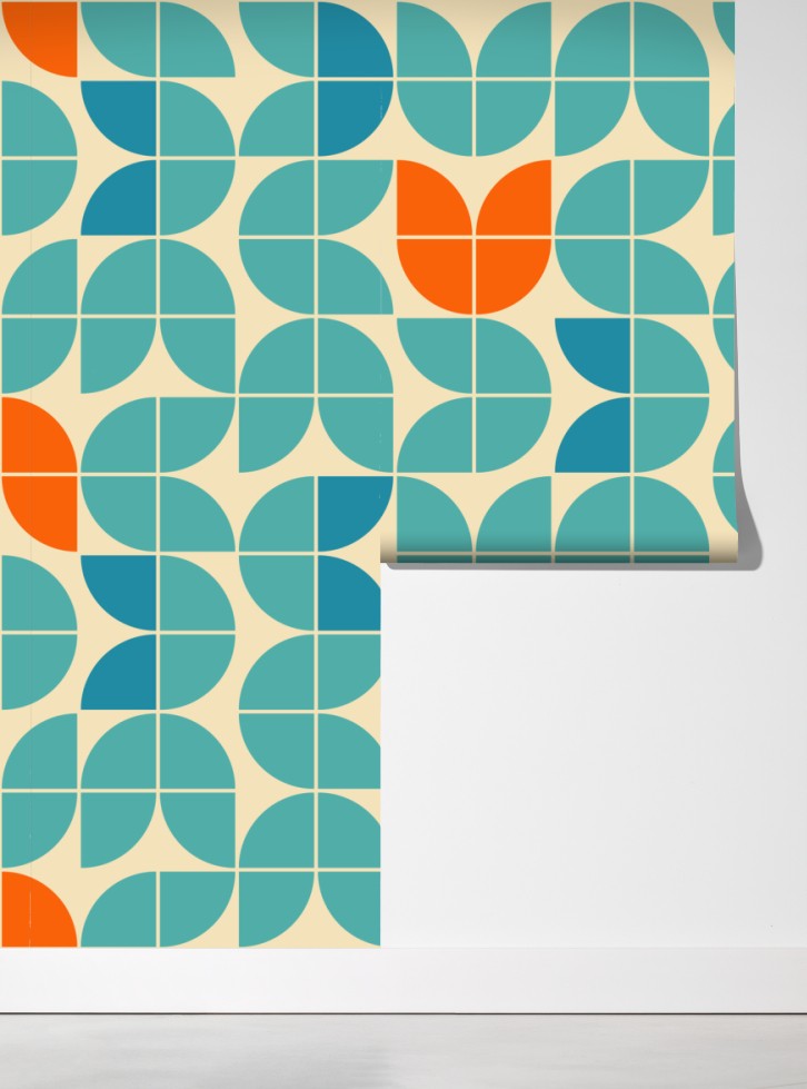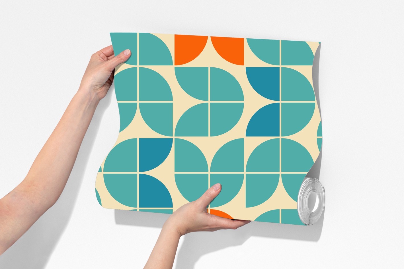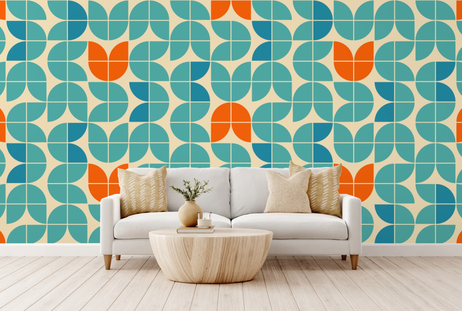 Verleihen Sie Ihrem Raum einen retro-touch mit diesem geometrischen Fliesenmuster in beruhigendem Türkis und lebendigem Orange, ideal für moderne Einrichtungen.