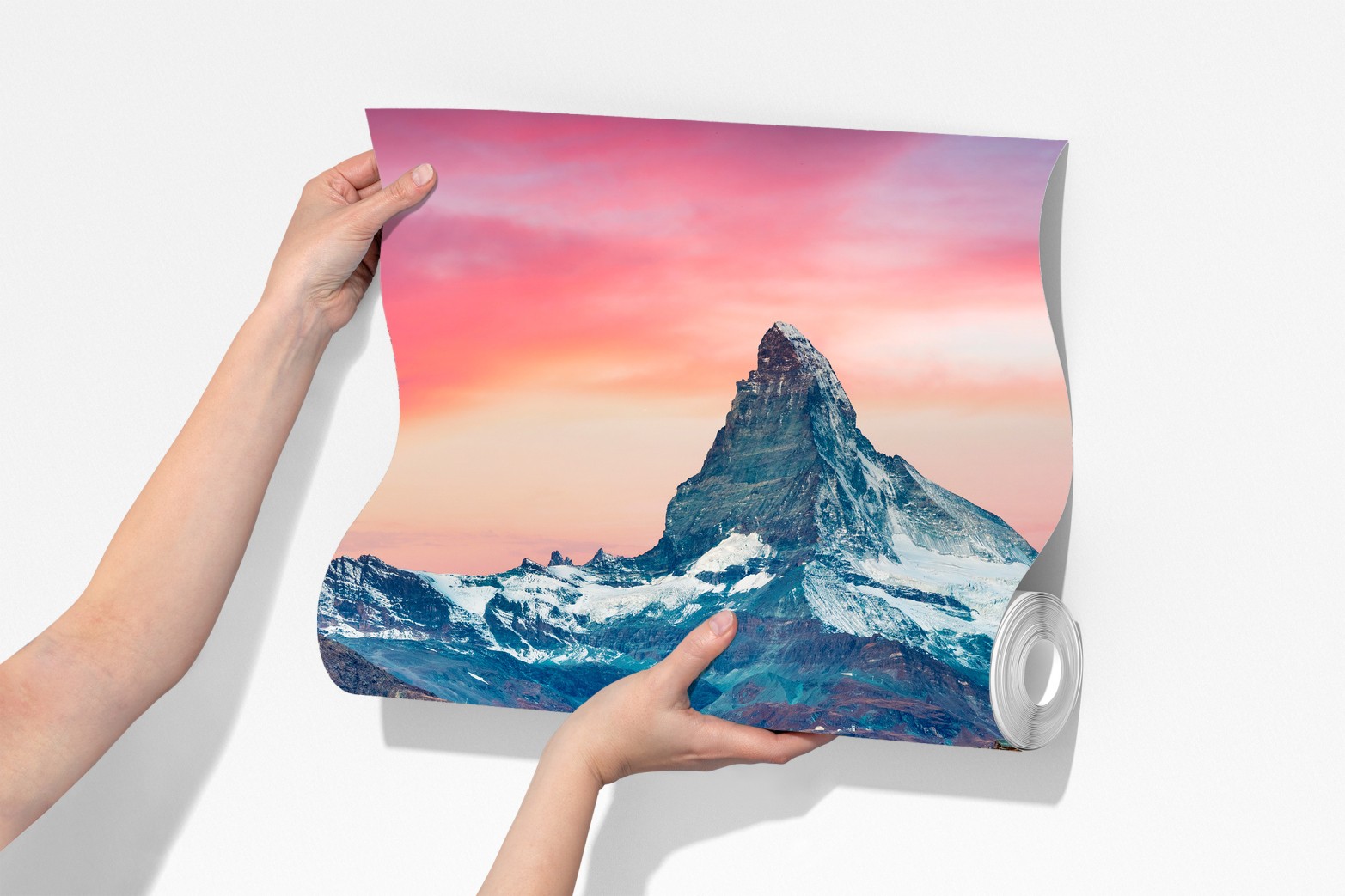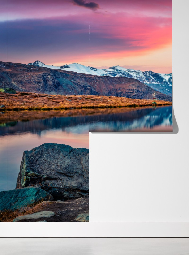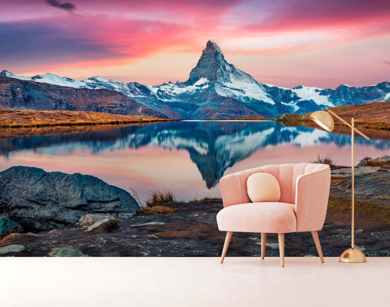 Erleben Sie die ruhige Spiegelung des Matterhorns im Stellisee bei Sonnenaufgang und verleihen Sie Ihrem Raum alpine Atmosphäre.