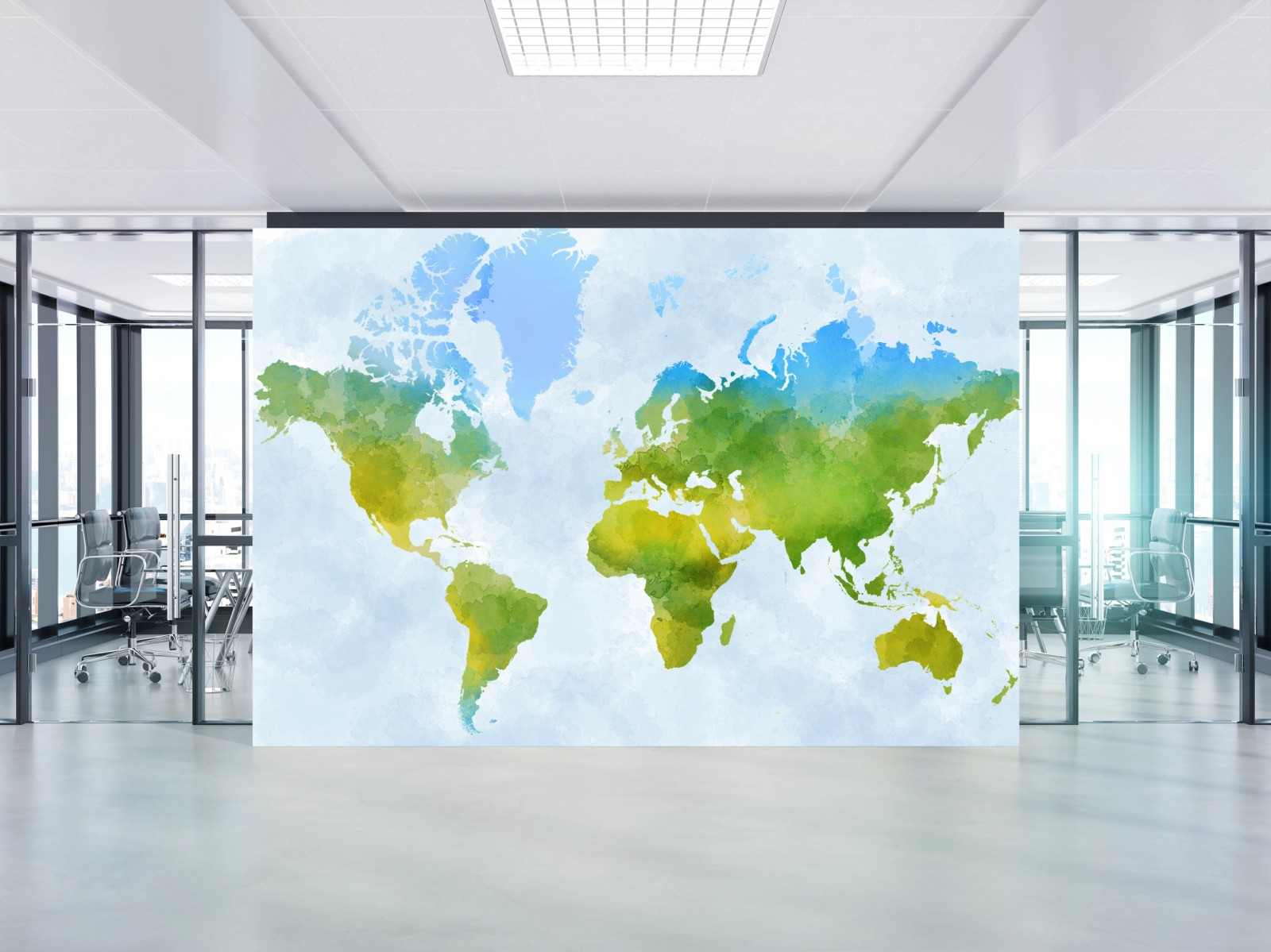 Sanfte Aquarell-Weltkarte in grünen und blauen Tönen, die jedem Raum eine künstlerische, moderne Note verleiht und Reisefreunde inspiriert.MehrWeniger
