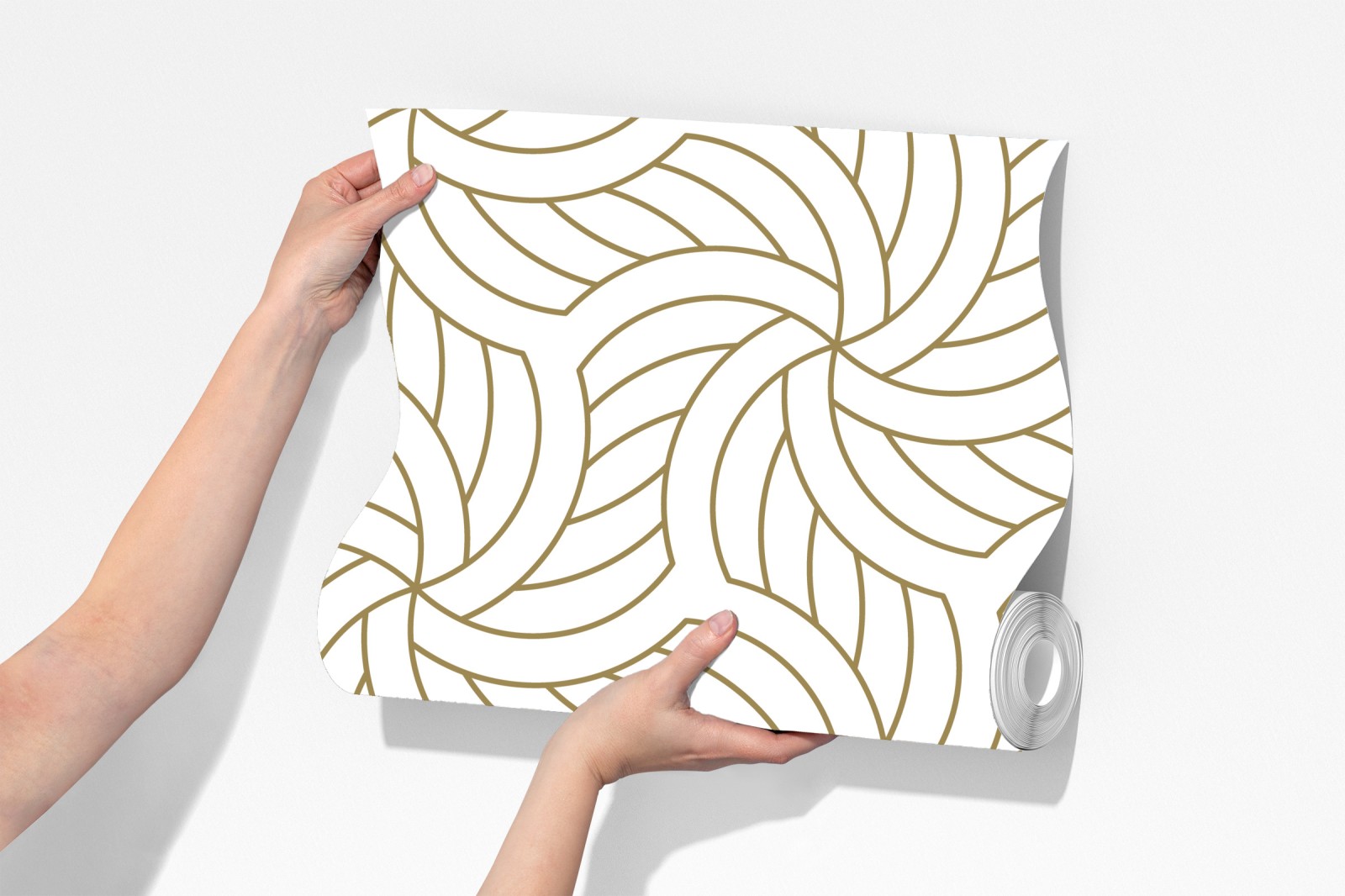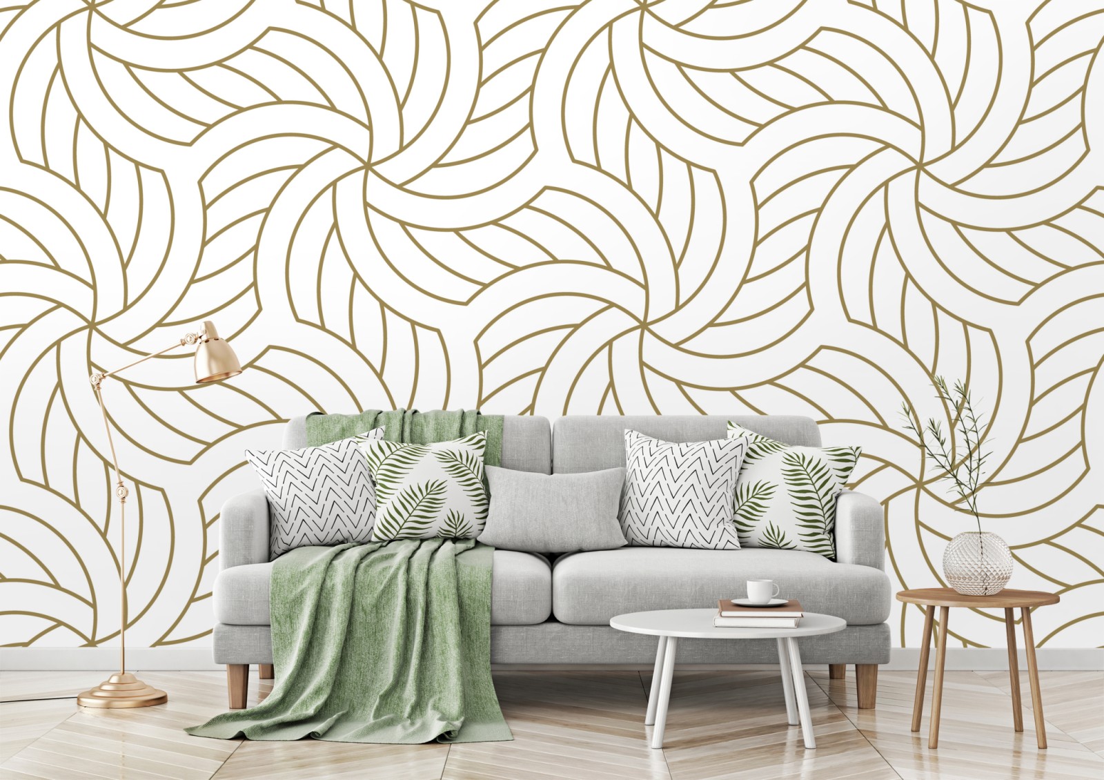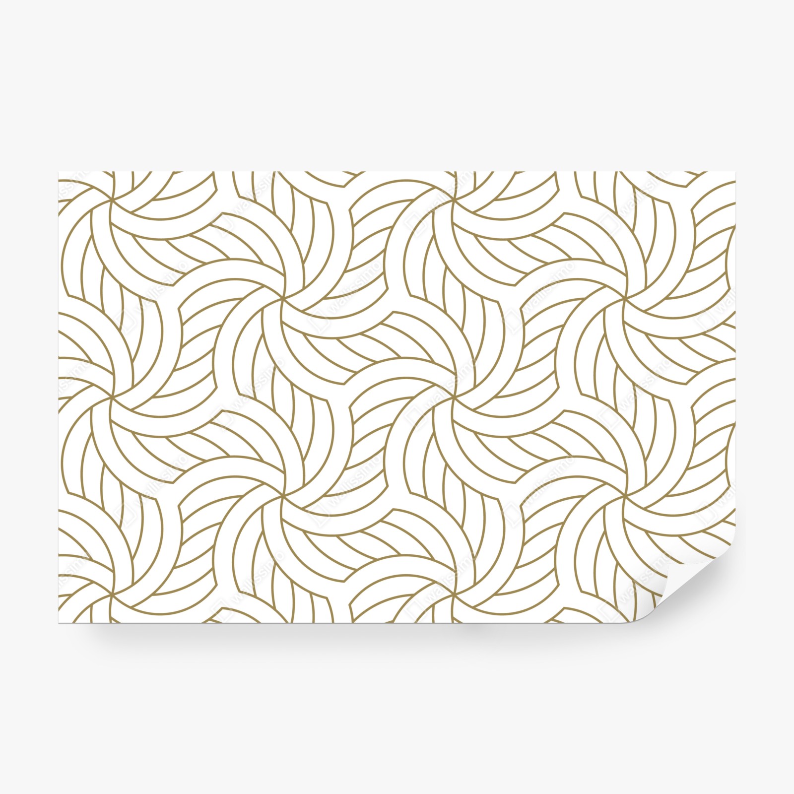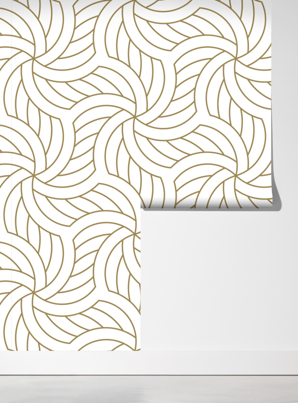 Verleihen Sie Ihrem Raum einen Hauch von Luxus mit einem goldenen geometrischen Wirbelmuster im Art-Deco-Stil, ideal für stilvolle Wände.