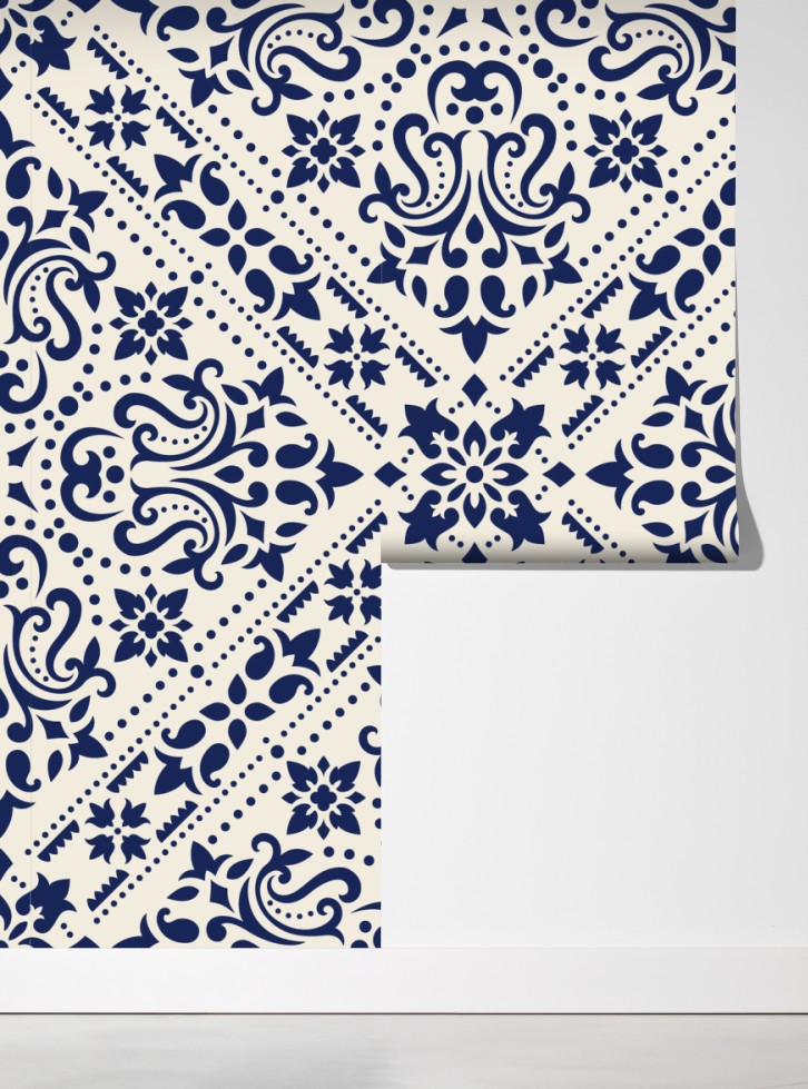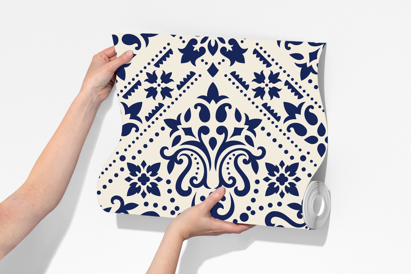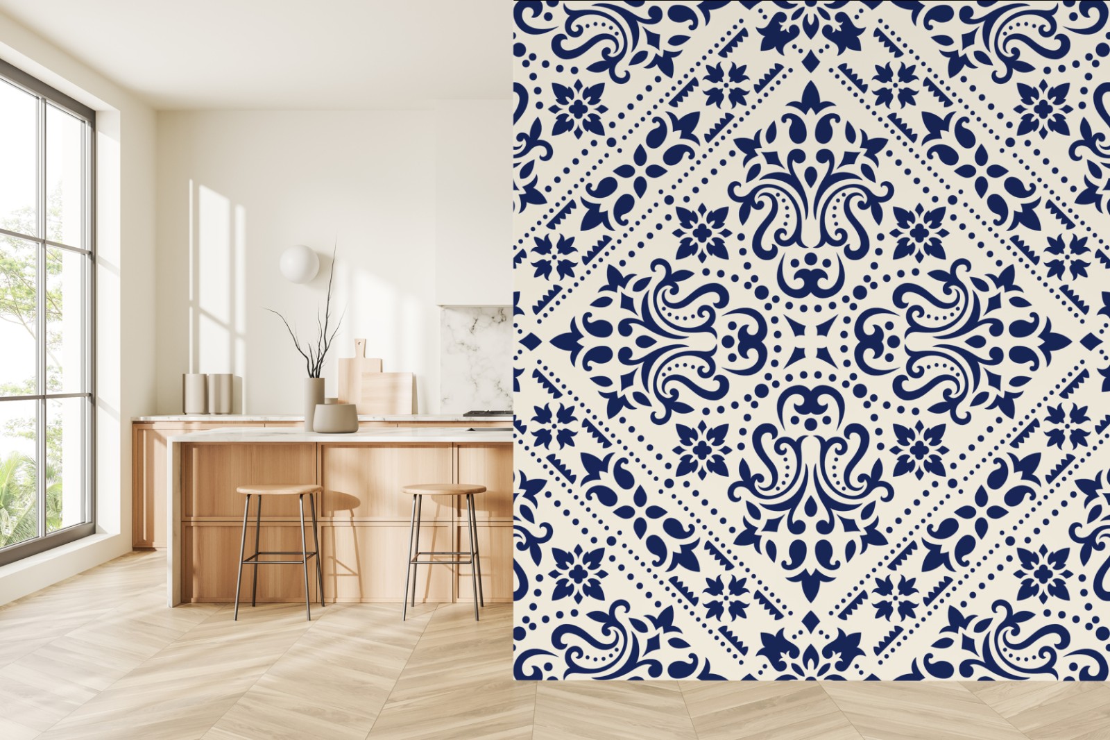 Verwandeln Sie Ihr Zuhause mit einem zeitlosen marineblauen Damast-Fliesenmuster, das Vintage-Charme und mediterrane Note vereint.